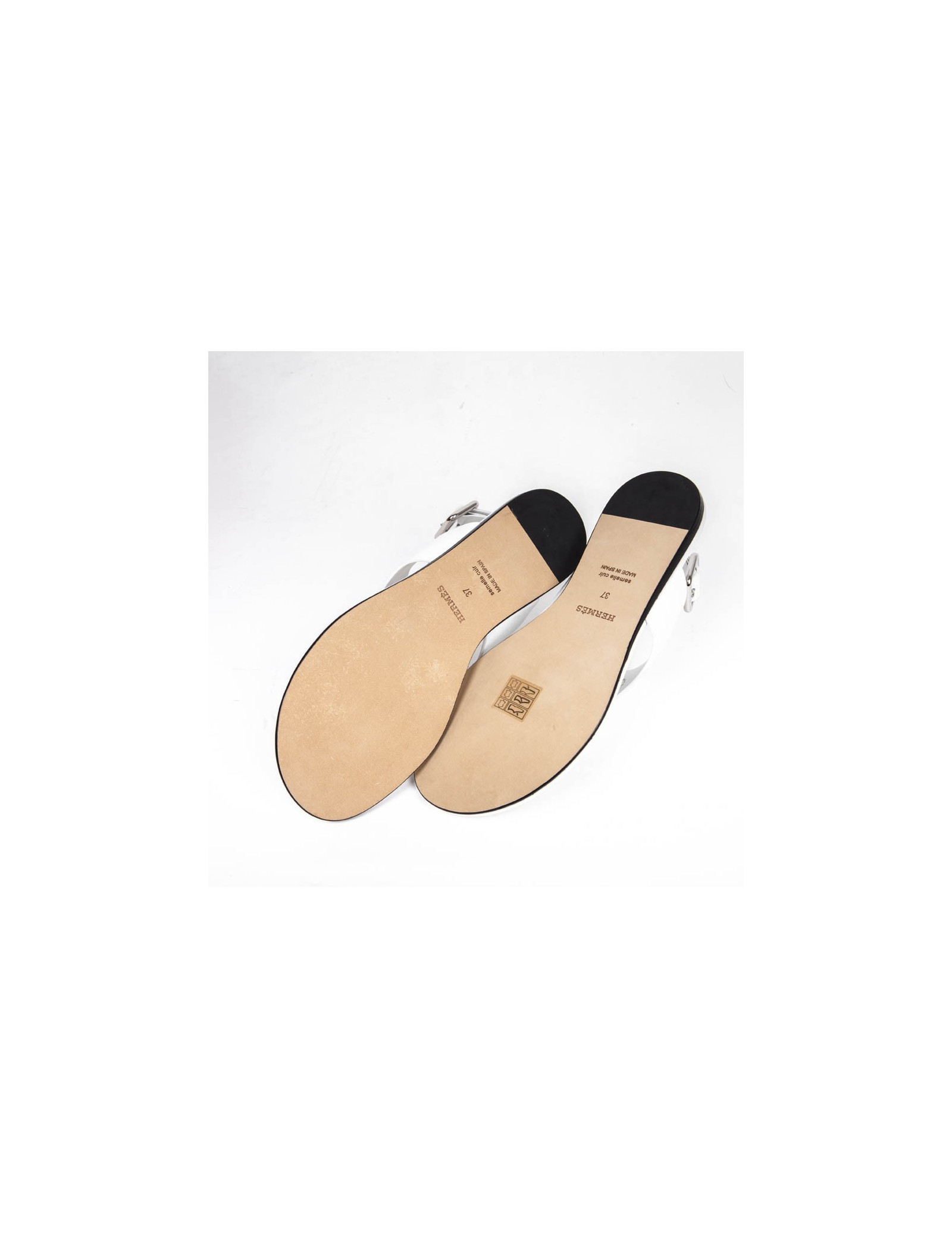 Sandales "Kola" plates Hermès taille 37 UE en cuir de veau blanc. Elles ont un H perforé sur l'avant. Lettre X dans un carré? (sous le H sur la chaussure droite). Etat neuf?. Fabriquées en Espagne.