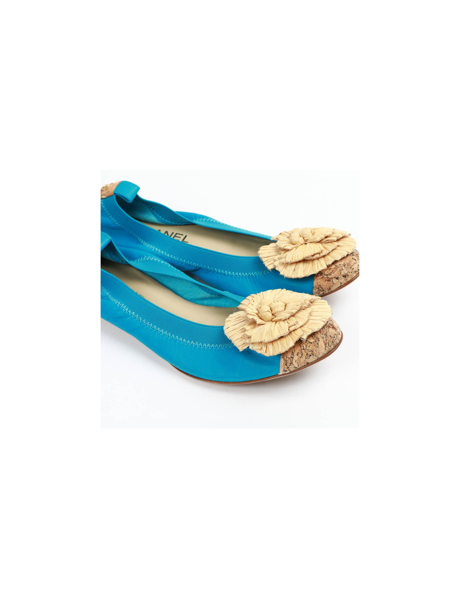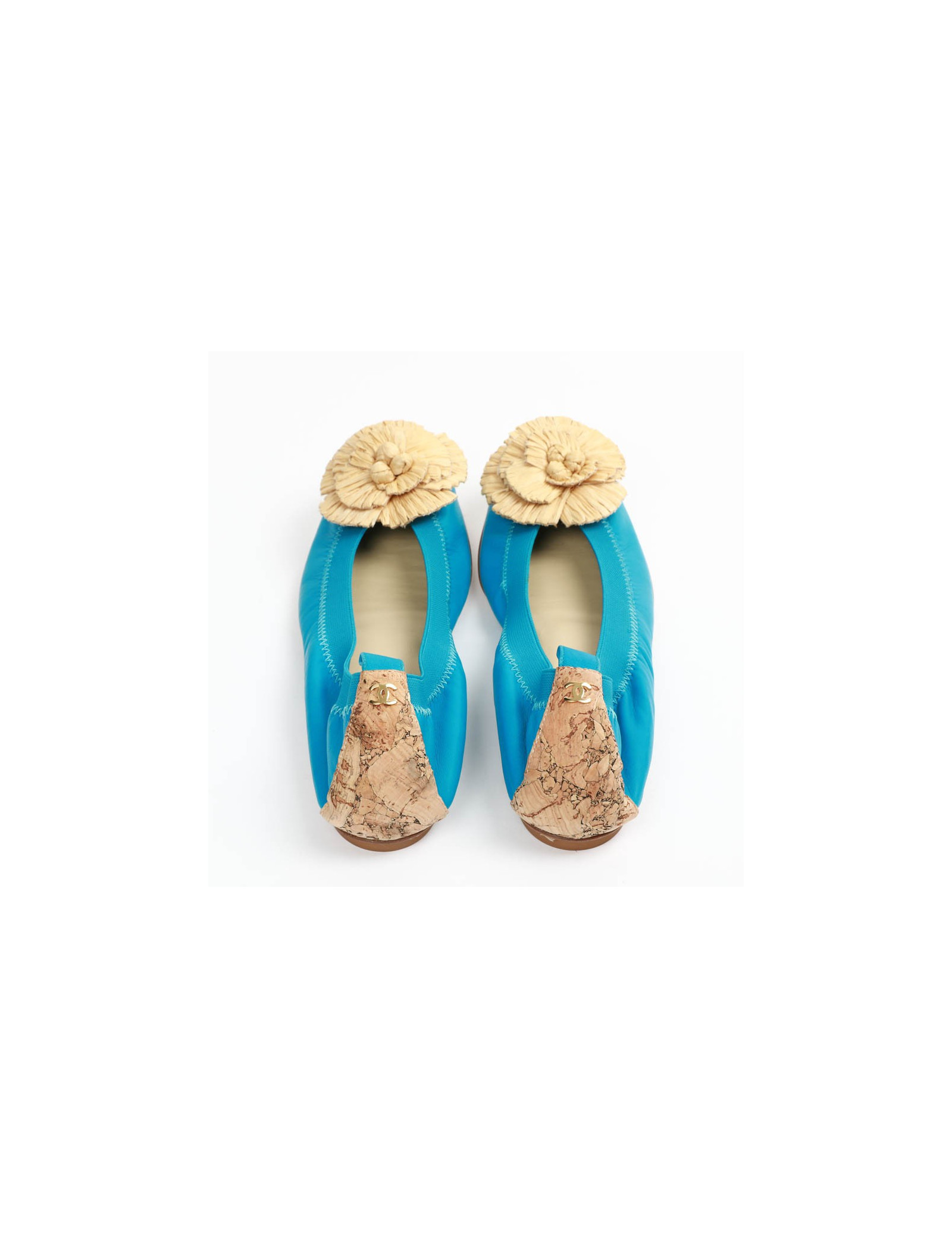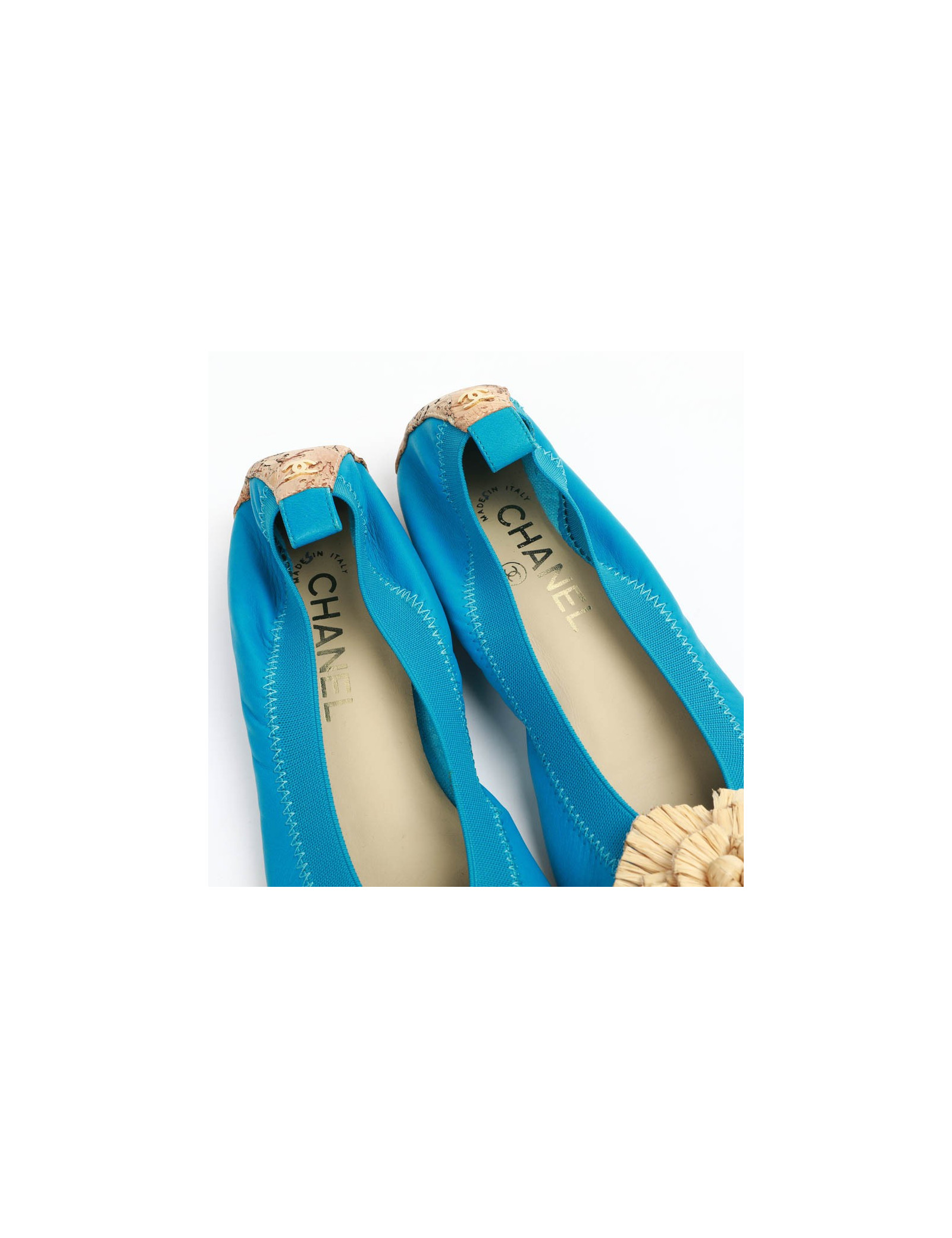 Elles sont en cuir d'agneau bleu électrique. L'arrière et l'avant sont en liège. Une grosse fleur en paille se trouve à l'avant.