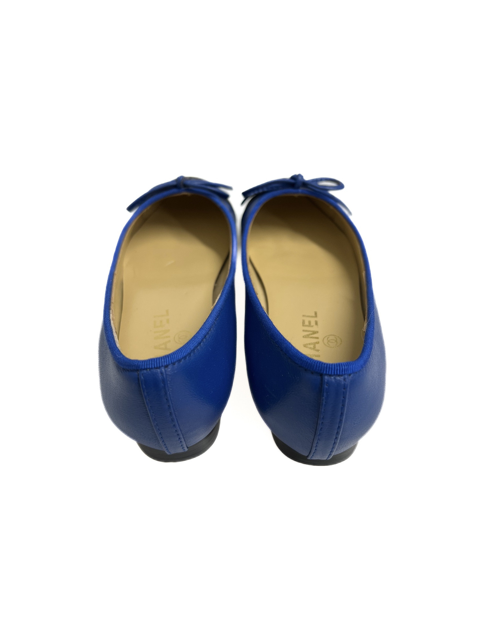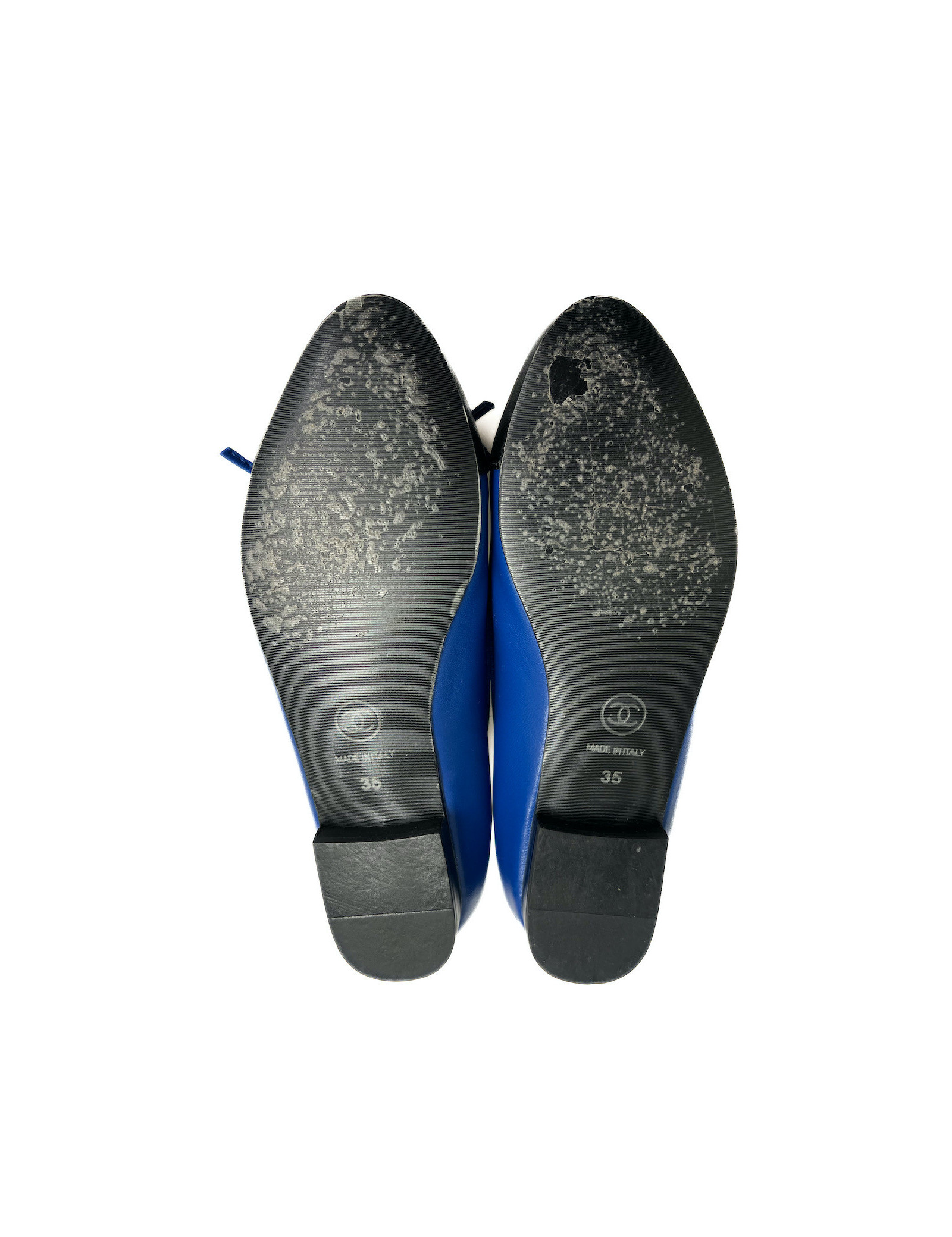 Détails : logo CC embossé à l'avant des ballerines et noeud en cuir bleu électrique. Très légères marques d'usure peu visibles sur le cuir ; plastique protecteur présent sous la semelle