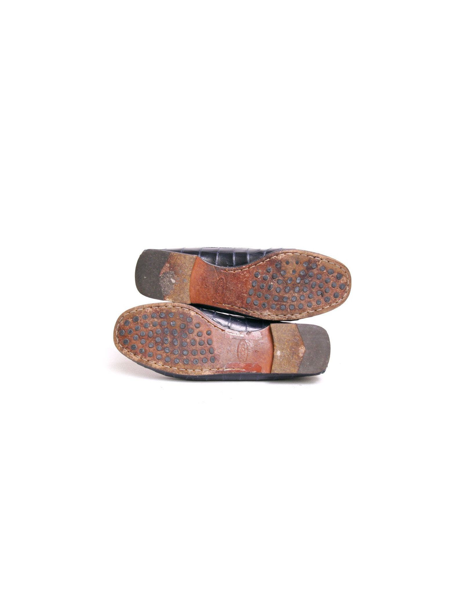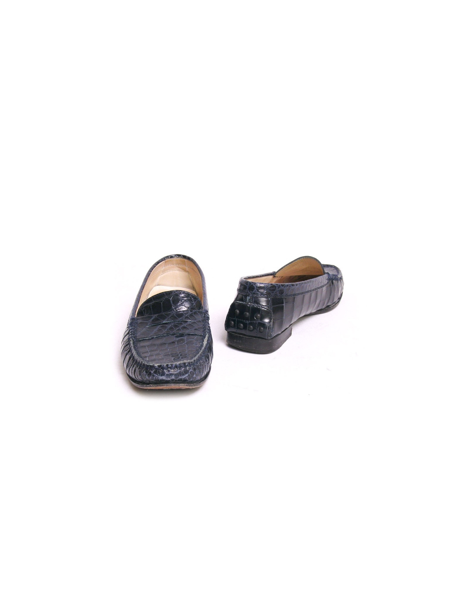 Superbe paire de mocassins Tod's en crocodile de couleur bleu marine. Taille 38. Des picots en caoutchouc se trouvent à l'arrière ainsi que sous la semelle de la chaussure, un signe distinctif de la marque.