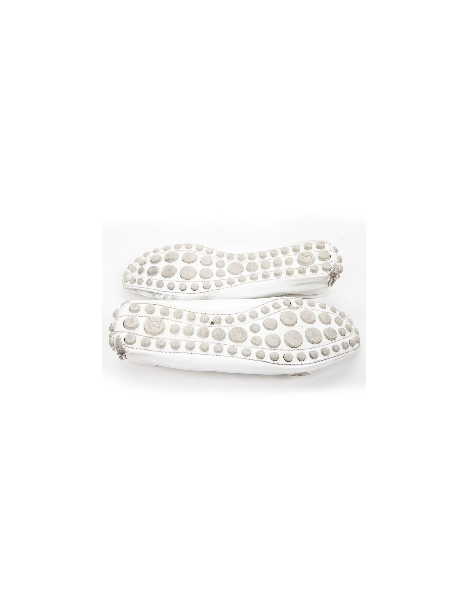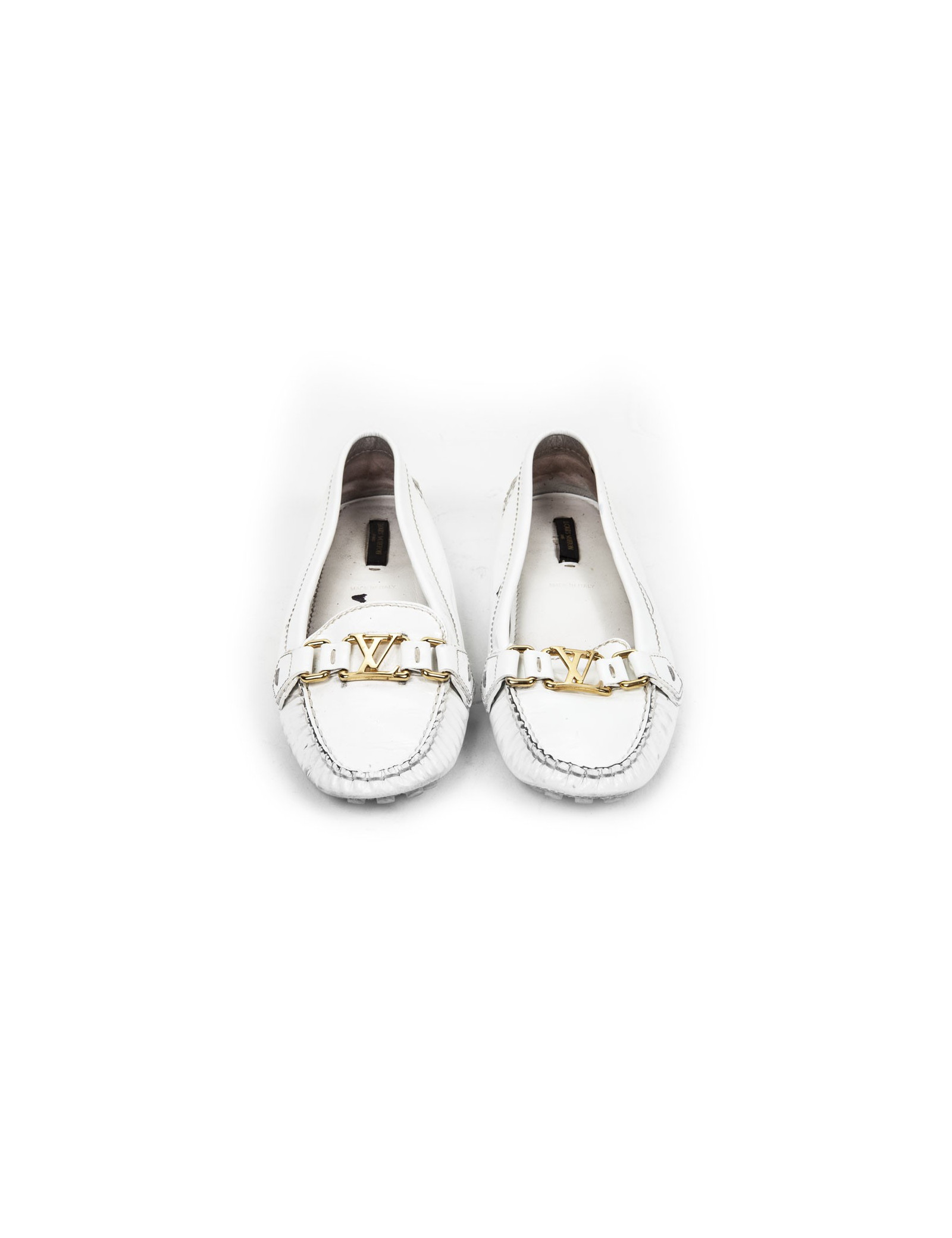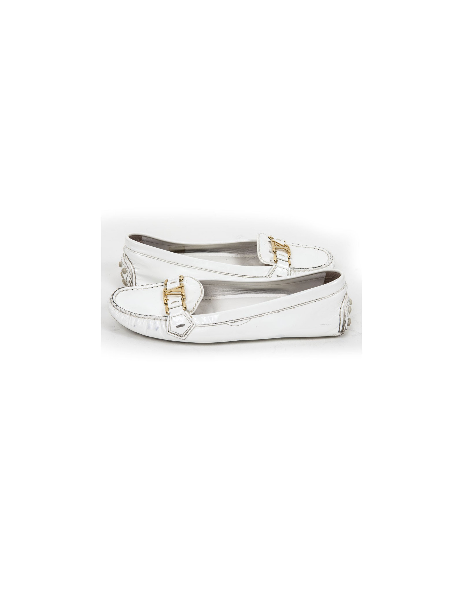 Mocassins de la Maison Louis Vuitton en cuir verni blanc. La bijouterie 'LV' à l'avant de la chaussure est en métal doré.