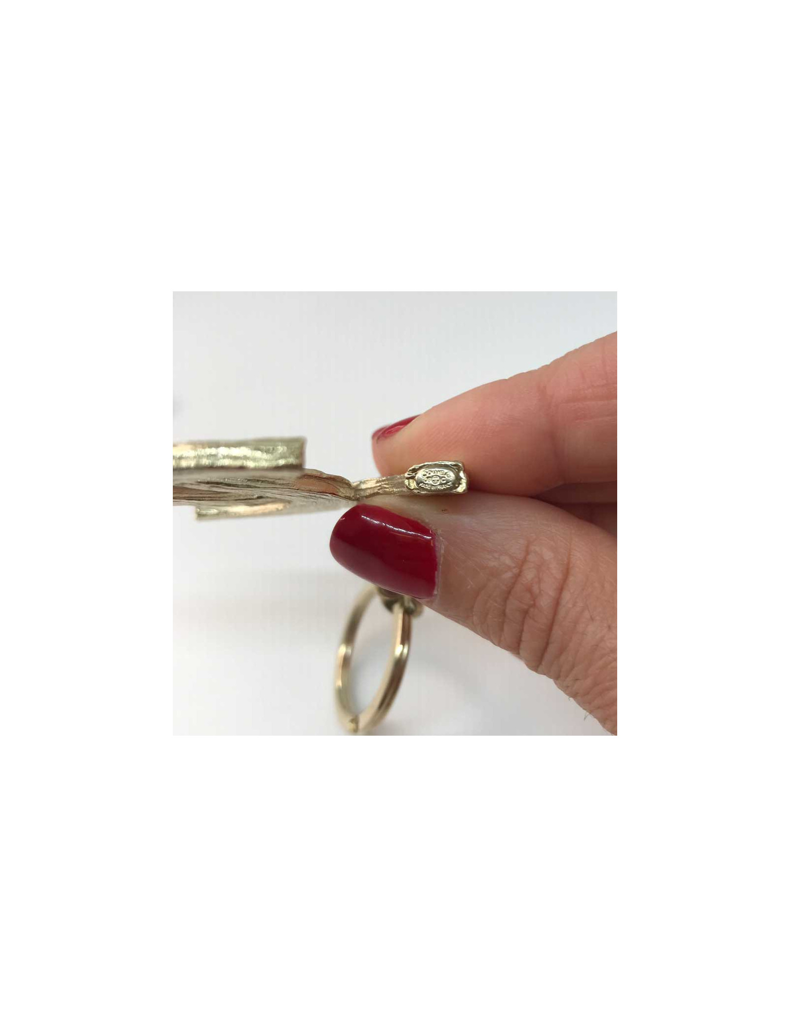 Voici ses dimensions : il a une longueur totale de 9.5 cm. Le CC a une taille de 6 x 4.5 cm. Le porte-clef pèse 28 grammes. Ce porte-clés est en métal doré à l’or fin.