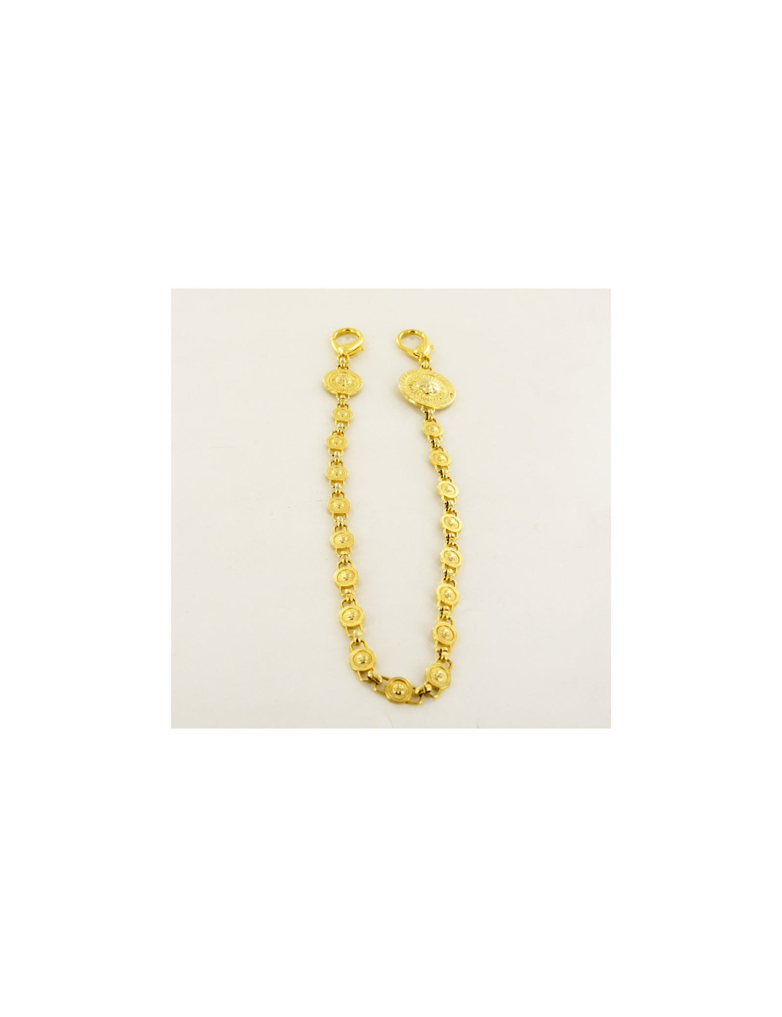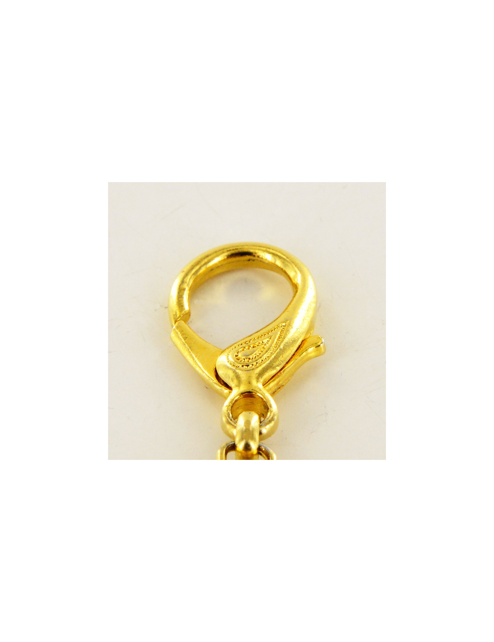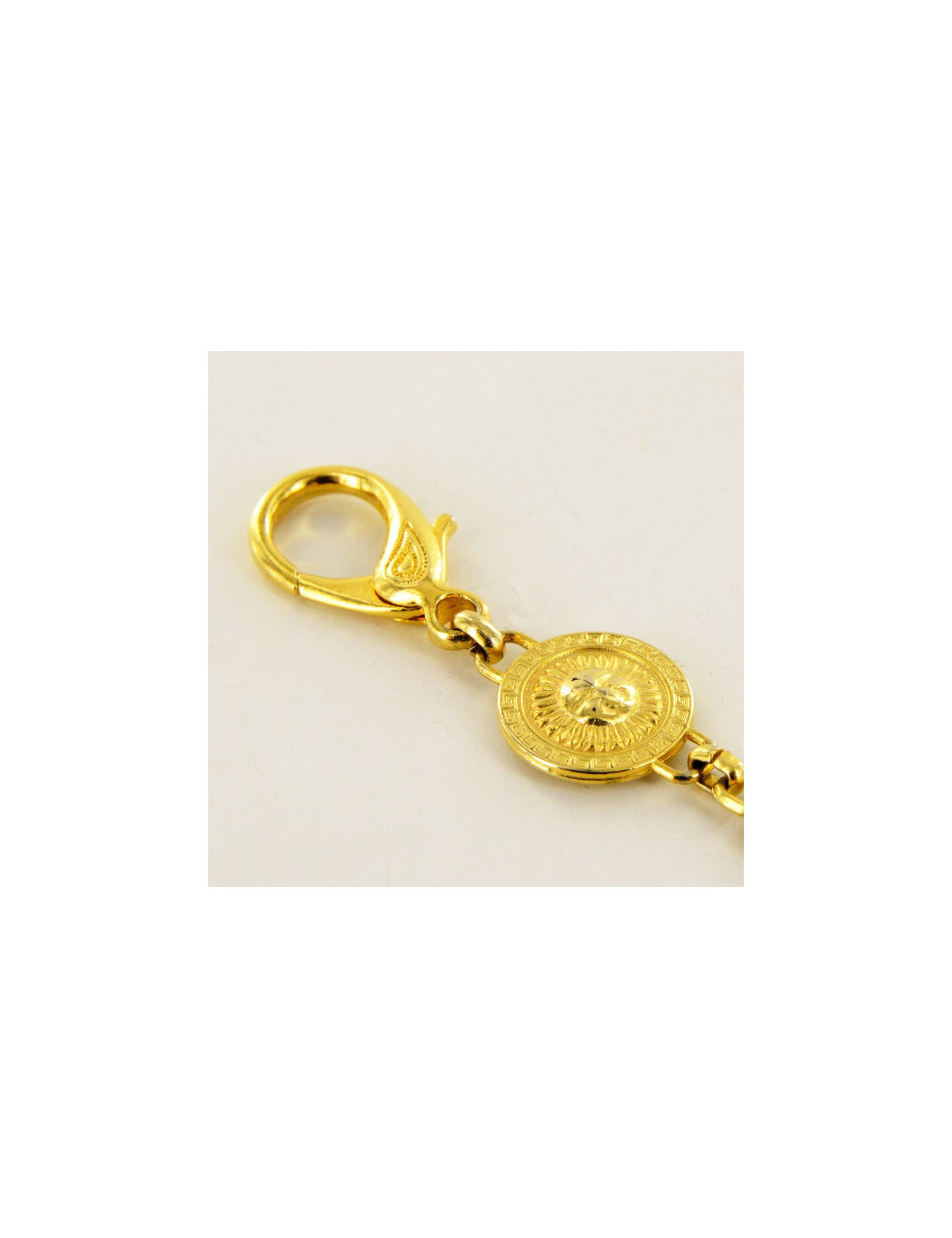 Bijou de sac Versace, chaîne qui comporte 19 maillons en métal doré, grâce à ses deux fermoirs mousqueton, vous aurez la possibilité d'accrocher le bijou où bon vous semble, sacs, ceintures ou colliers. Livré dans une petite boîte noire.