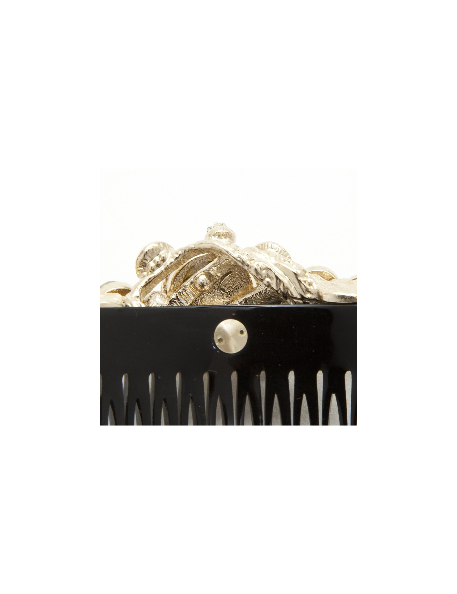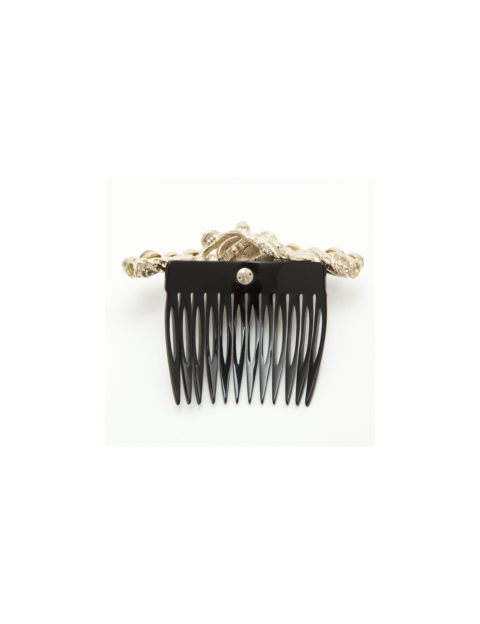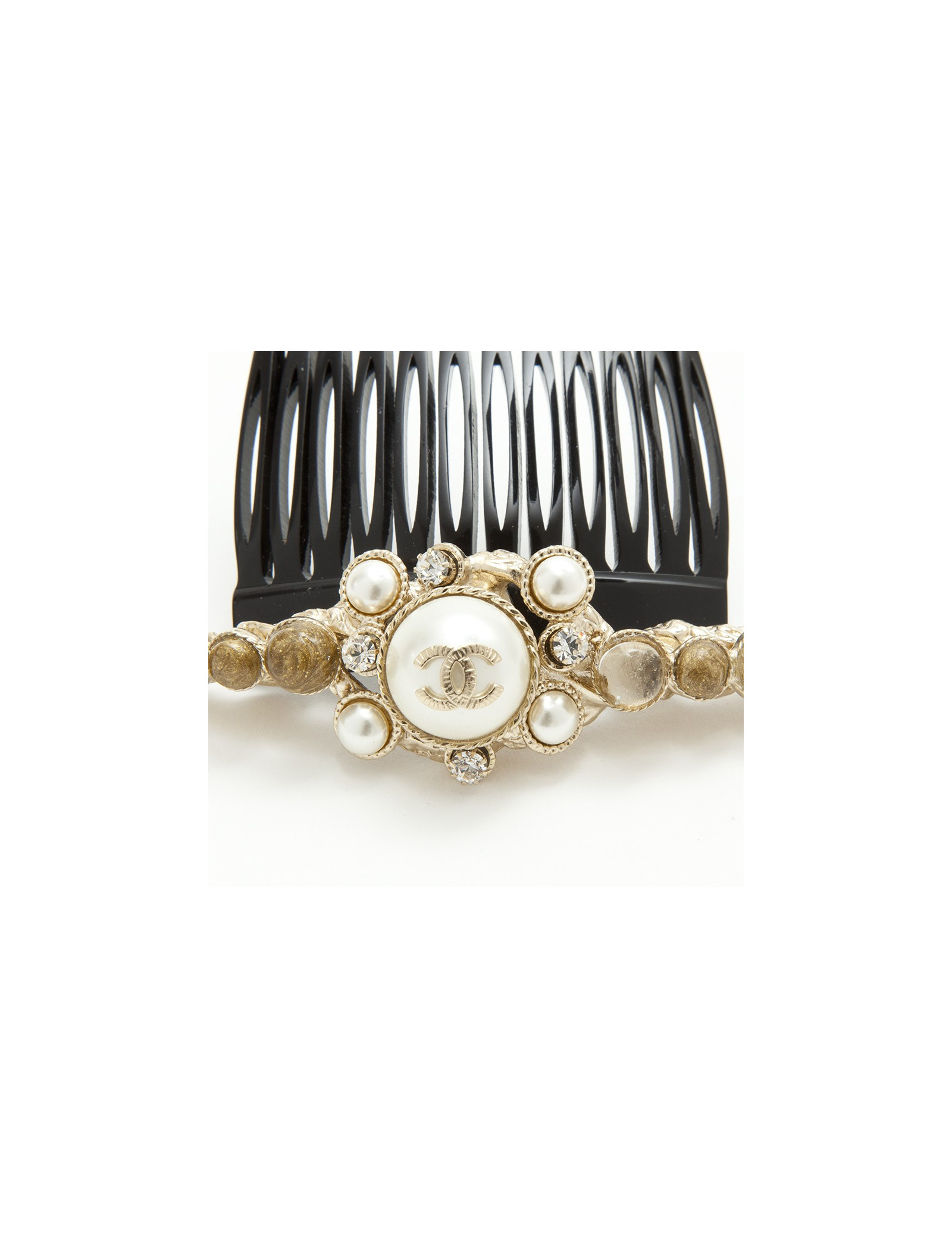 Peigne Chanel, surmonté d'un élément esprit broche perlée, et sertie de perles en résine cristal et or.
