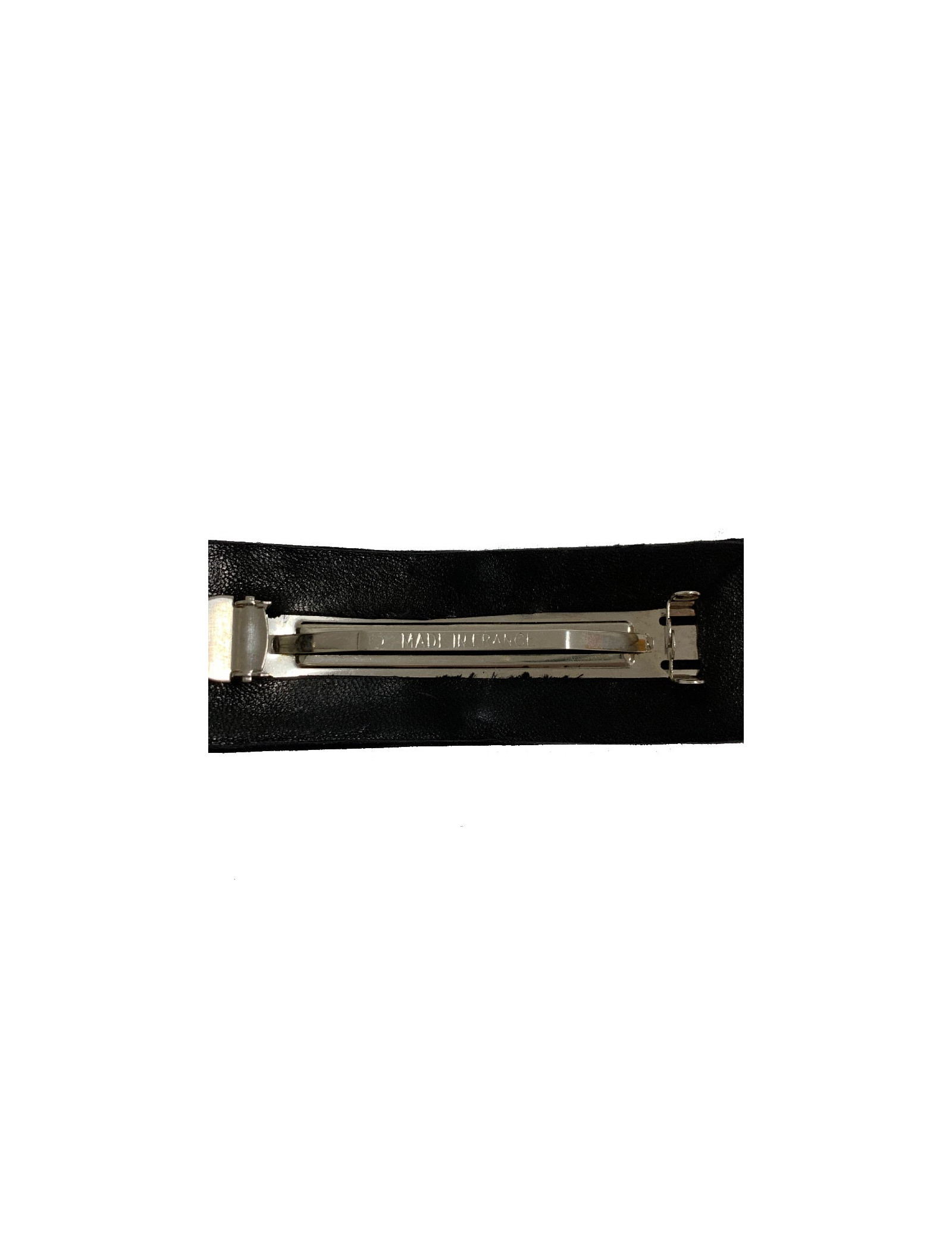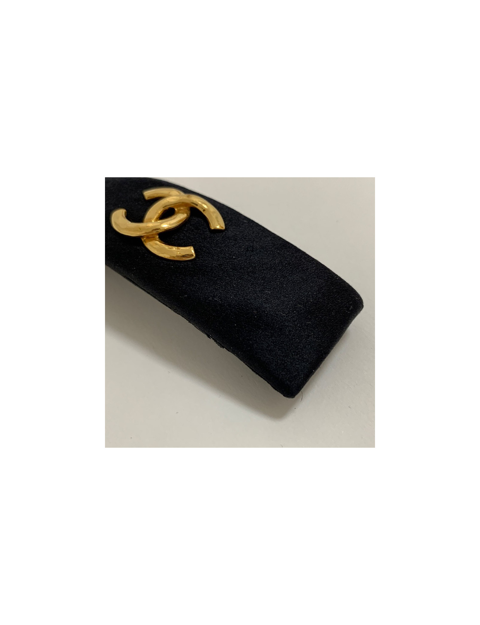 Elégante barrette CHANEL CC en satin noir sur le dessus, un CC doré. Le dos de la barrette est en cuir noir. Le système de fermeture fonctionne très bien et vous permettra d'attacher vos cheveux avec élégance.