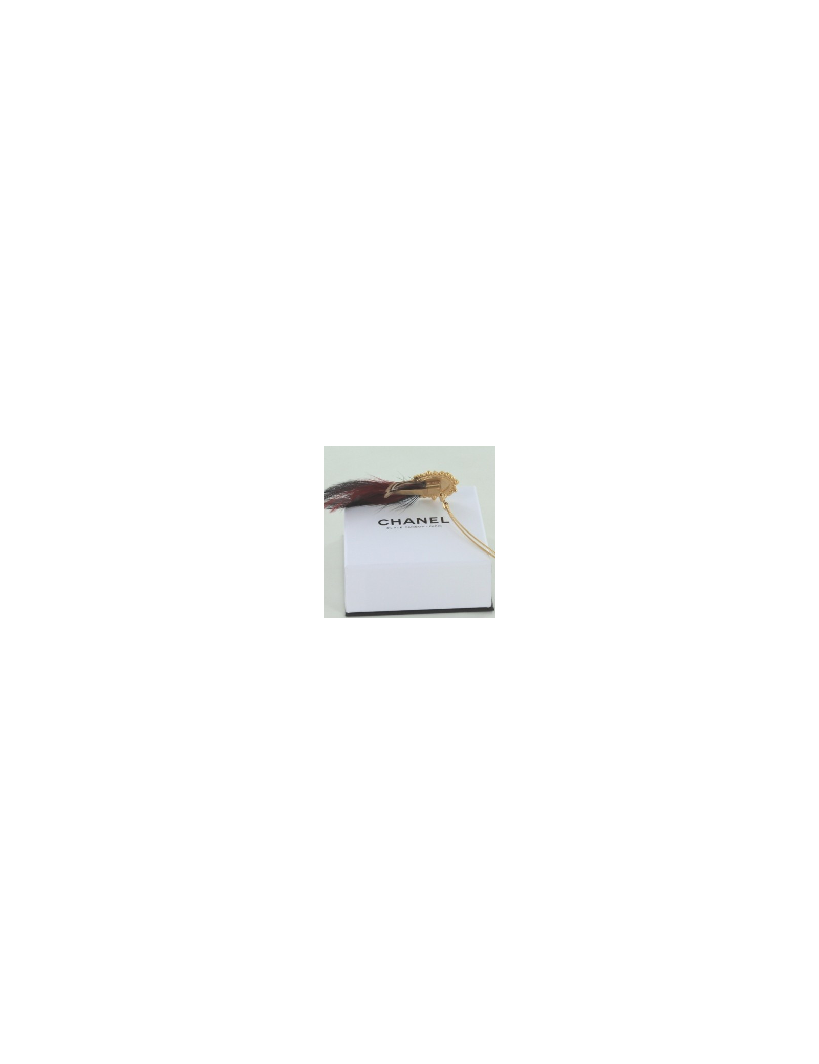 le bijou est agrémenté de plumes multicolores. Il y a un double" C" au milieu du bijou ainsi que des brillants tout autour