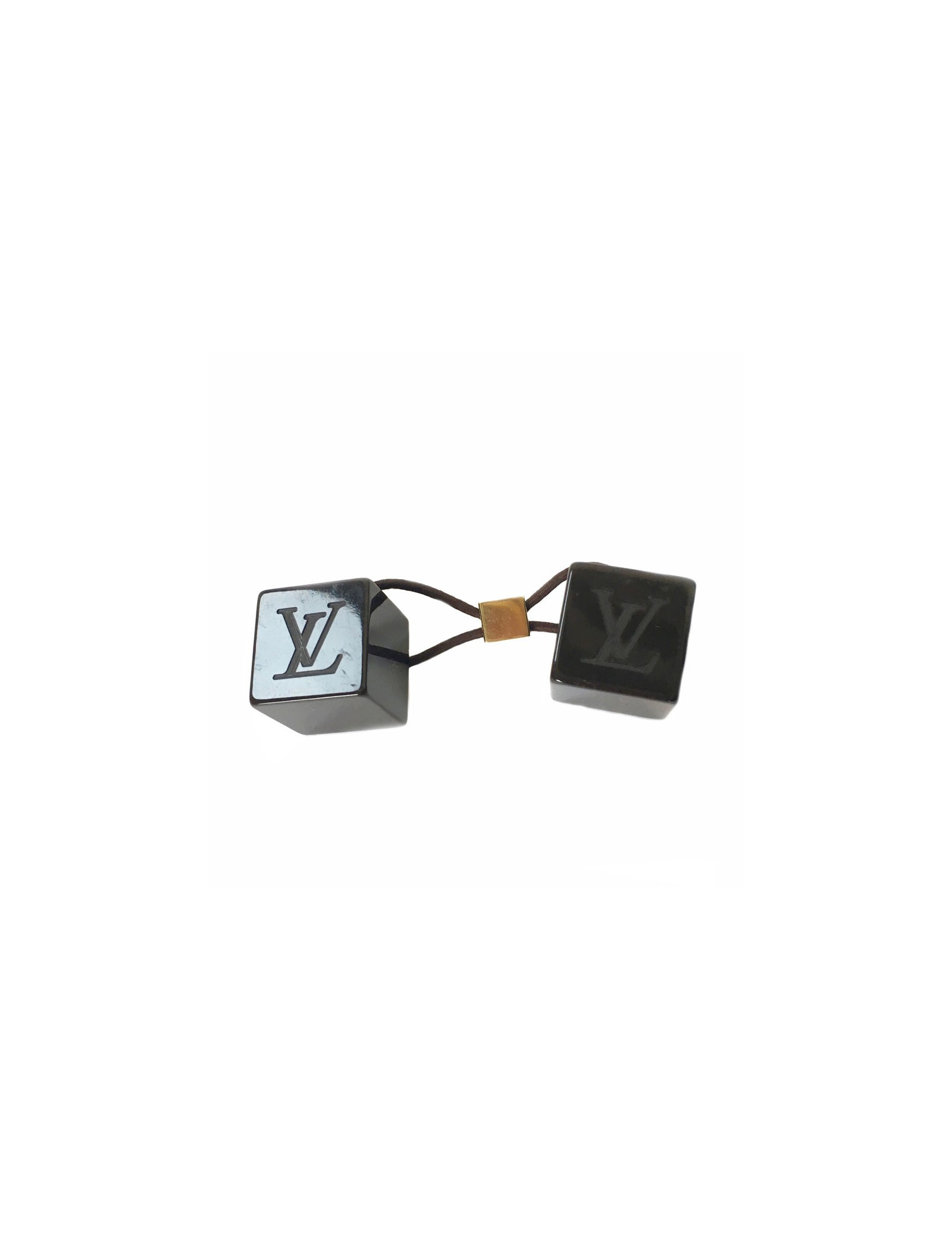 Elastique marron et 2 cubes marrons. Initiales de la marque inscrite sur chacun des cubes.