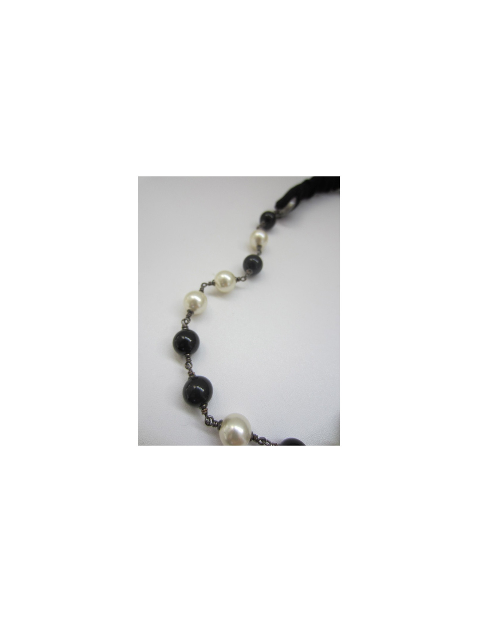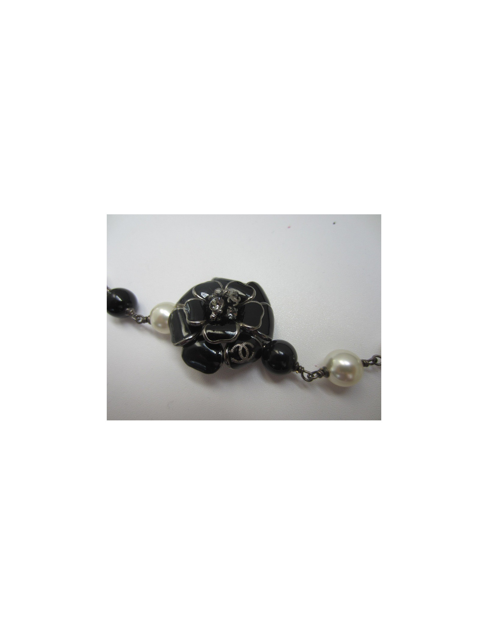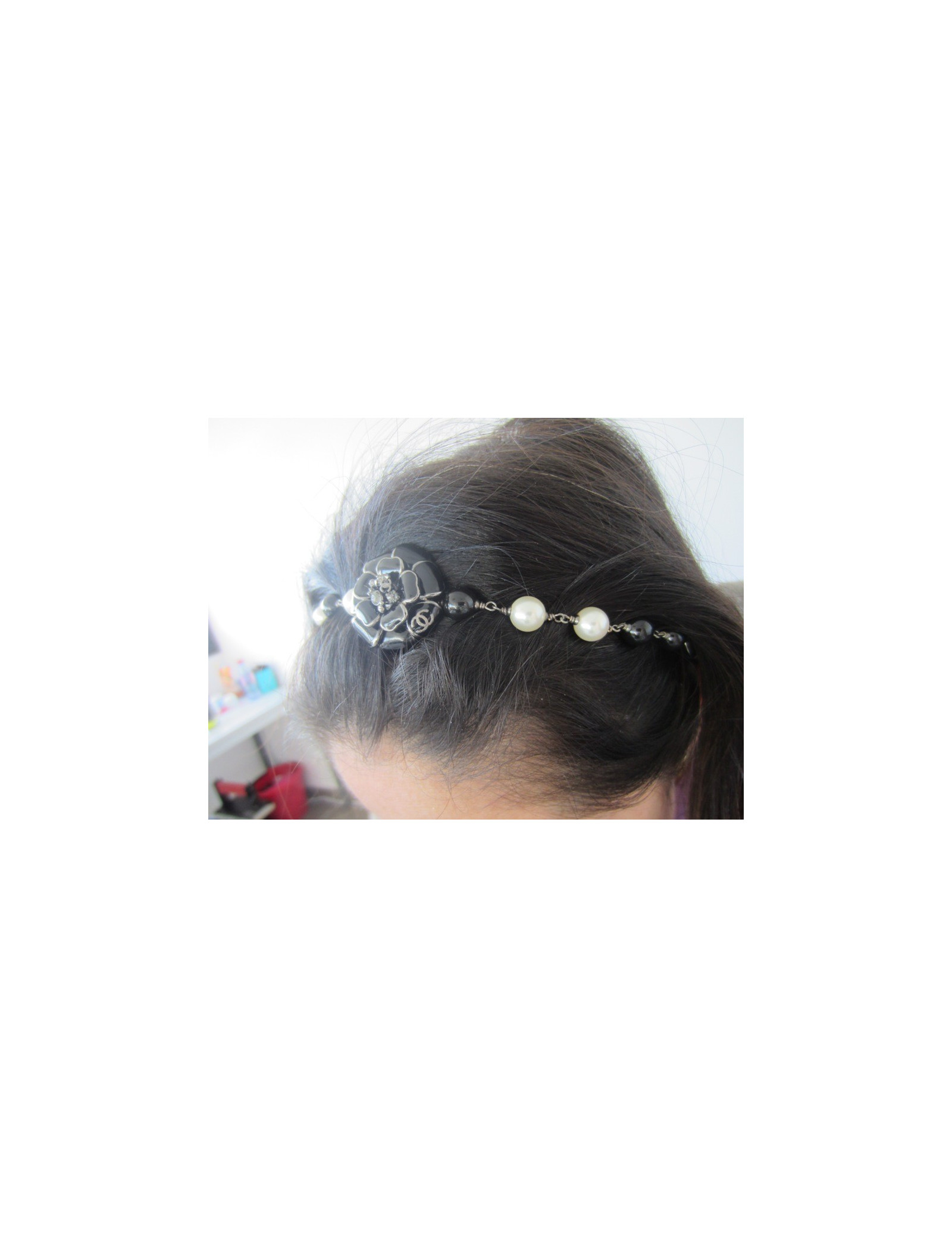 LE serre-tête emblématique CHANEL en pâte de verre : le célèbre camélia avec des strass noirs en son coeur monté sur argent noir (ruthénium) avec un CC, pourtour paré de perles nacrées et de perles noires. Élastique recouvert de tissu noir.