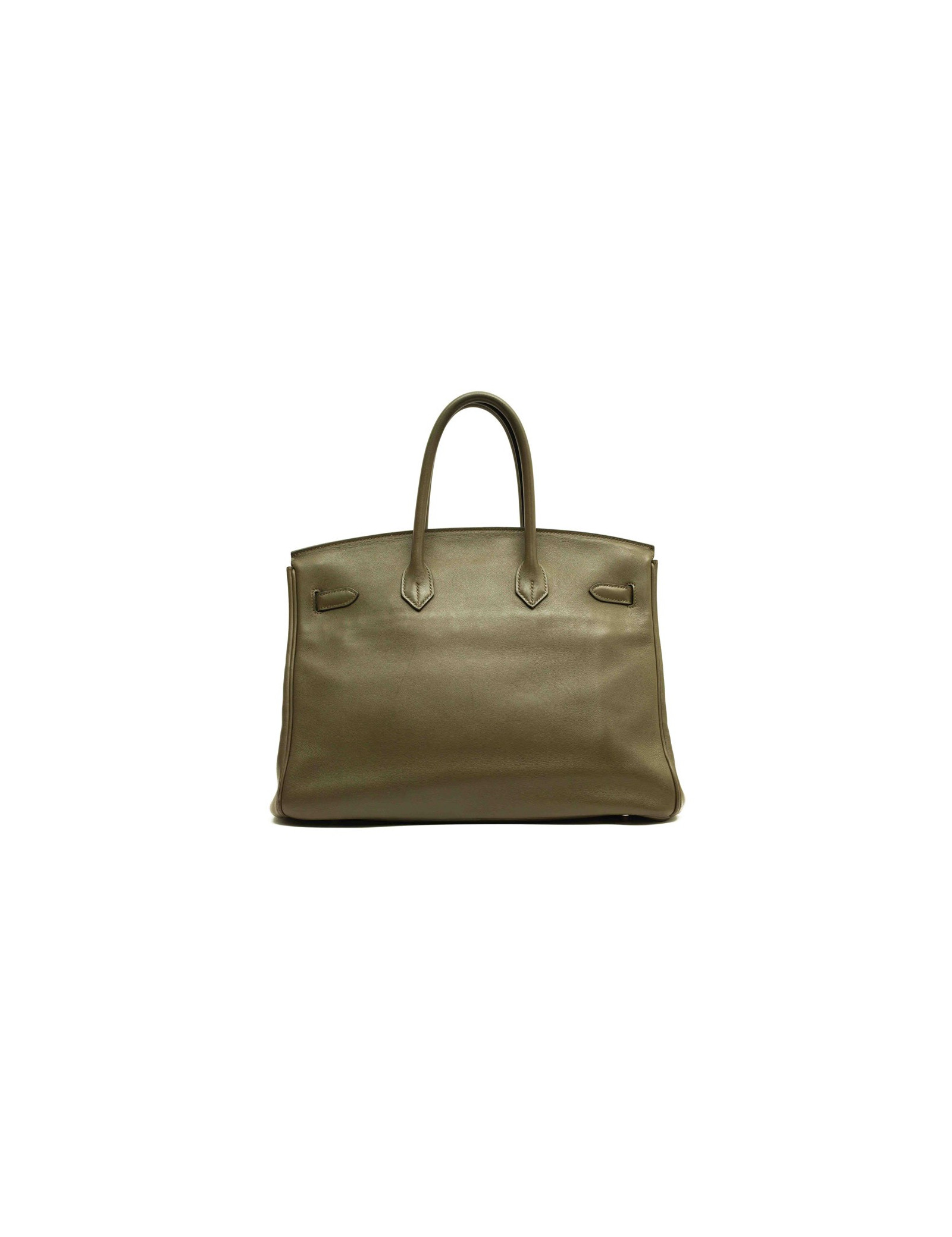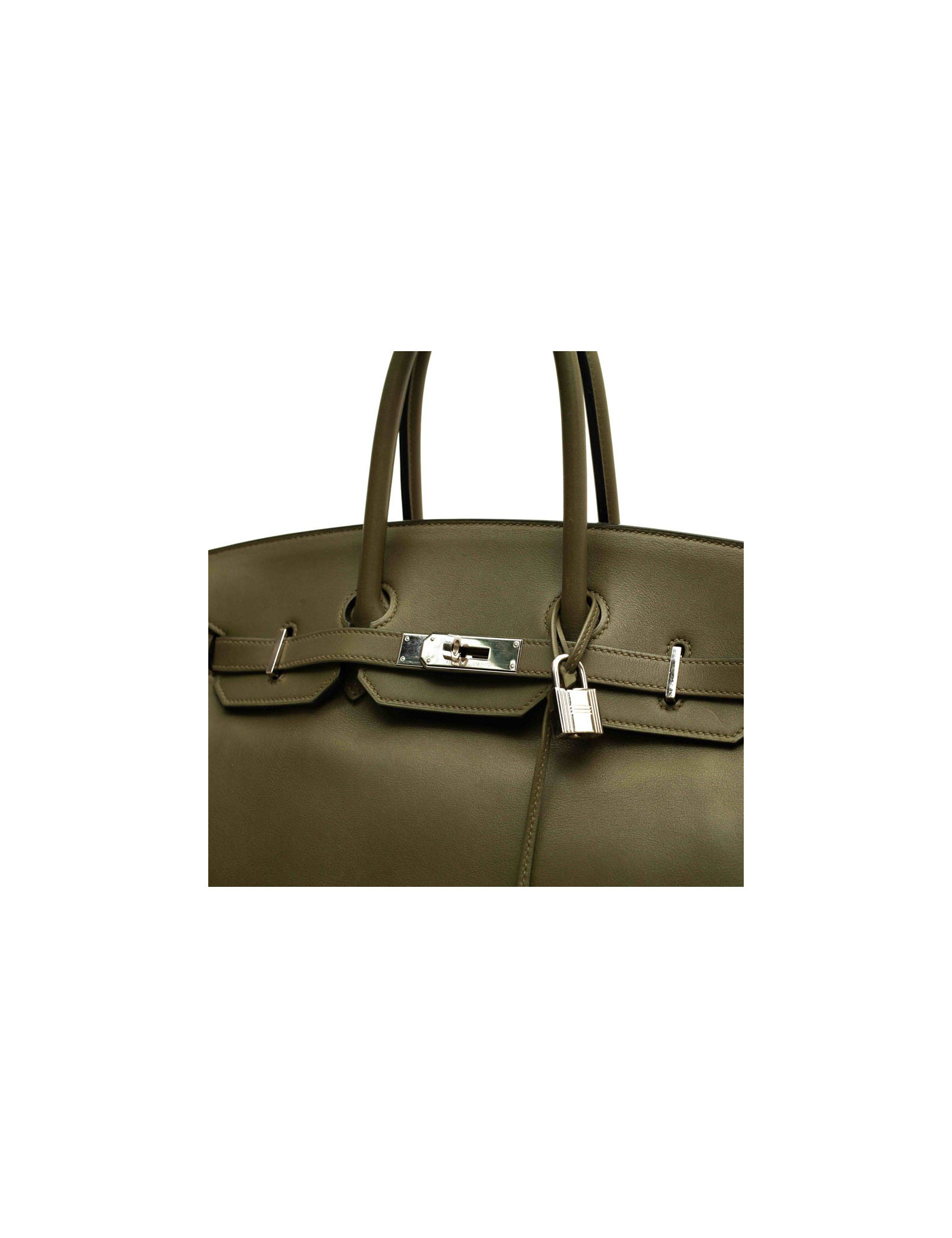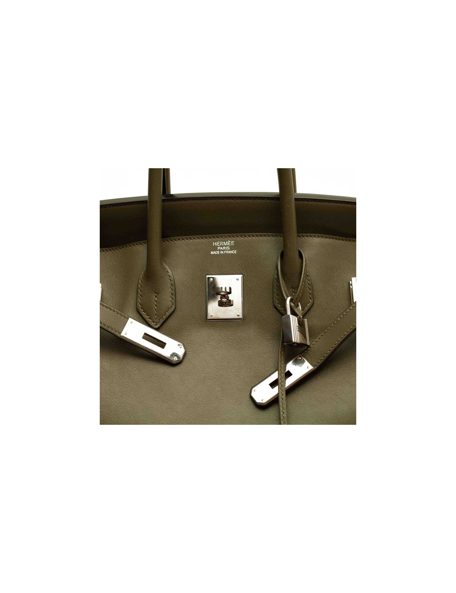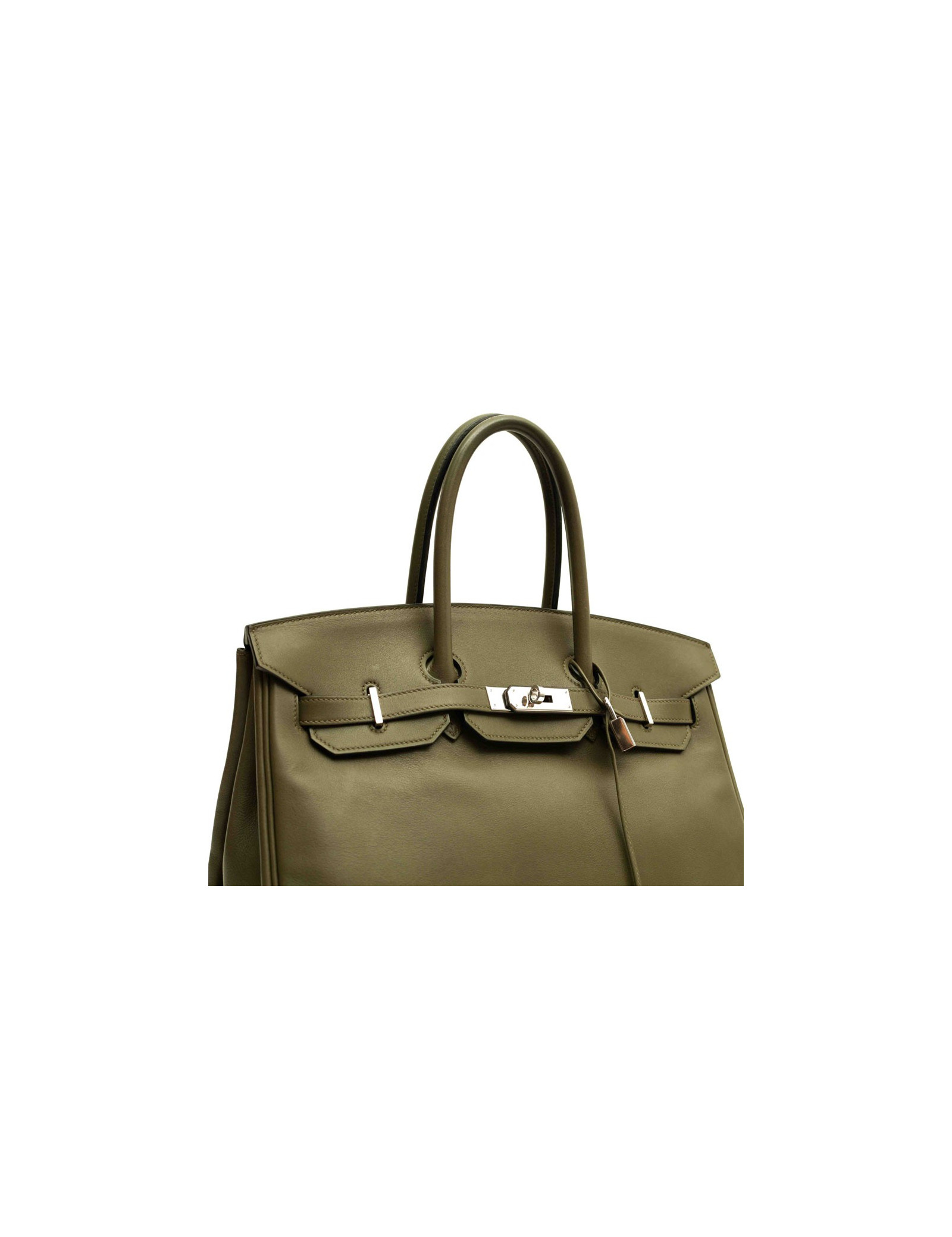 Sac d'occasion HERMES taille 35 en cuir Swift vert olive, doublure en cuir. La bijouterie est en métal argent palladié. Il a sa tirette, clés et cadenas. De micro-rayures sont visibles sur l'accastillage. Il se raconte que le sac fut dessiné pour Jane Birkin par Jean Louis Dumas, lors d'un vol Paris-Londres en 1984. Elle souhaitait un sac plus grand et plus pratique que le Kelly mais plus petit qu'une valise pour faciliter sa vie de maman, tout en lui conservant un look élégant.