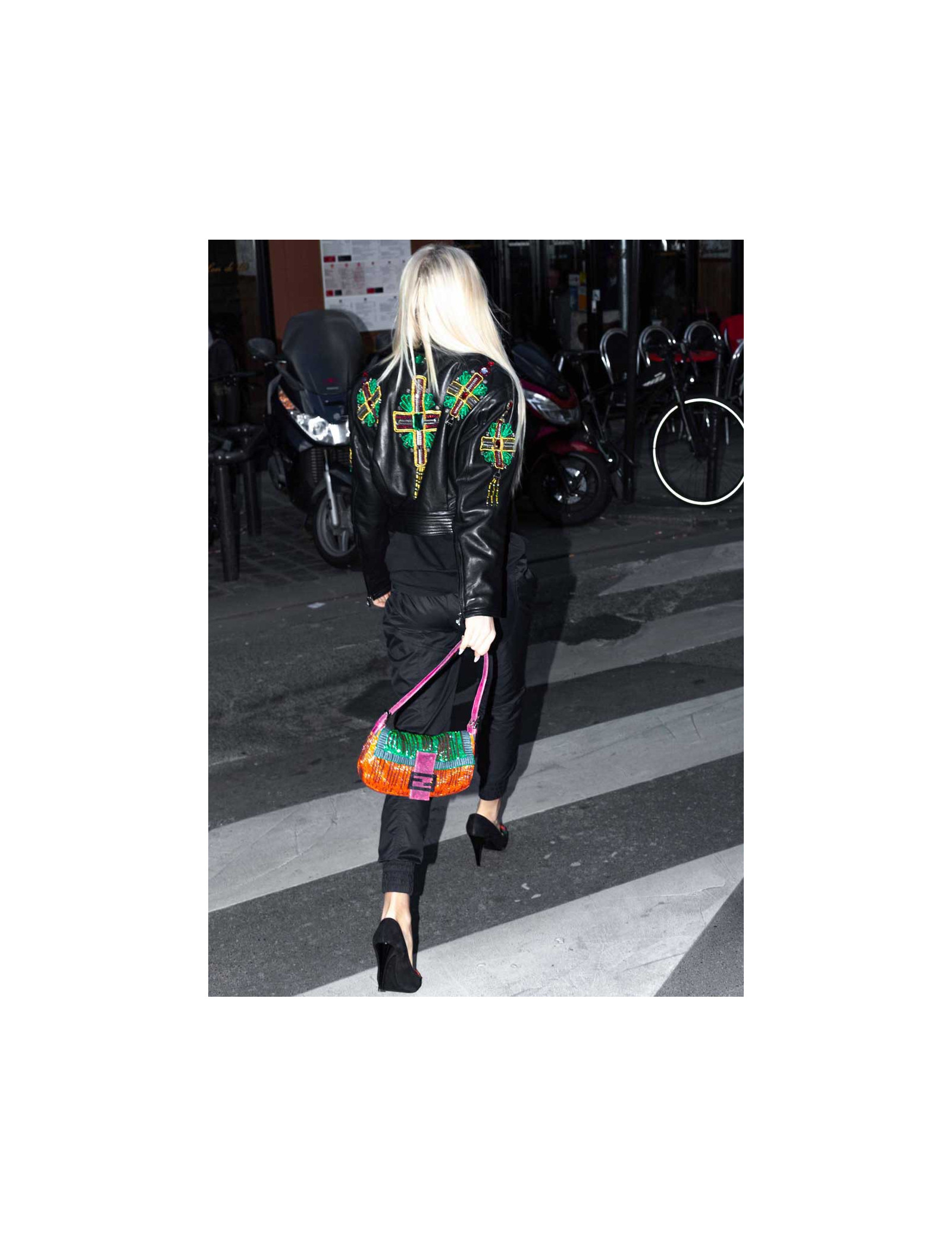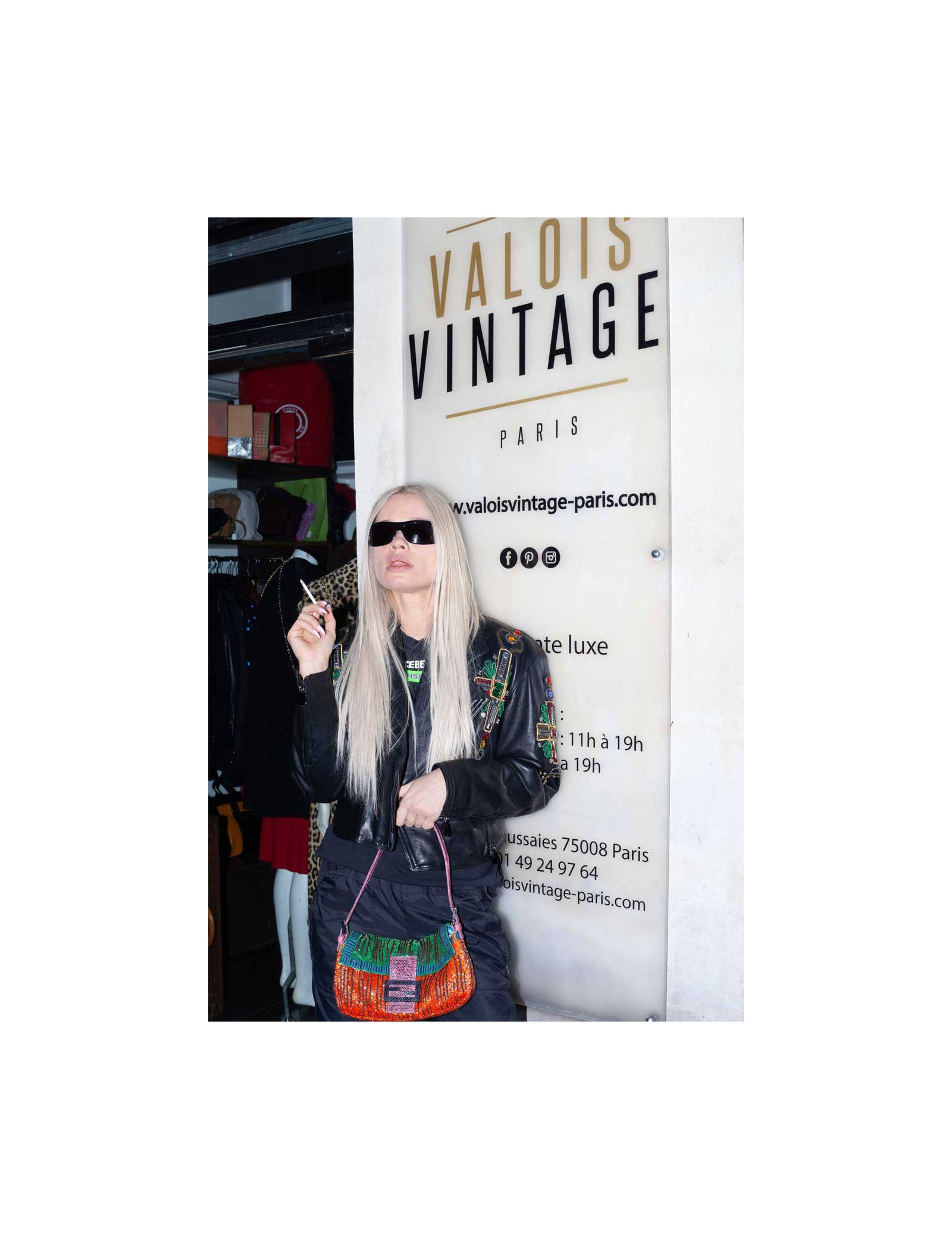 Pièce exceptionnelle Gianni Versace, une pièce collector qui finira dans un musée si elle n’est pas achetée avant par l’une d’entre vous! Il s’agit d’une veste en cuir noir à manches raglans, recouvertes de broderies et de pierres multicolores. À la taille elle est resserrée dans l’esprit d’un perfecto. La coupe est sublime. L’intérieur est doublé et est dans un état parfait, comme l’ensemble de ce blouson d’ailleurs, il semblerait qu’il n’ait jamais été porté ou vraiment très peu.