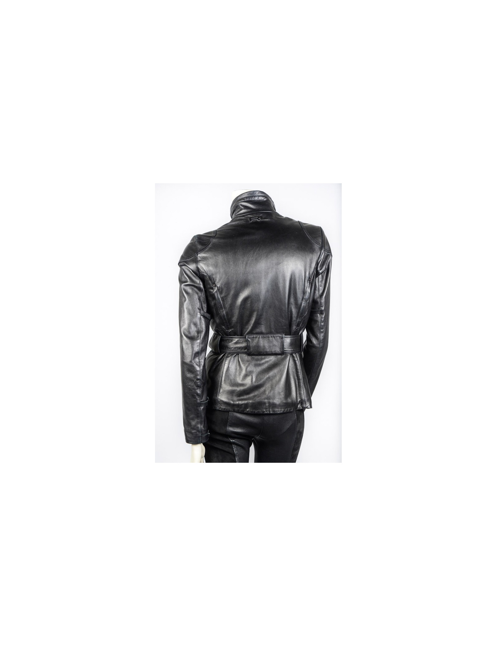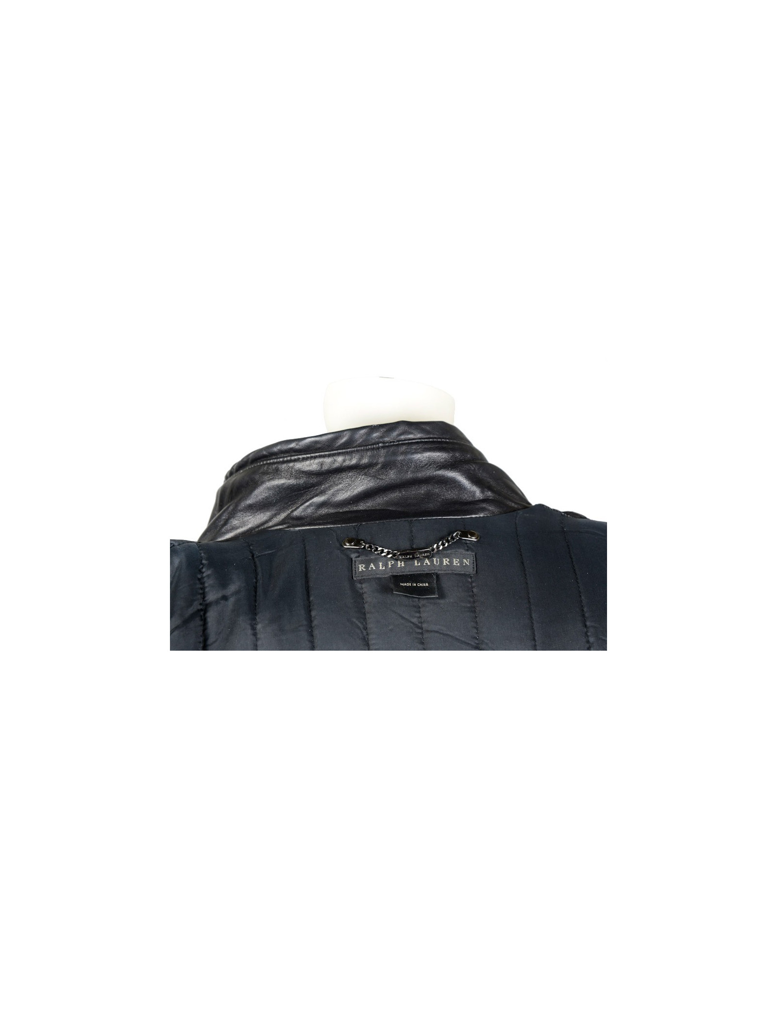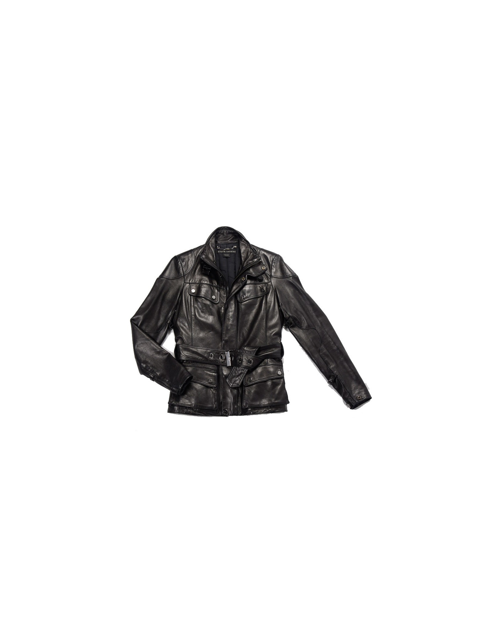Blouson Ralph Lauren en cuir d'agneau noir. Doublure moltonnée. Fermeture zippée et pression. 4 poches plaquées à l'avant. Une ceinture reglable vient resserrer la taille. Taille 2. En très bon état.