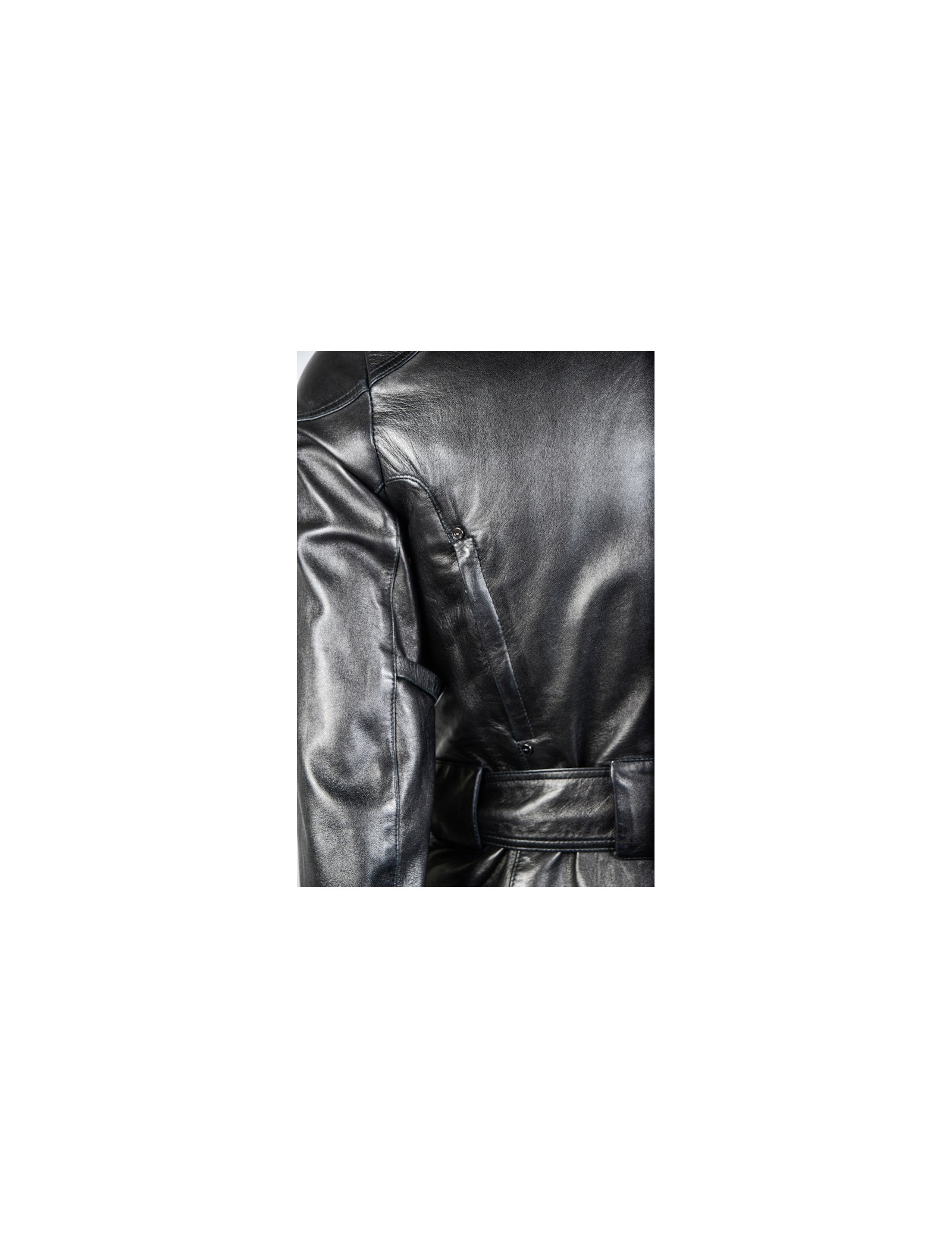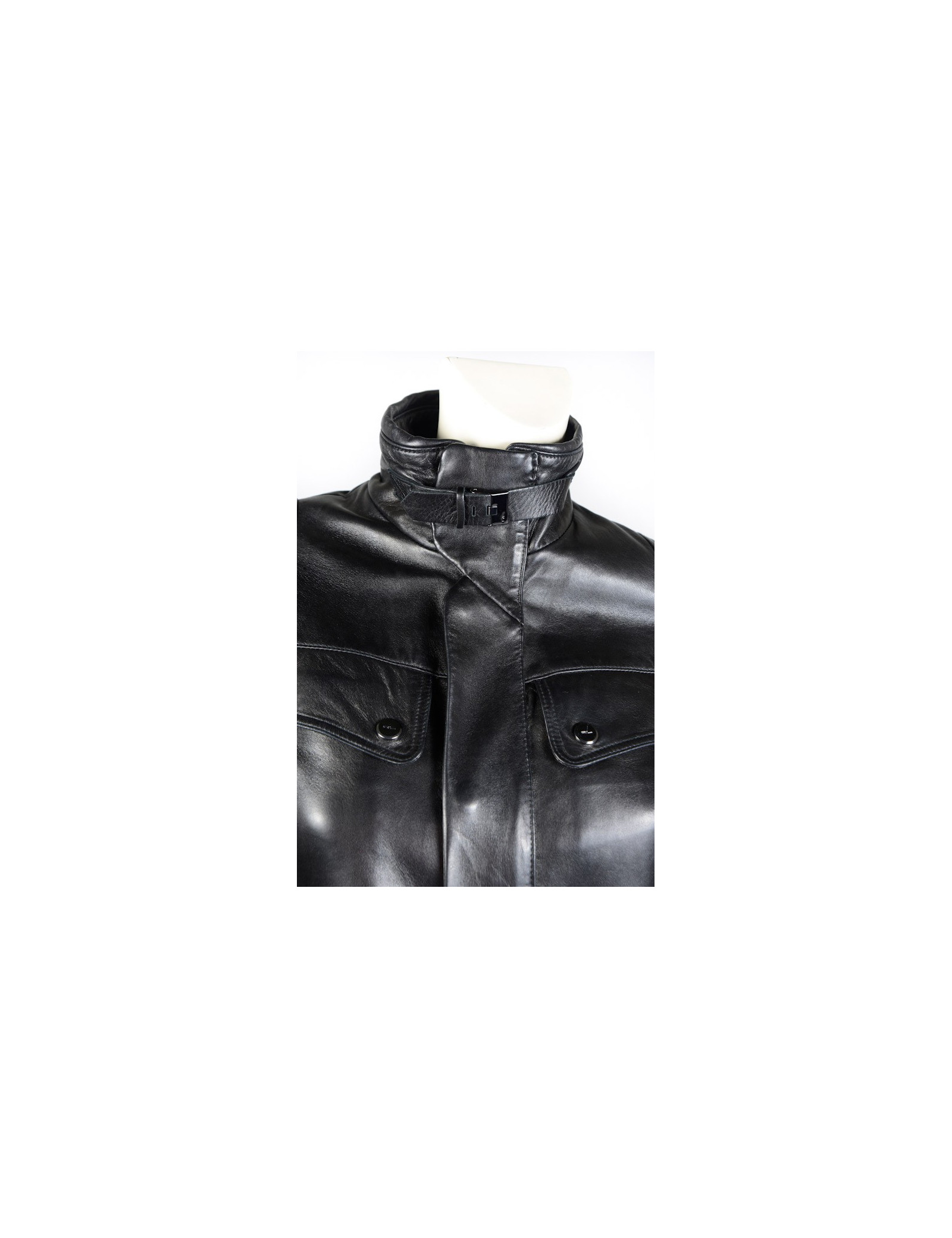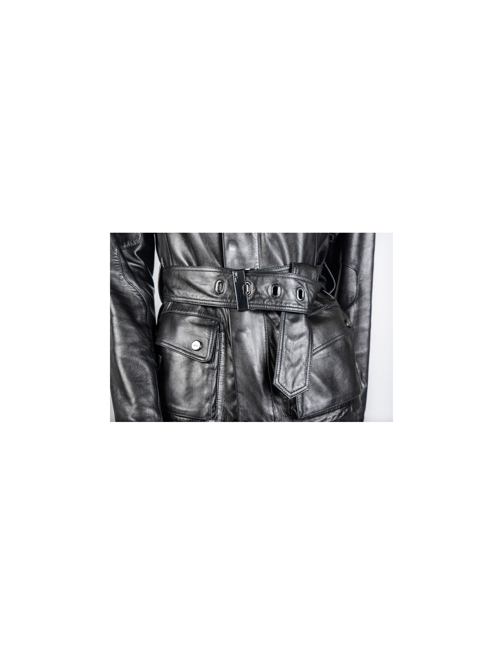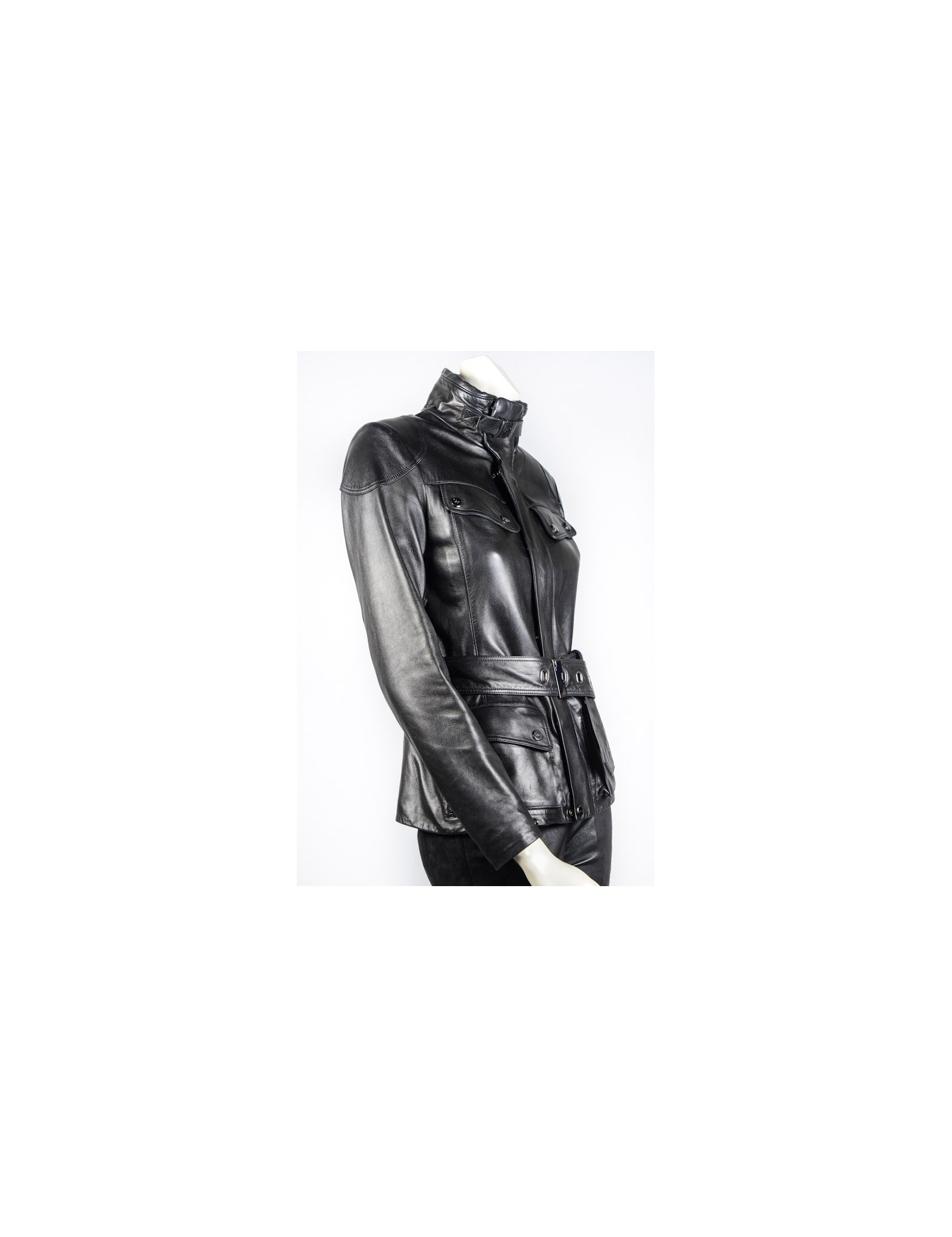 Blouson Ralph Lauren en cuir d'agneau noir. Doublure moltonnée. Fermeture zippée et pression. 4 poches plaquées à l'avant. Une ceinture reglable vient resserrer la taille. Taille 2. En très bon état.