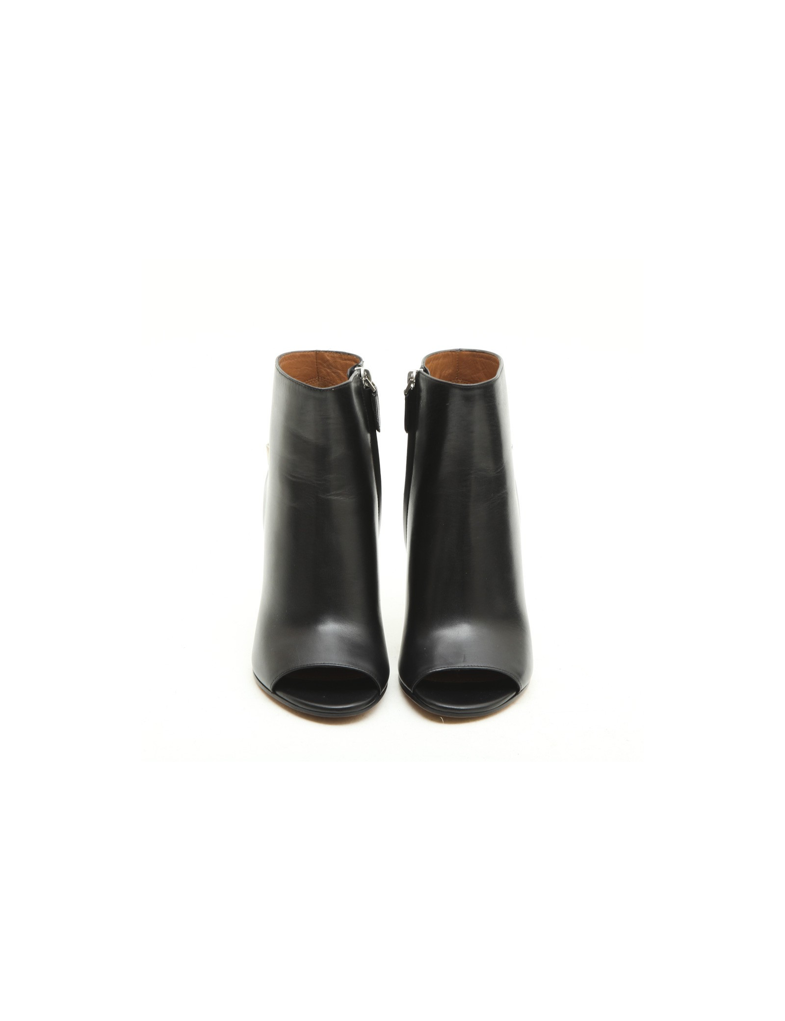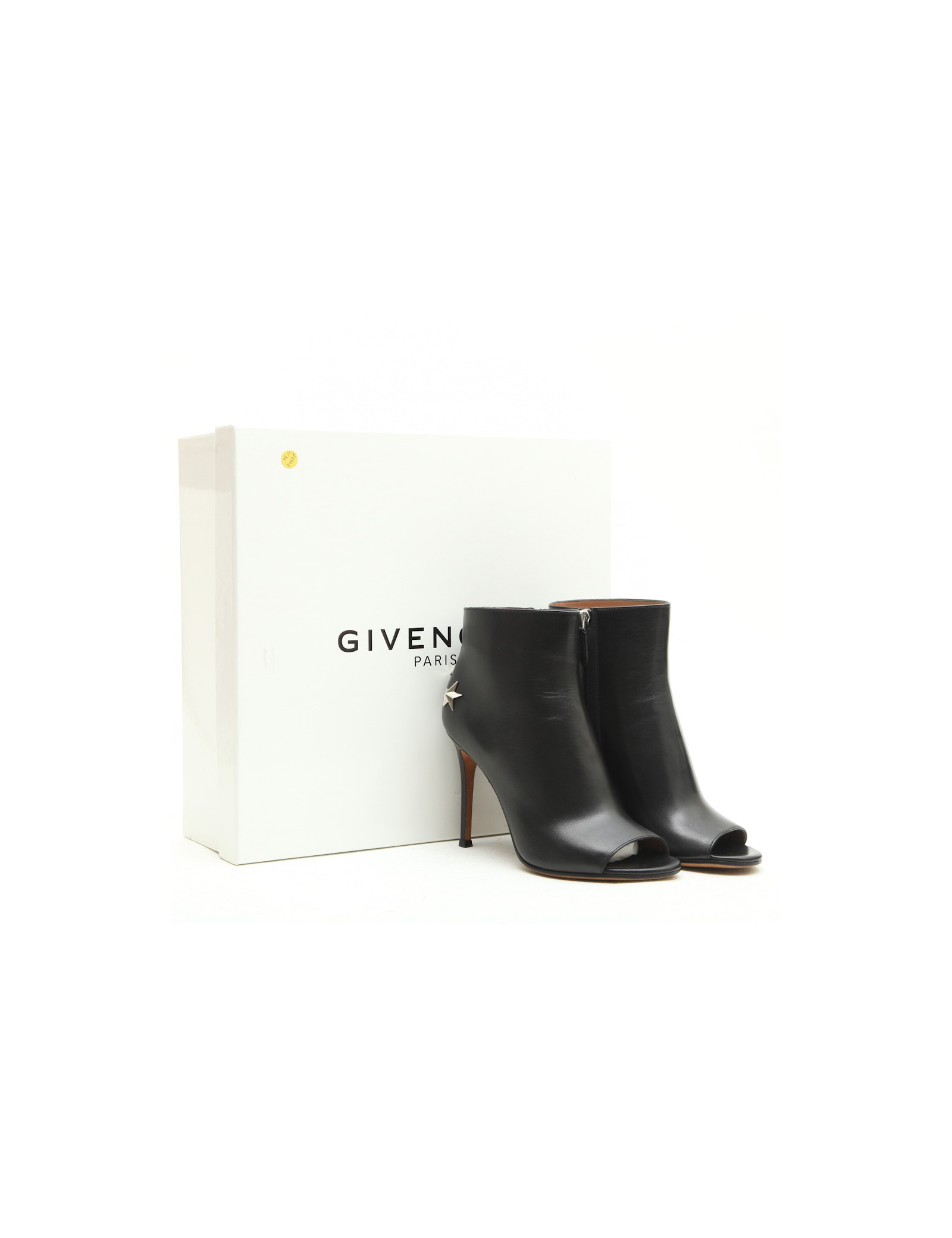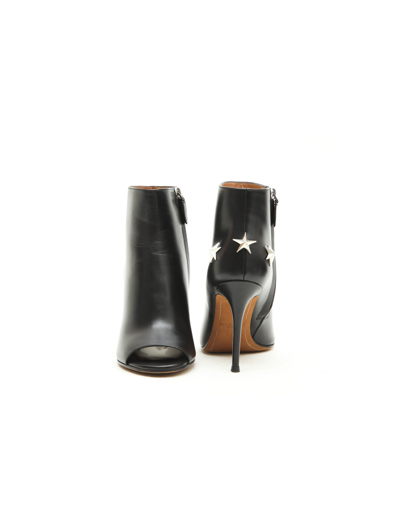 Boots open toe Givenchy en cuir noir. Taille 36. Fermeture zippée à l'arrière. 3 étoiles argentées à l'arrière. Made in Italy. Etat neuf.