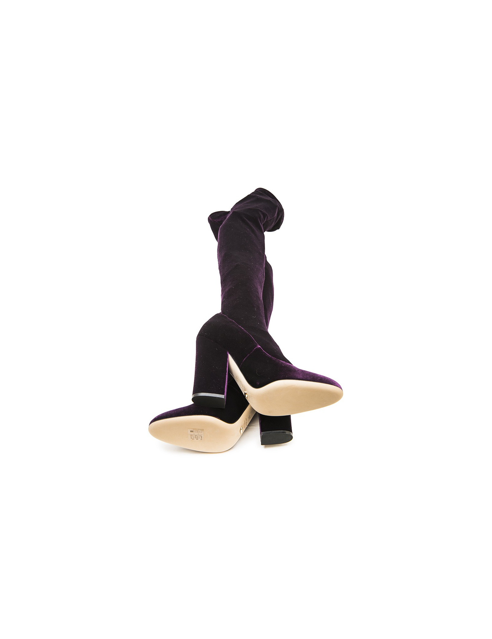 Ces cuissardes d'occasion SERFIO ROSSI sont en velours stretch de couleur prune. C'est une taille 36. La Matière est élastique et stretch ce qui lui permet d'épouser la forme de la jambe. L'intérieur est de couleur prune également. Les semelles sont en cuir. Elles n'ont jamais été portées.