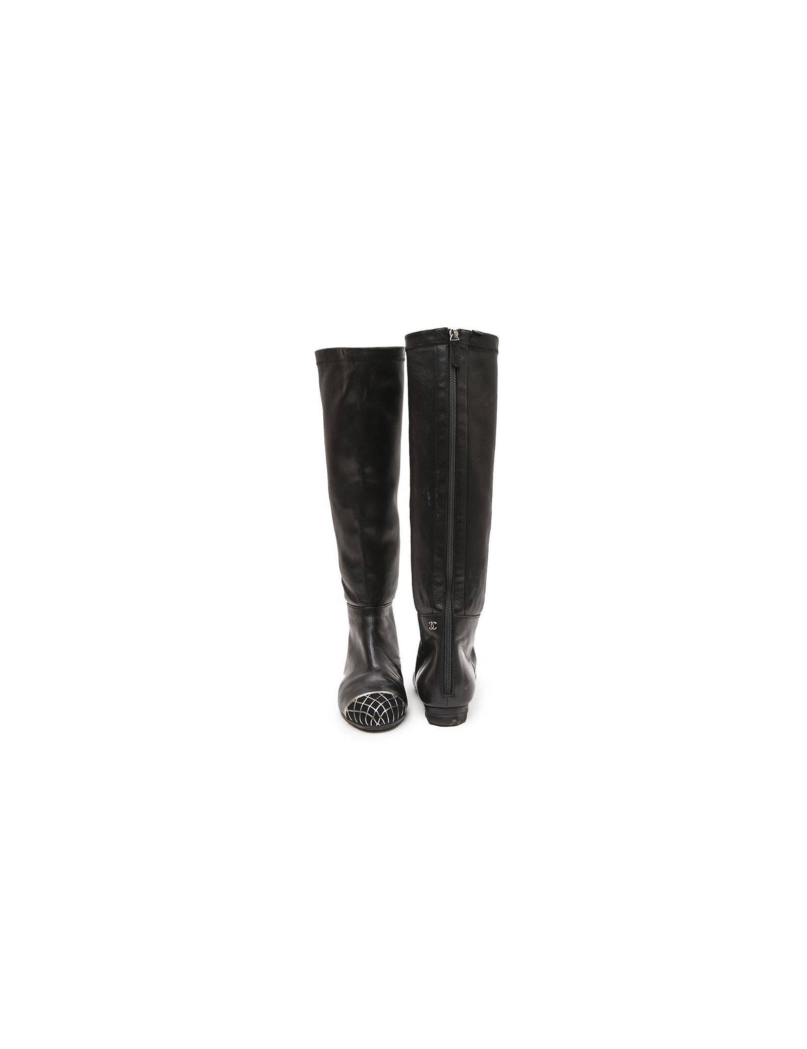 Bottes Chanel en cuir d'agneau lisse noir. Taille 37. Le bout en veau velours et grille en métal argentée. En très bon état.