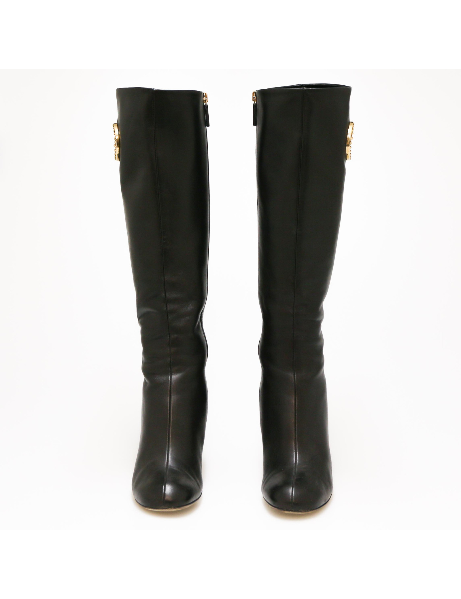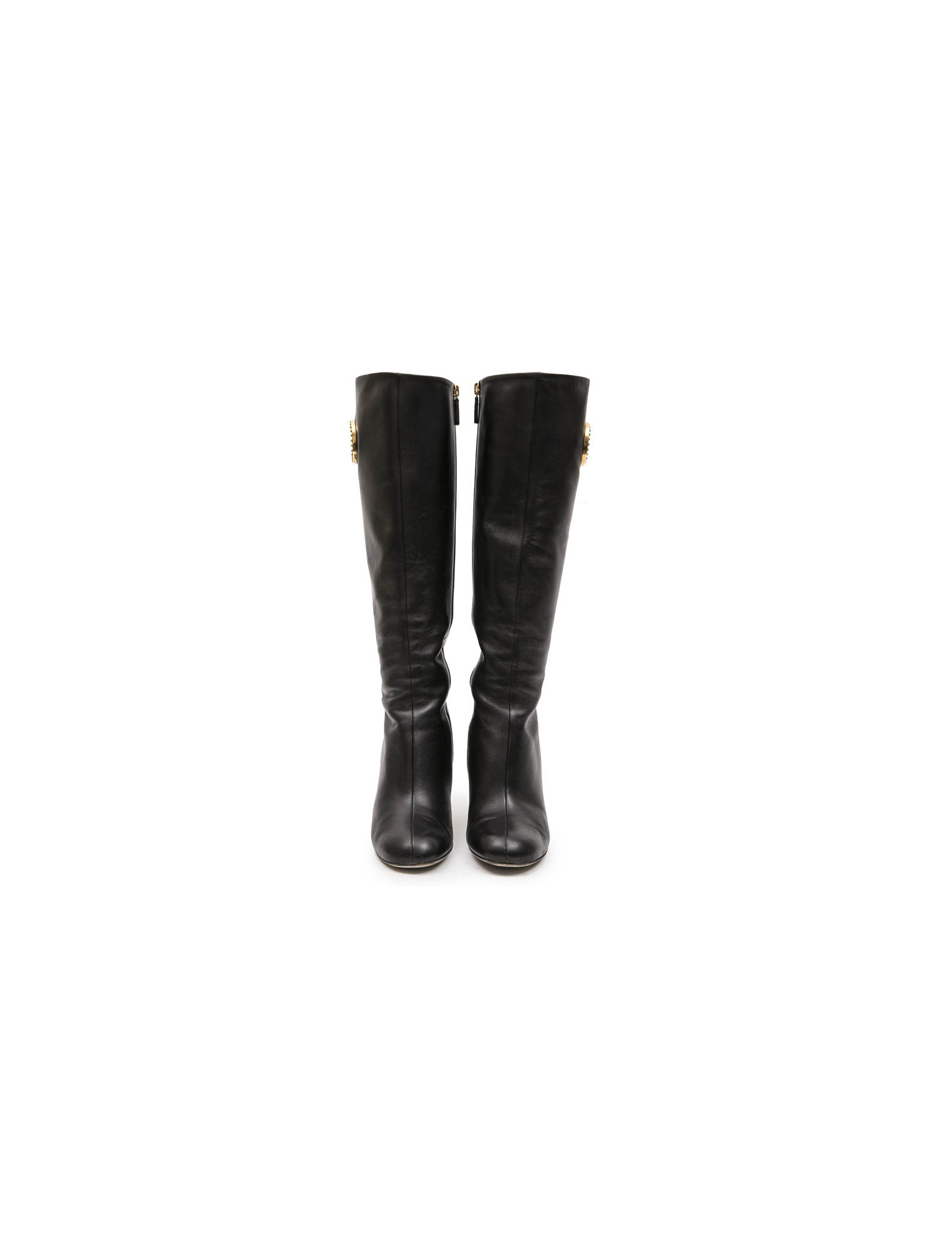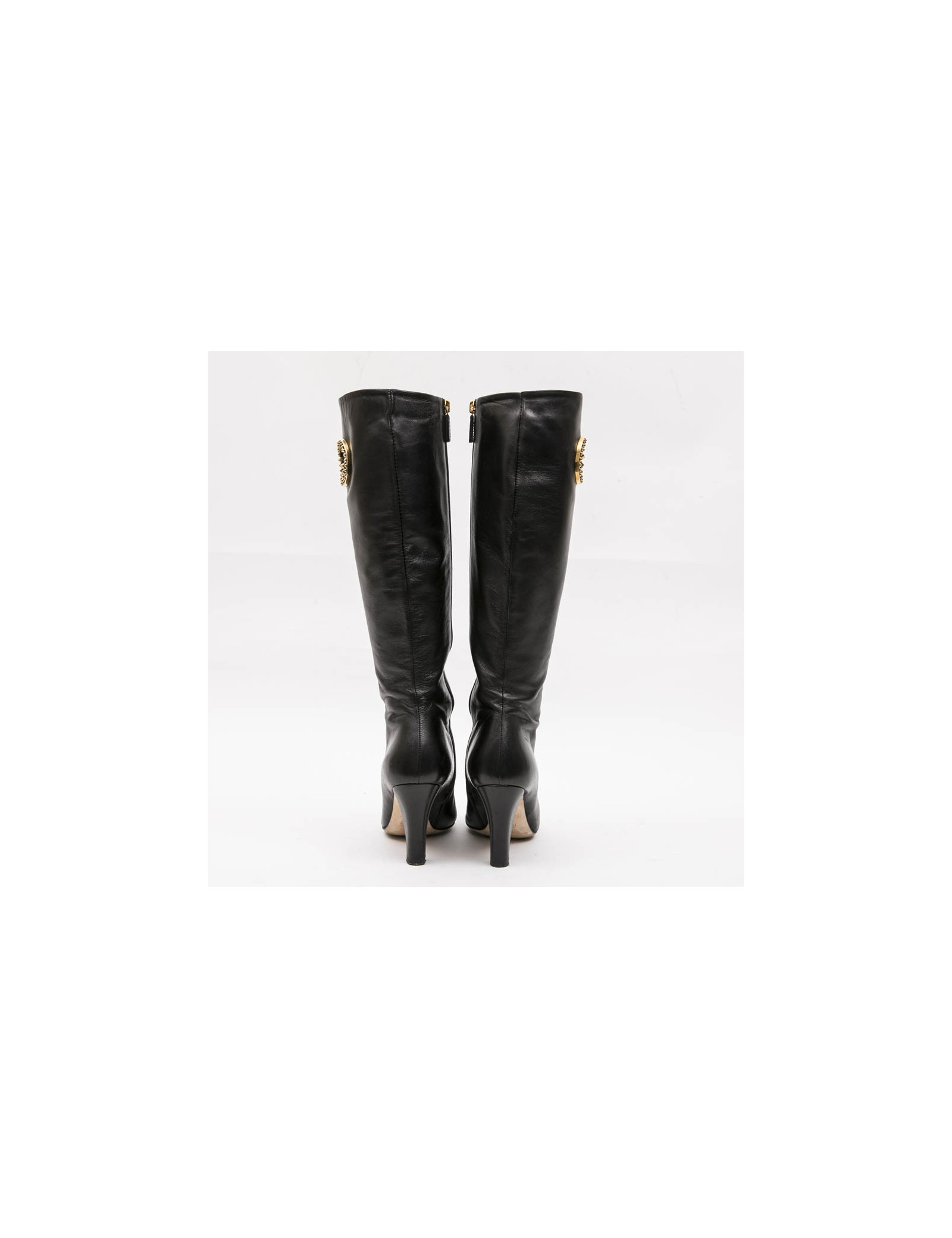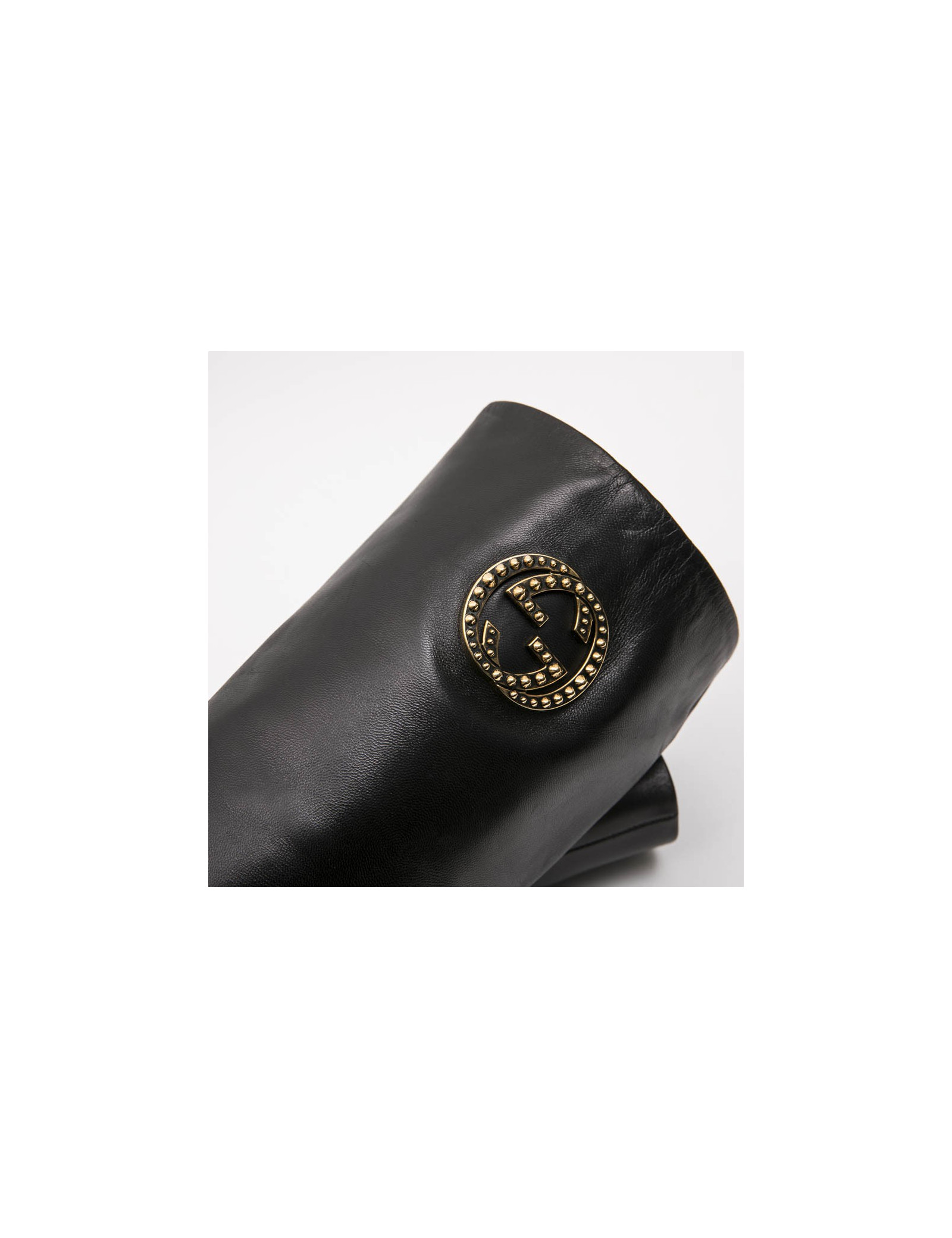 Ces jolies bottes GUCCI d'occasion sont en cuir souple noir. C'est une taille 36.5. Elles ont une fermeture éclair tout le long de la tige. Elles sont doublées en cuir noir. Un bijou "GG"    ( 4.5 x 5 cm ) en métal doré vieilli orne le haut de chaque botte (sur l'extérieur). On remarque quelques marques d'usures d'usage du cuir. Elles sont en parfaite condition.