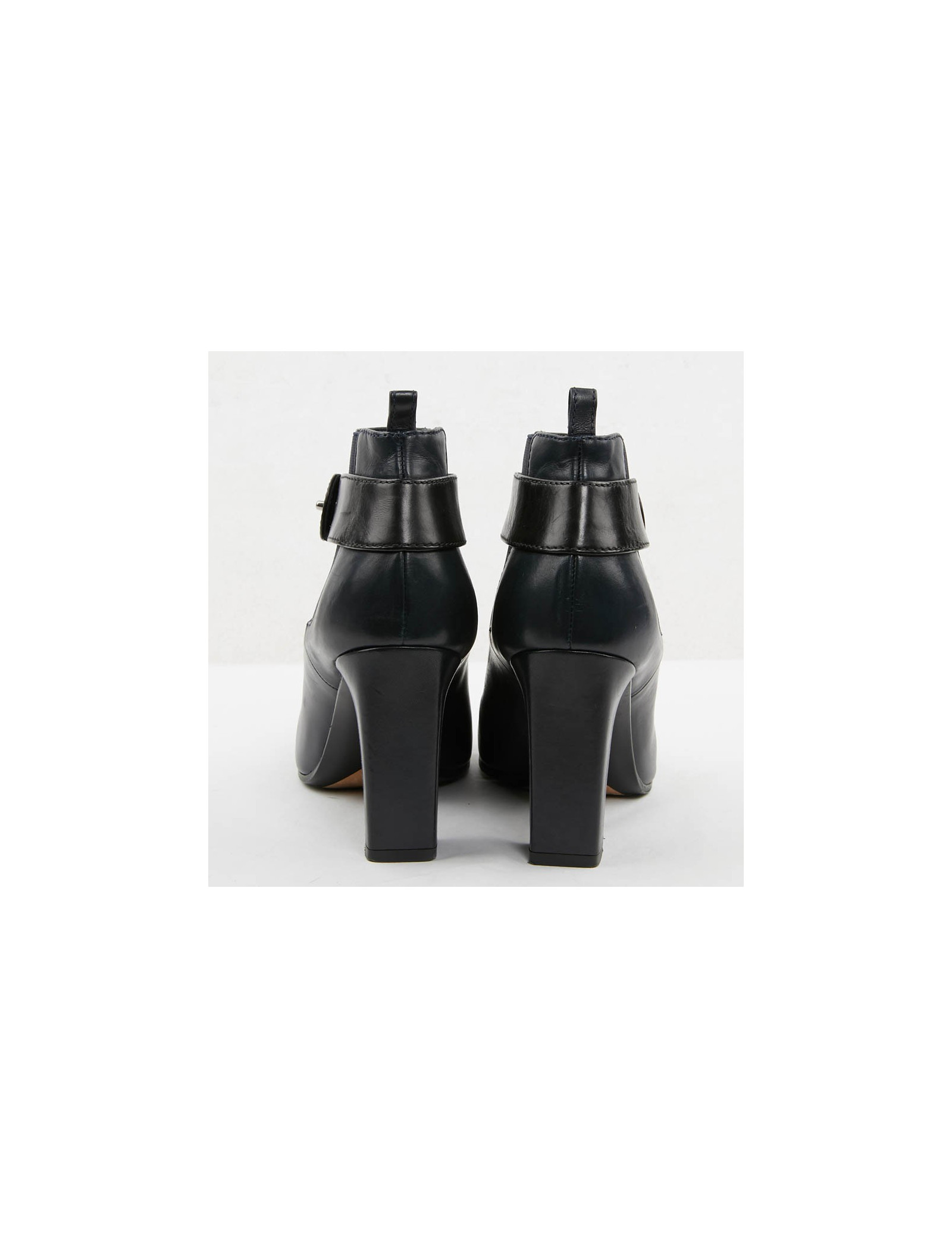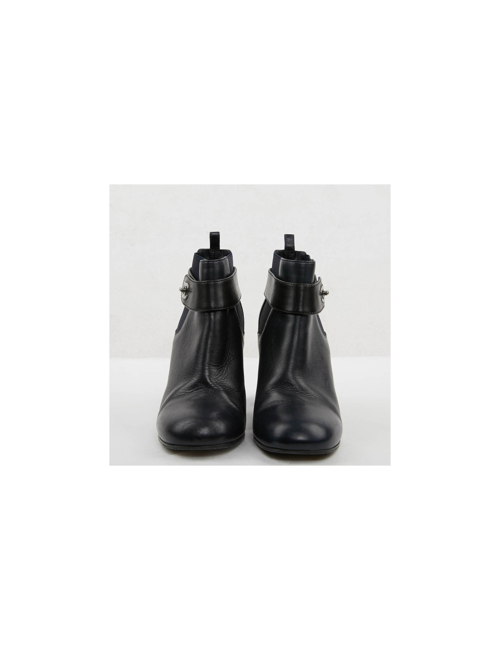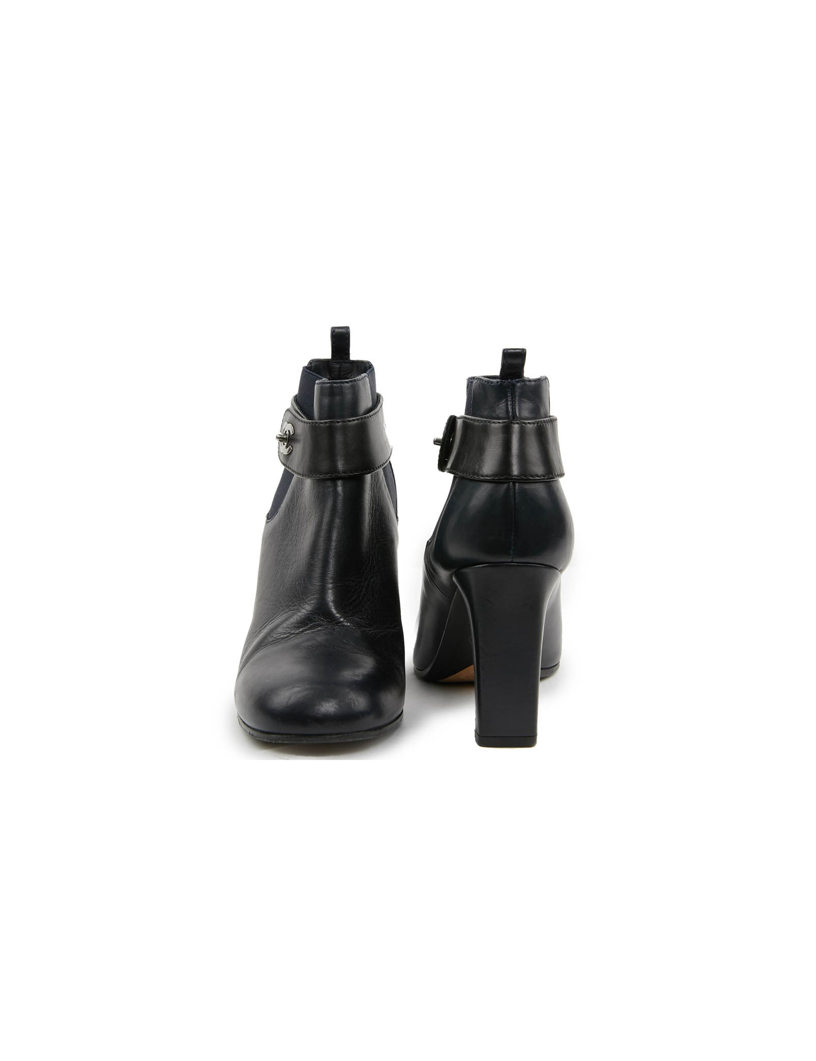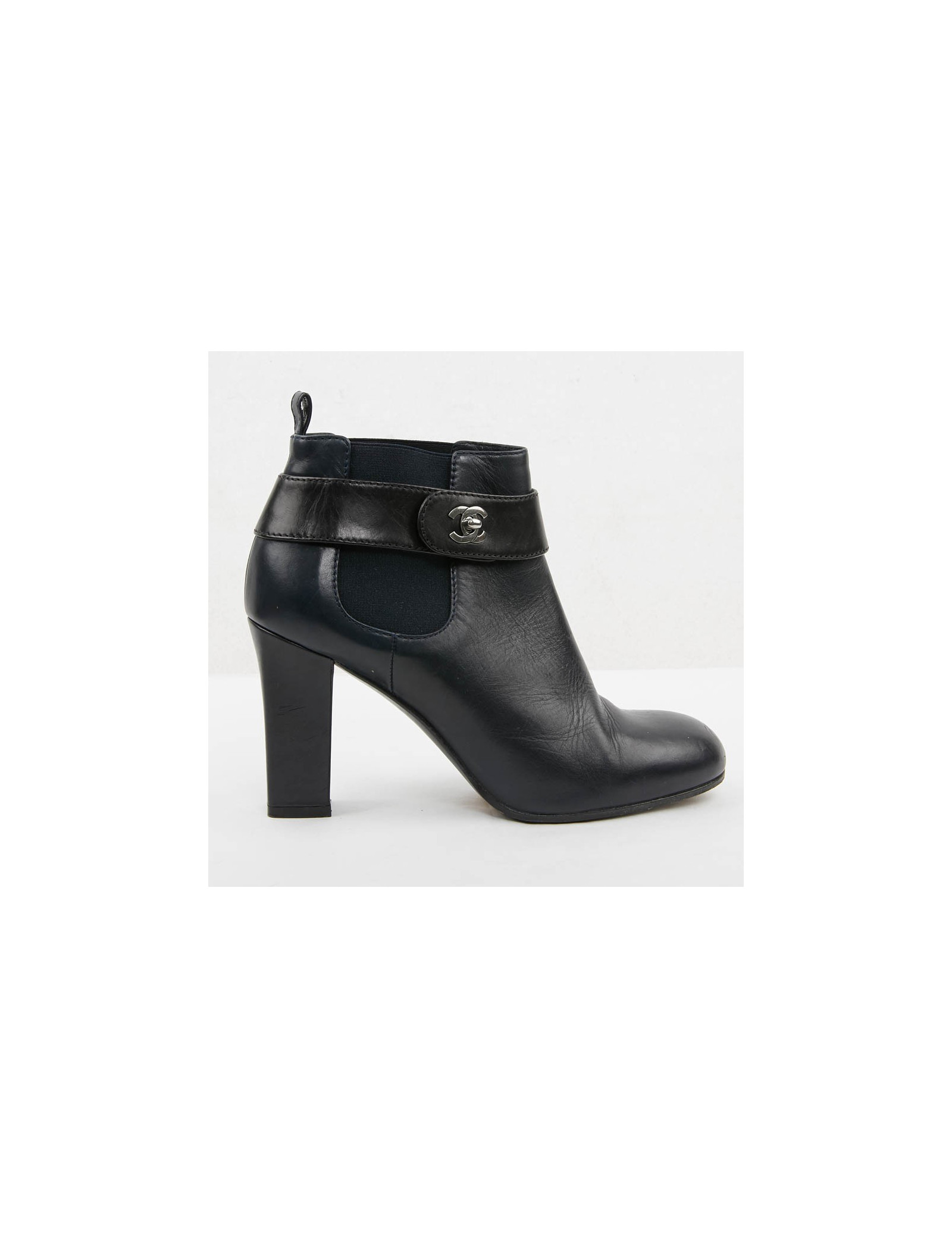Ces boots à talon Chanel en cuir bleu foncé sont d'occasion. Leur talon épais permet une grande stabilité. Pour faciliter l'enfilage de la chaussure la languette avec le double "CC" se détache. Les renforts stretch sont en parfait état. Usures d'usage sur le cuir.