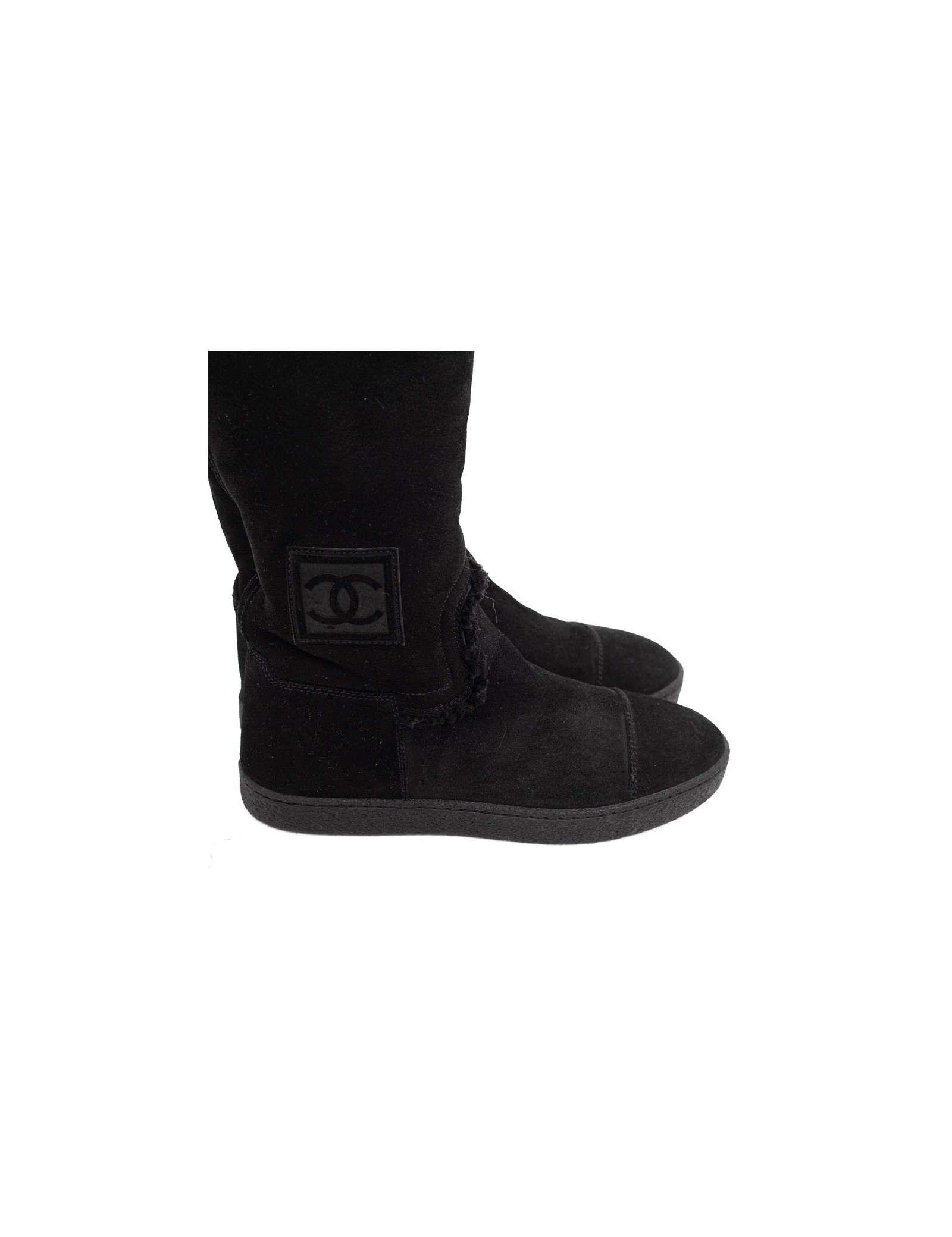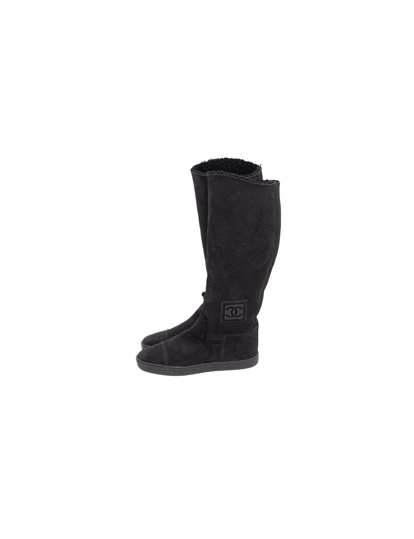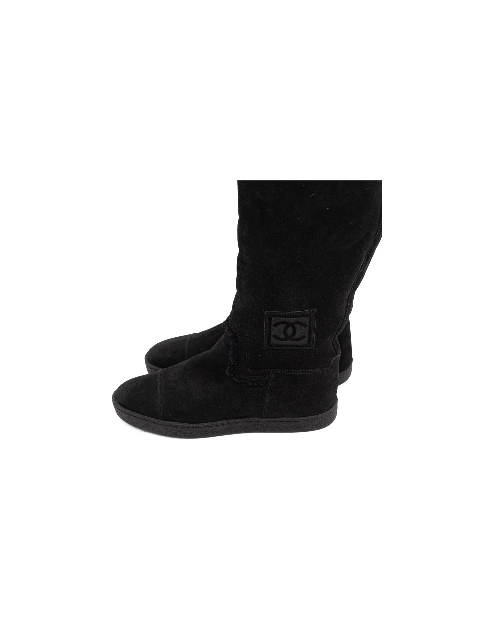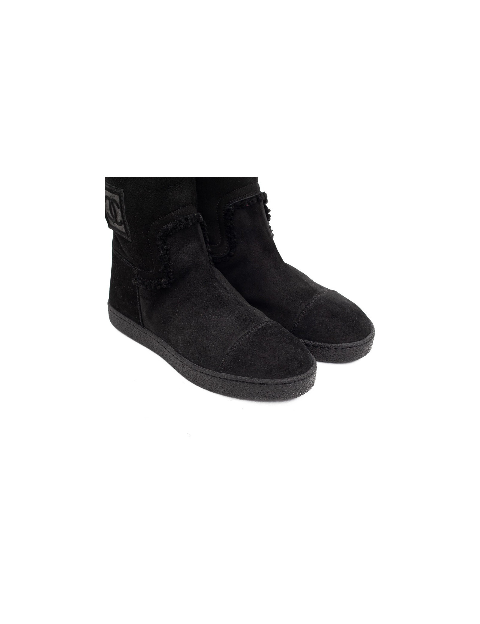 L'hiver est là. Très confortables, ceS bottes en peau retournée noire. Sur la partie basse le sigle CC. La semelle est en crêpe noire, signée "C H A N E L et CC". La partie de la chaussure est doublée également en peau retournée écrue. On peut aussi les porter à mi-mollet en faisant un revers.