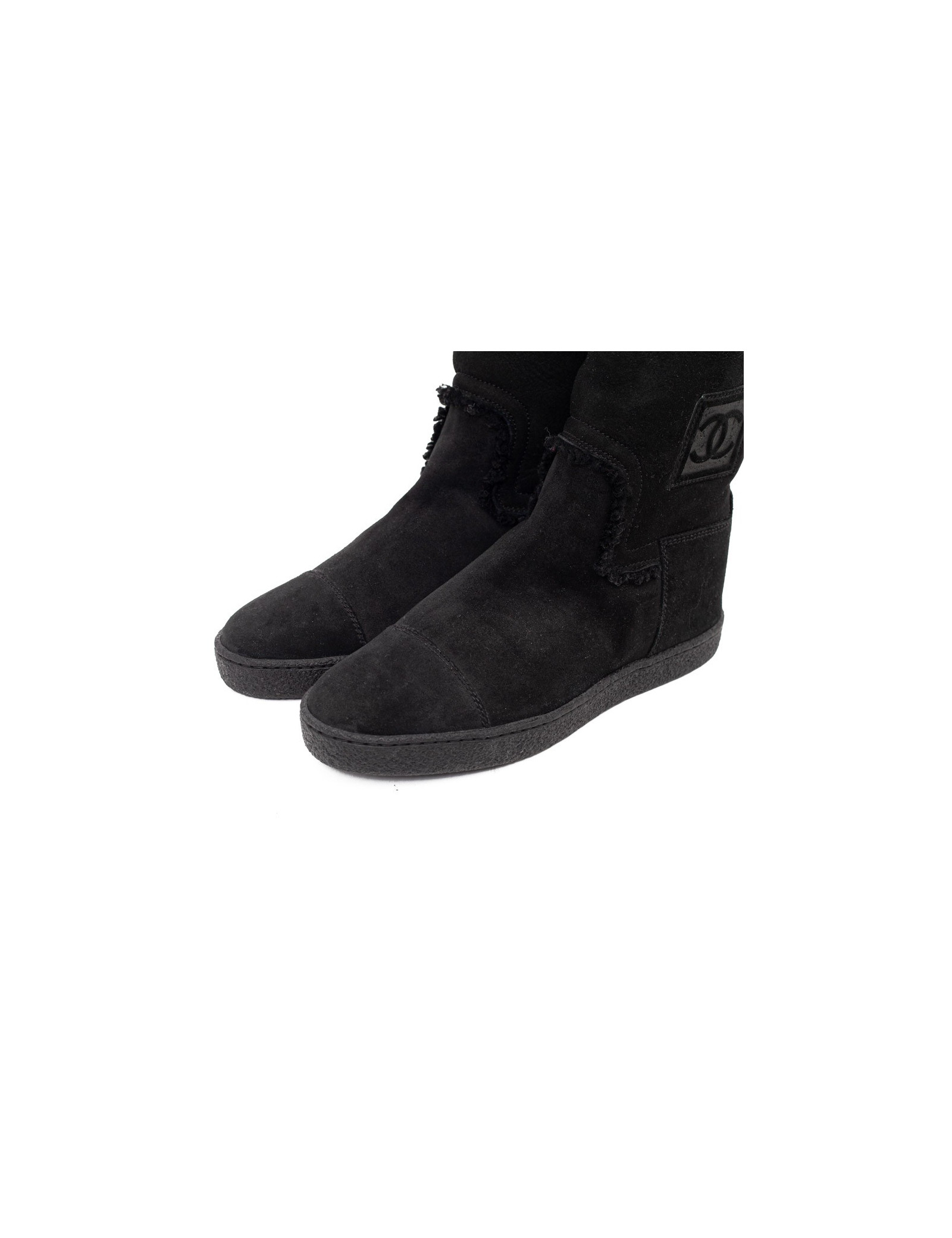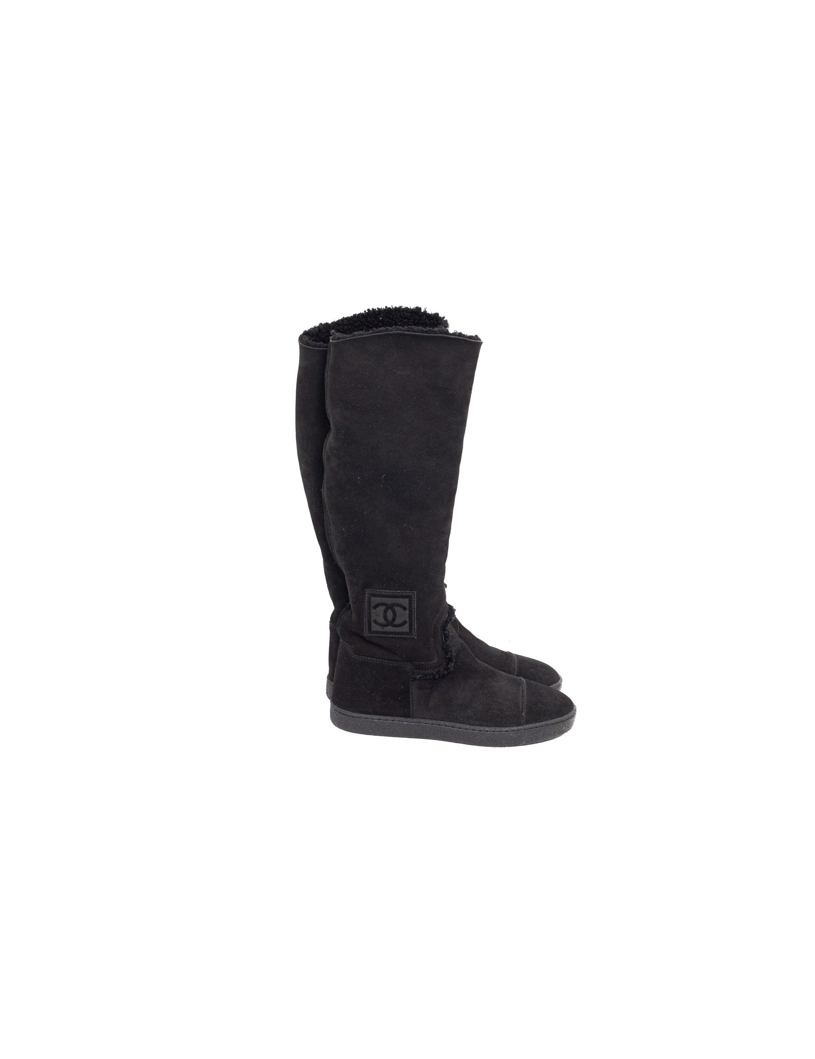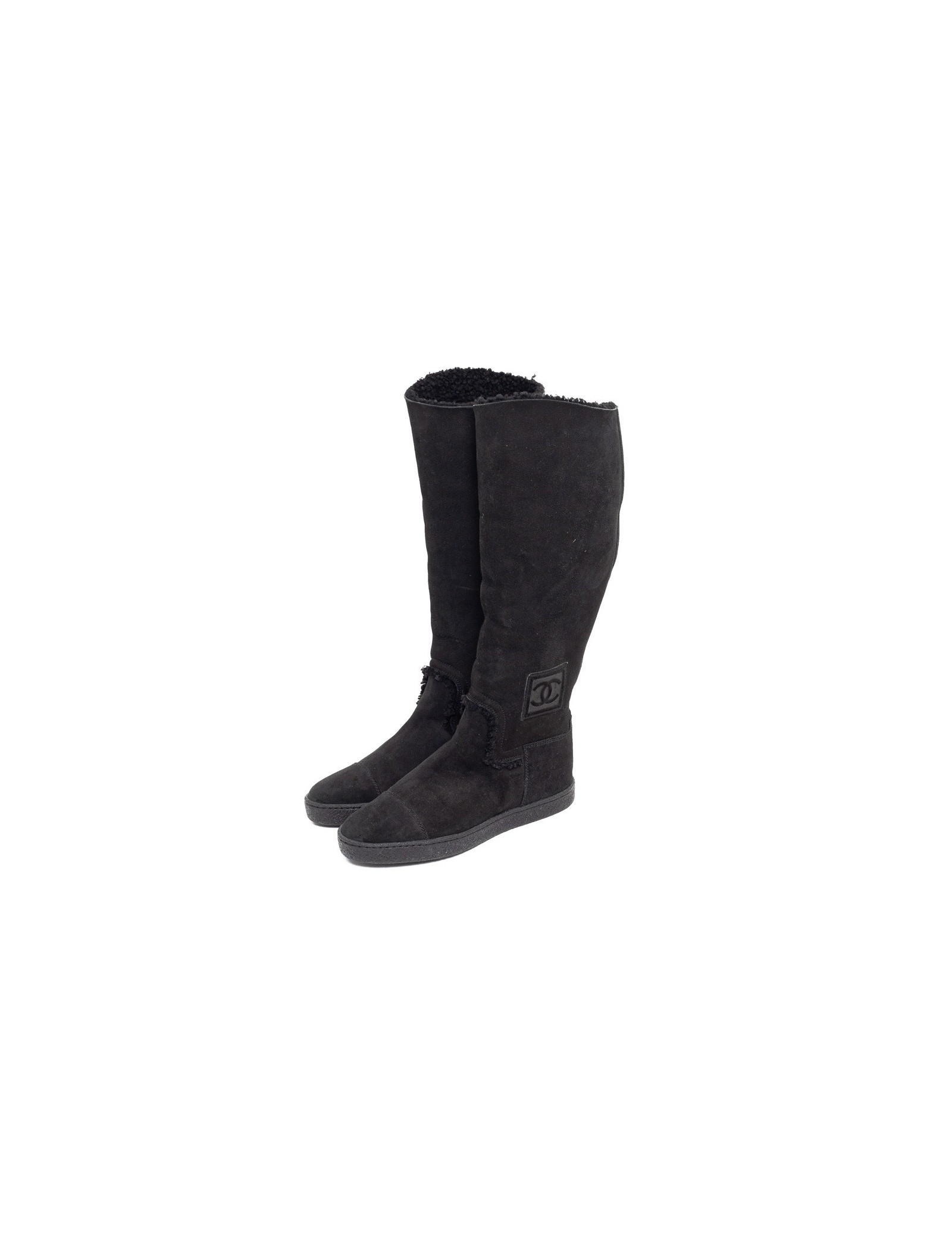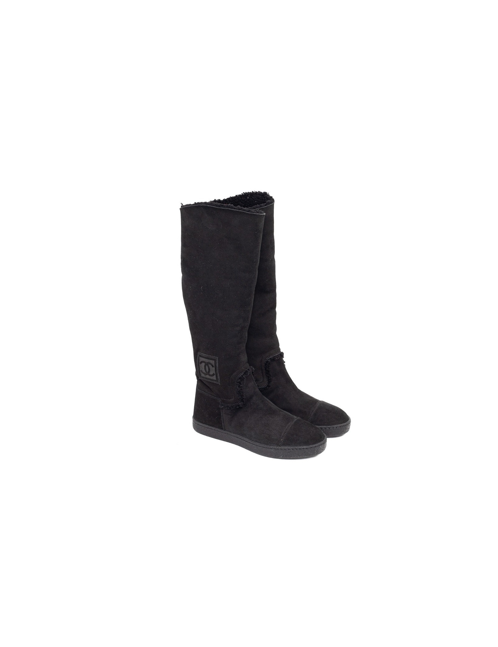 L'hiver est là. Très confortables, ceS bottes en peau retournée noire. Sur la partie basse le sigle CC. La semelle est en crêpe noire, signée "C H A N E L et CC". La partie de la chaussure est doublée également en peau retournée écrue. On peut aussi les porter à mi-mollet en faisant un revers.