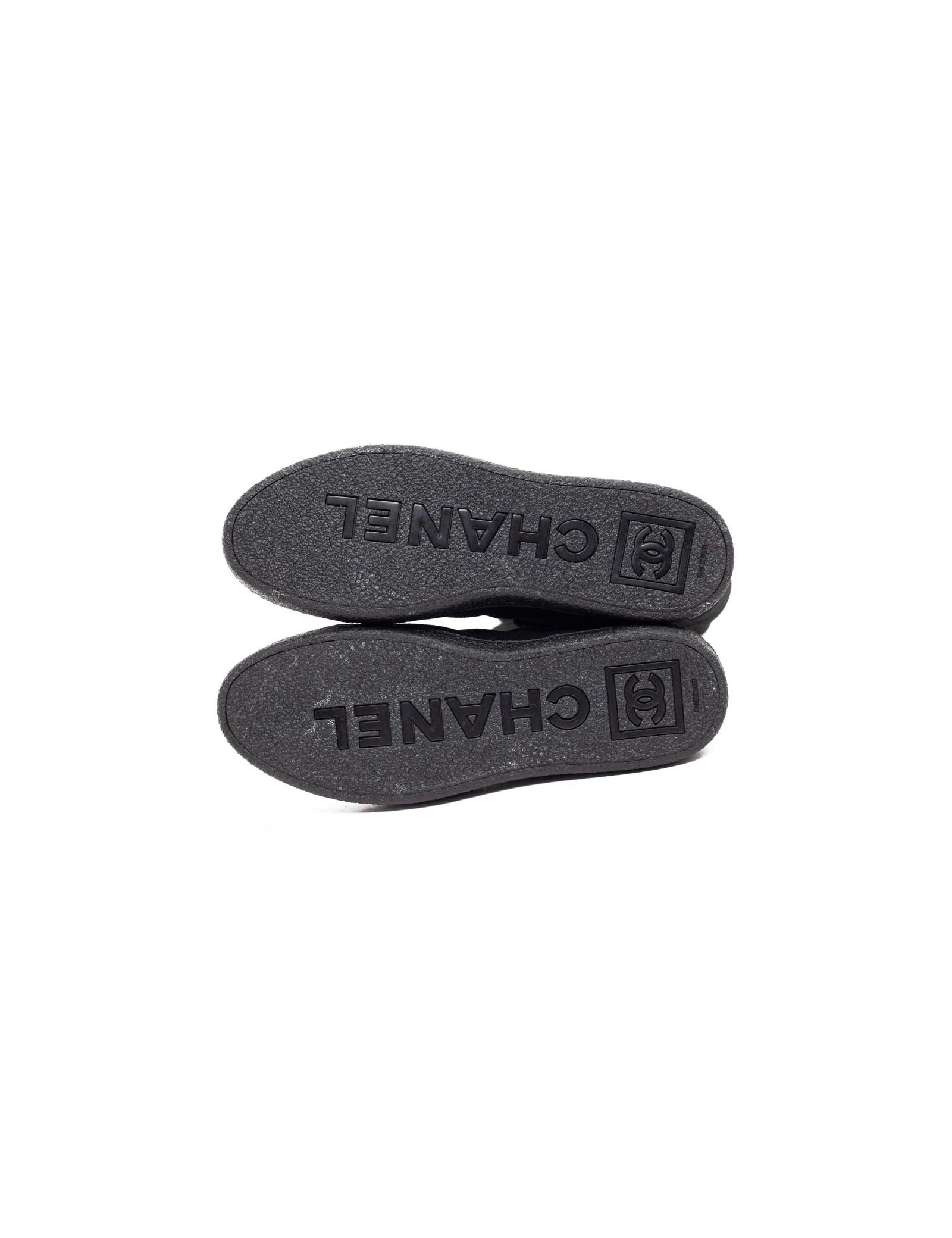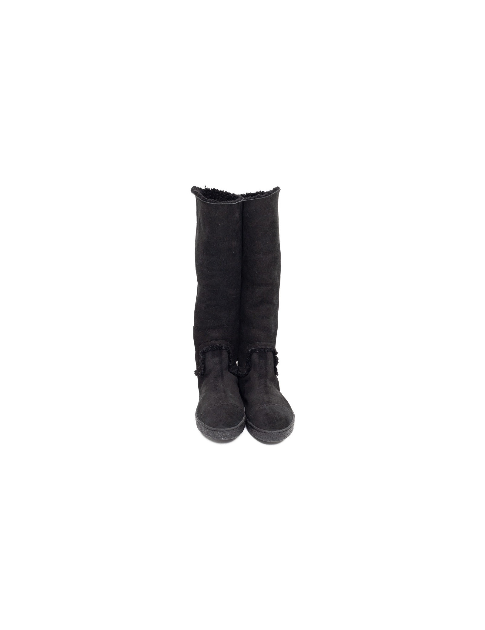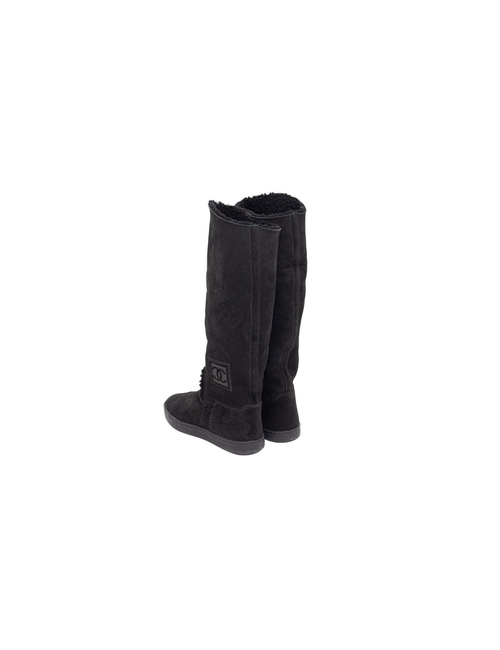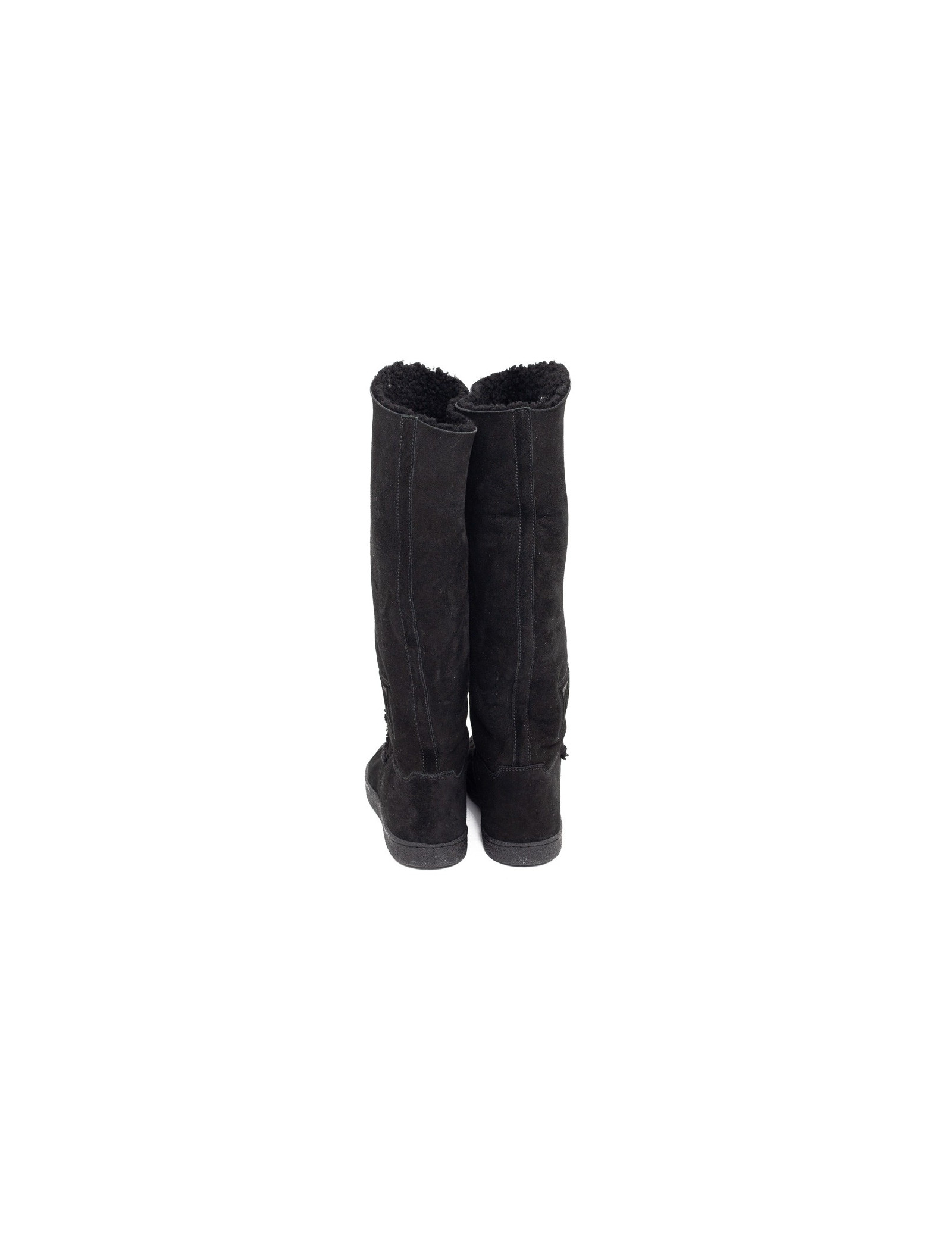 L'hiver est là. Très confortables, ceS bottes en peau retournée noire. Sur la partie basse le sigle CC. La semelle est en crêpe noire, signée "C H A N E L et CC". La partie de la chaussure est doublée également en peau retournée écrue. On peut aussi les porter à mi-mollet en faisant un revers.