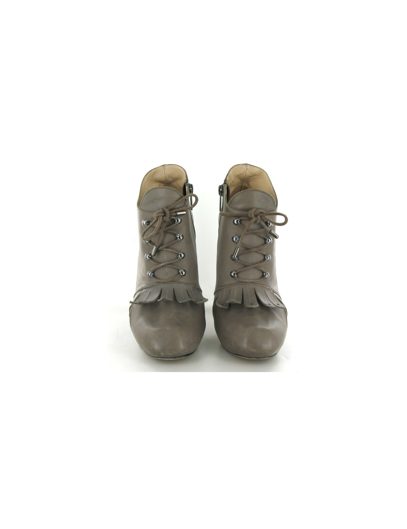 Paire de bottines NICHOLAS KIRKWOOD, en cuir mat couleur taupe, taille 38. Semelles en cuir. Confort d'essayage graêc à la fermeture éclair placée à l'intérieur du pied (hauteur : 10 cm). LAcets à l'avant avec crochets style montagnard. Petites franges en cuir qui apporte une touche d'originalité supplémentaire. Les talons ont une forme sculpturale, ainsi que les plateformes biseautées. Très bon état général malgré quelques traces et griffures d'usure sur le cuir, notamment au niveau des talons. Made in Italy.