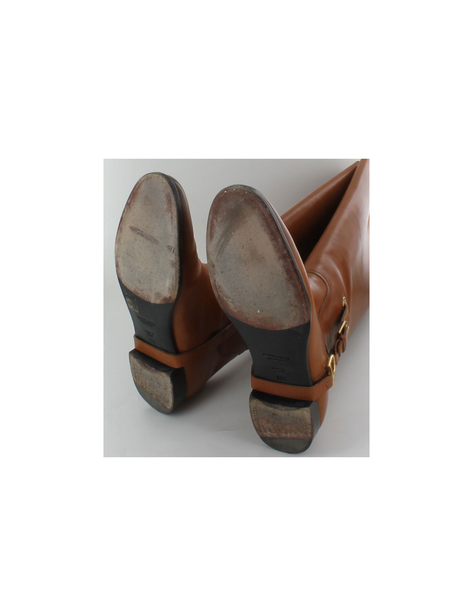Ces Bottes jumping RALPH LAUREN, sont en cuir naturel beige. C'est une taille 9 1/2 B qui équivaut à un 40,5 FR. Les semelles sont en cuir. Sur chaque botte on trouve un étrier en métal doré qui est un clin d'oeil à l'équitation. Elles montent sous le genou. Elles sont en bon état d'usage, on observe quelques traces d'usures sur la tige, et la bijouterie intérieur à de petites traces d'oxydation (voir photo).