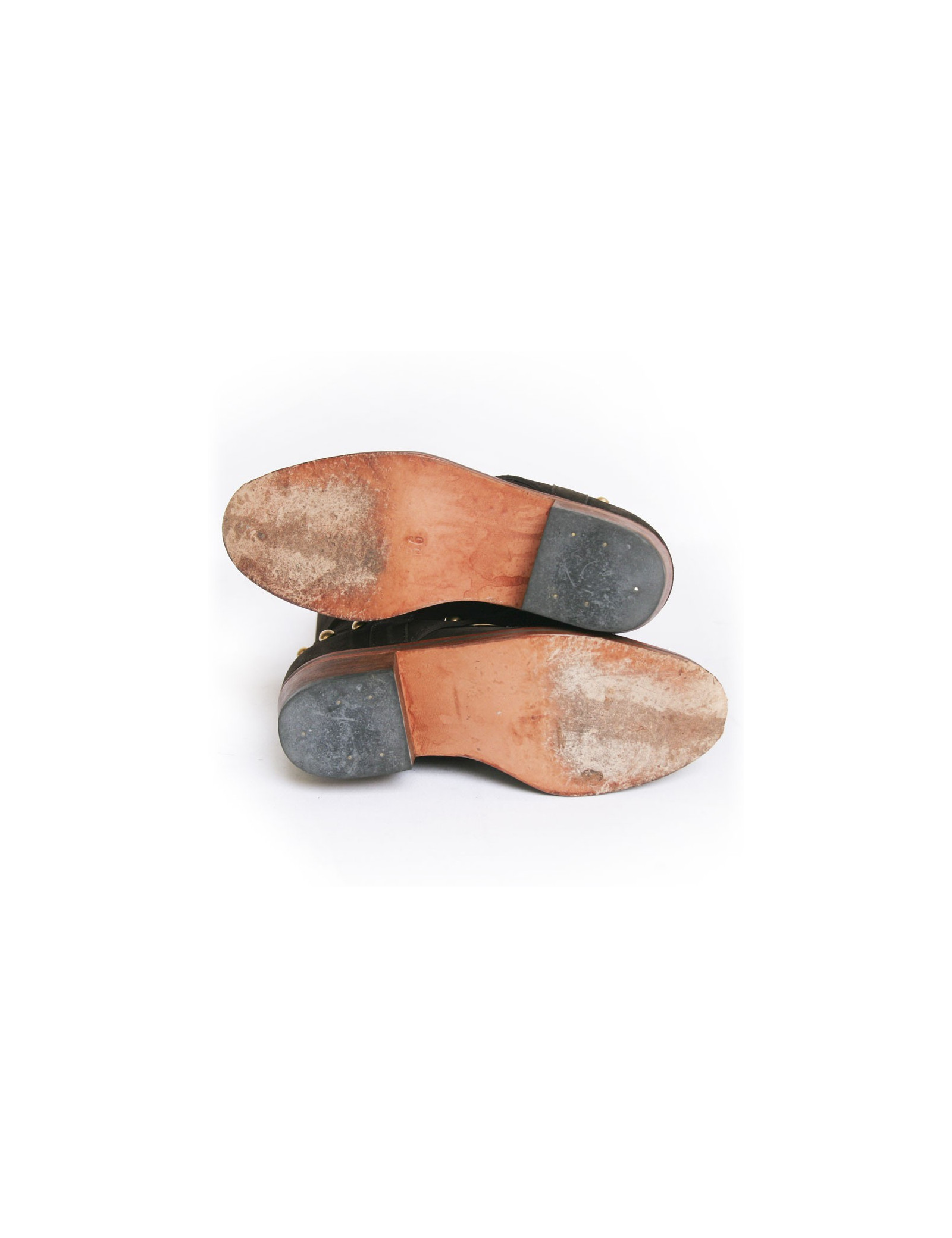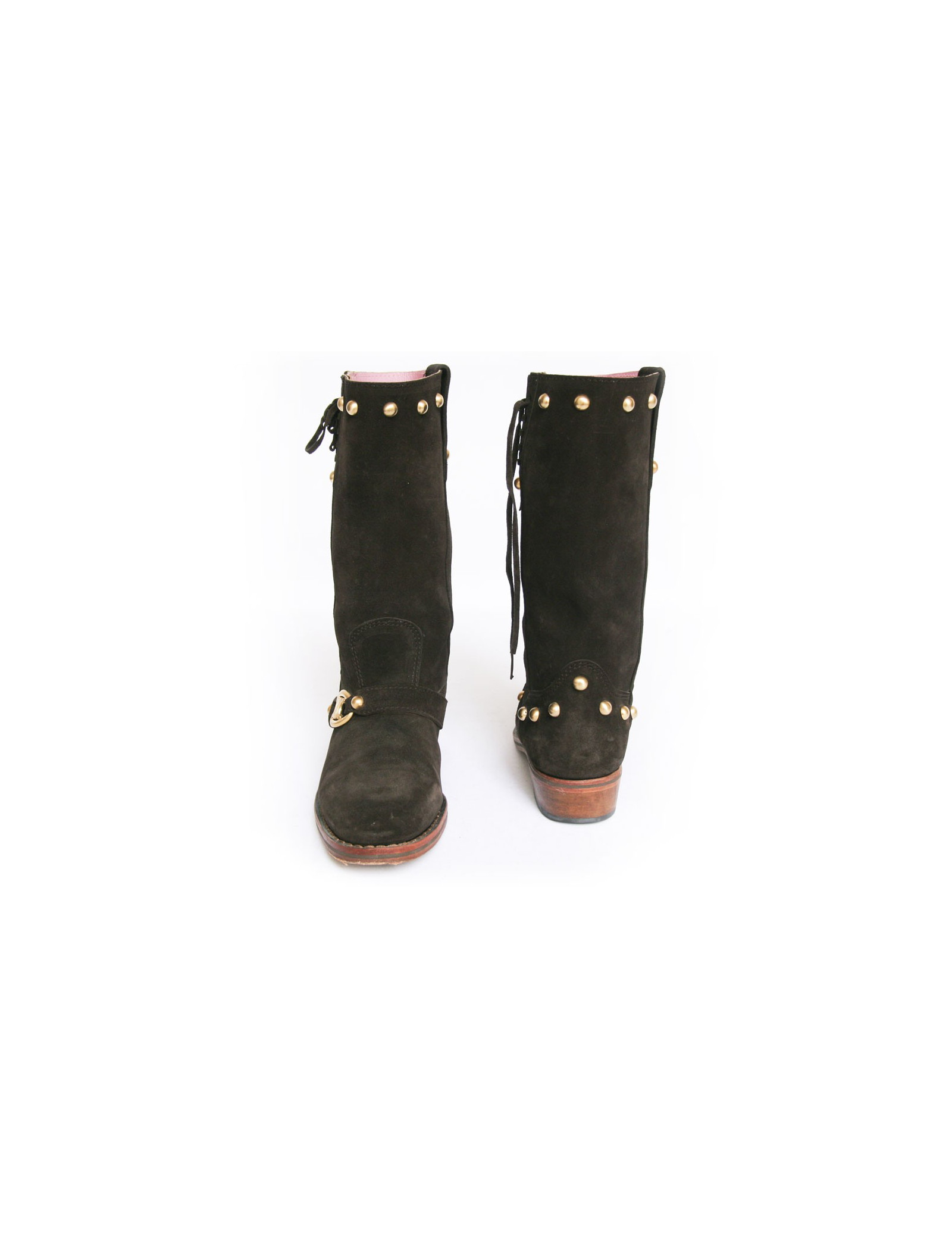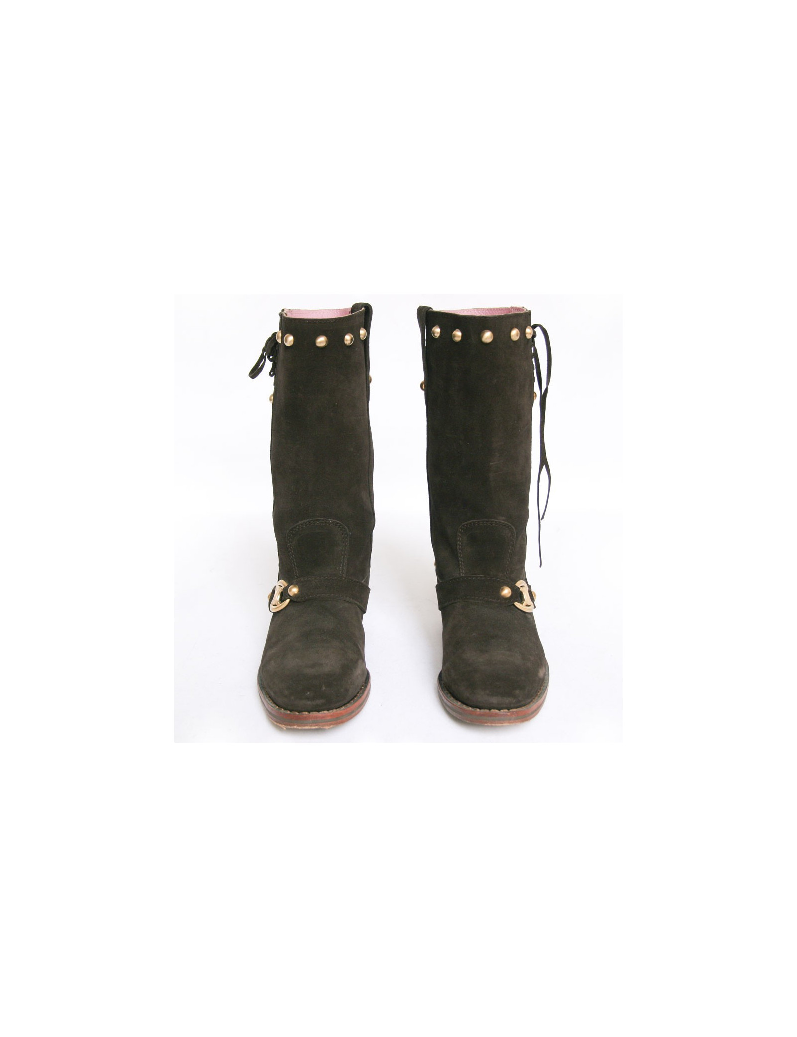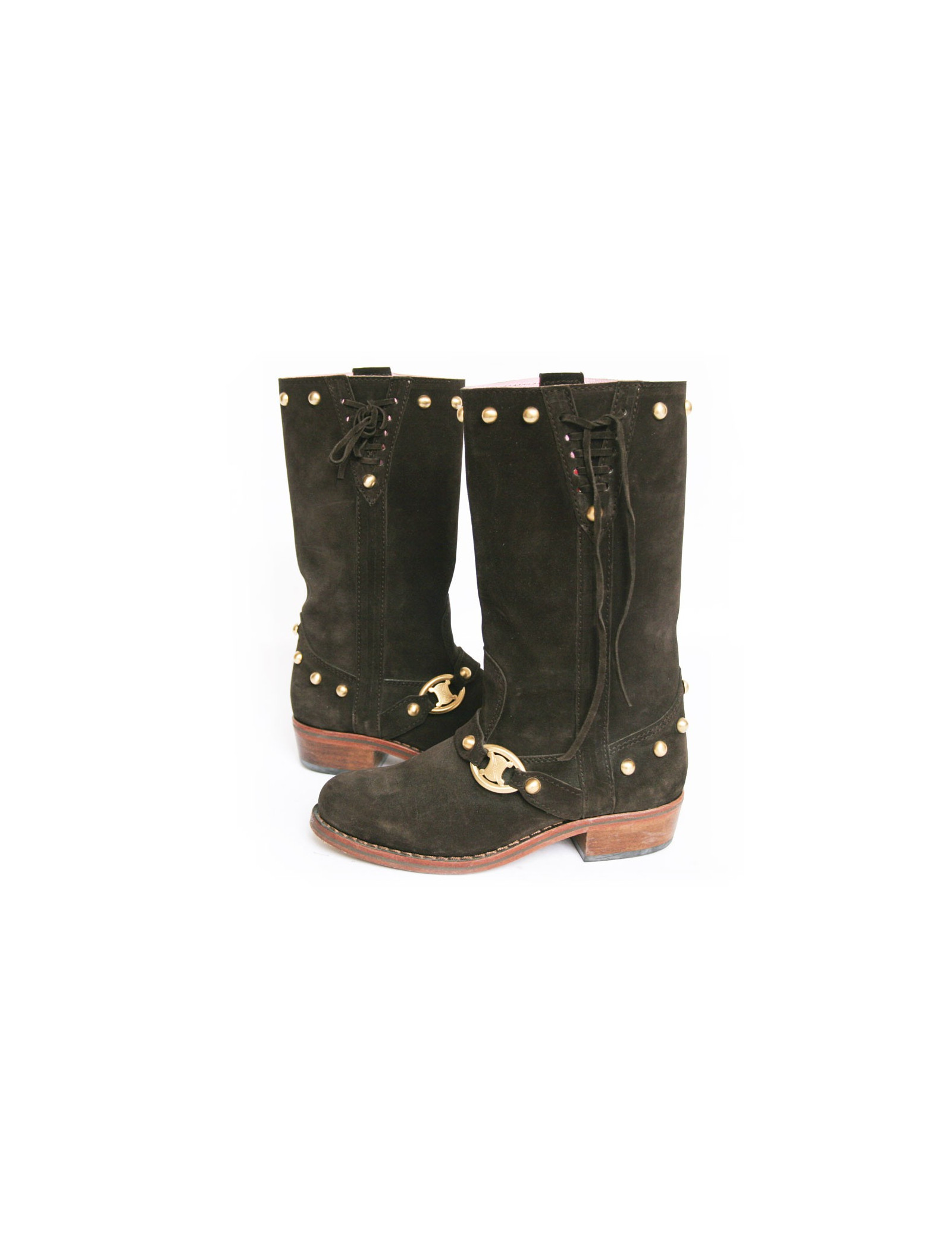 Cette jolie paire de bottes Céline est en veau velours marron. Elles sont cloutées derrière et sur le haut de la botte. Lacées de chaque côté sur le haut. Leur semelle est en cuir. L'intérieur est en cuir rose pâle et le talon est en suèdine. Elles sont en très parfait état. Légère usure du veau velours sur la botte droite sur l'intérieur à cause du frottement. Voir photo.