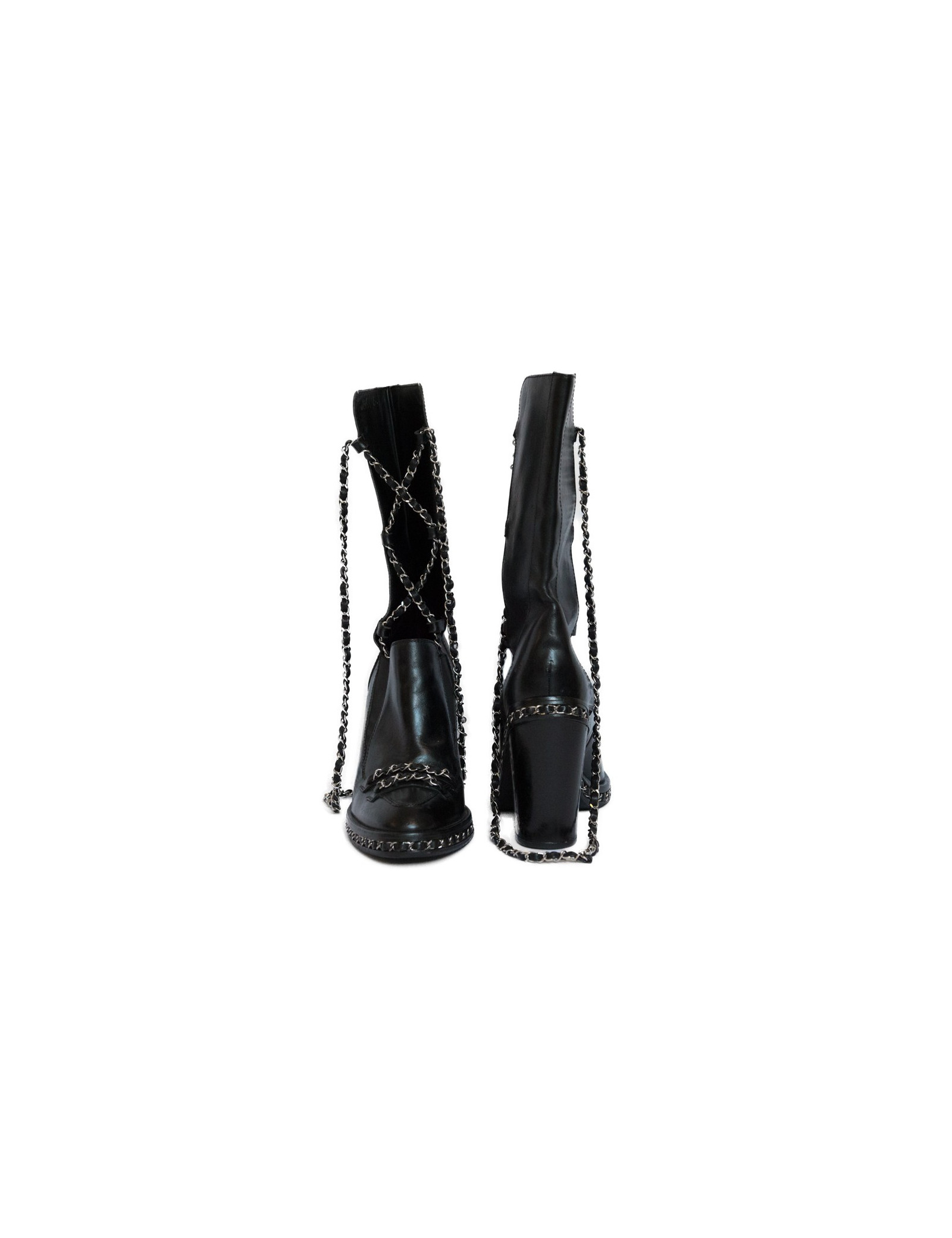 Must have !! Collector ! Paire de boots Chanel ouvertes en cuir noir et ornées de grosses chaines à l'avant. Taille 40. L'esprit Karl !!! avec le style rock en plus.