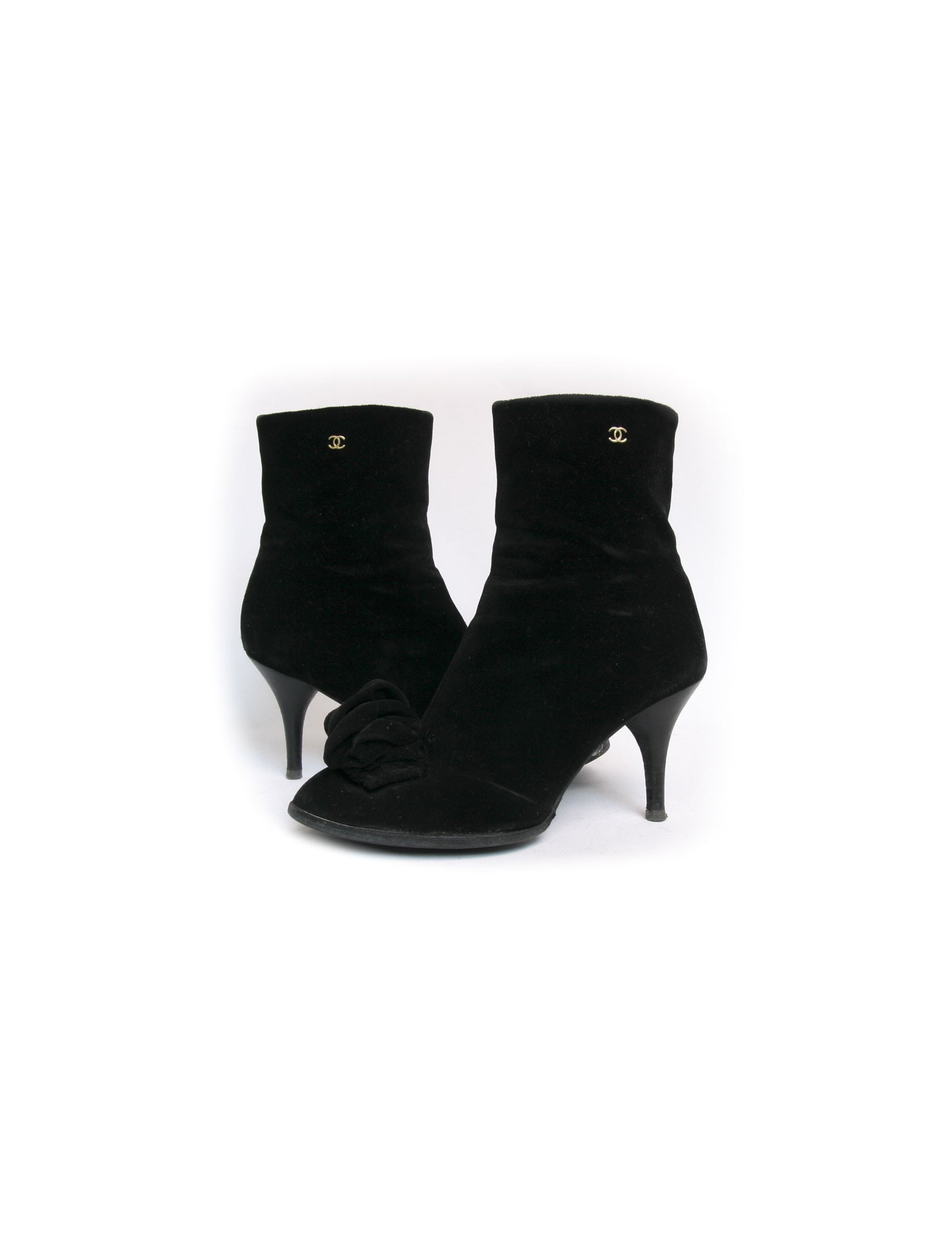 Boots à talons Chanel en velours noir. Taille 39,5. Fermeture zippée à l'intérieur de la chaussure. Le sigle "CC" en métal doré figure sur l'extérieur en haut. En très bon état. Quelques légères marques d'usure se trouve sur les boots mais très peu visible.