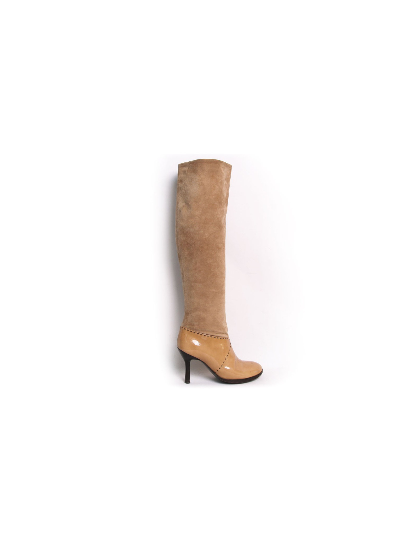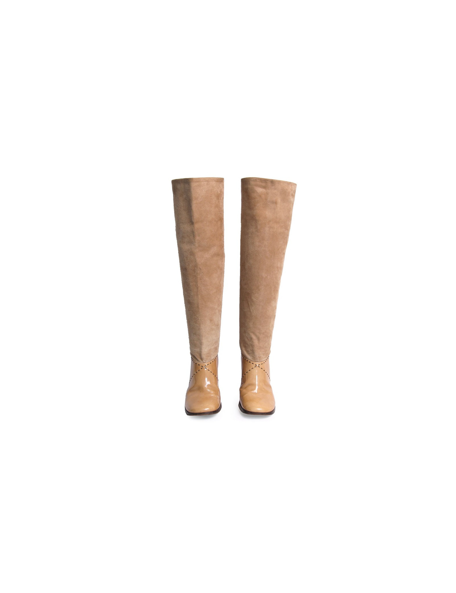 Ces bottes à talons Chanel sont en cuir verni et daim beige. C'est une taille 39,5. Les surpiqûres sont marron foncé. Elles ont un talon fin et le bout arrondi. Le logo "CHANEL" est inscrit en haut à l'extérieur de chaque botte. Elles sont en bon état. On observe de petites traces noires sur le daim de la chaussure gauche mais très peu visibles. De légères pliures d'usure d'usage à l'avant des bottes est visible ( Voir photos ).
