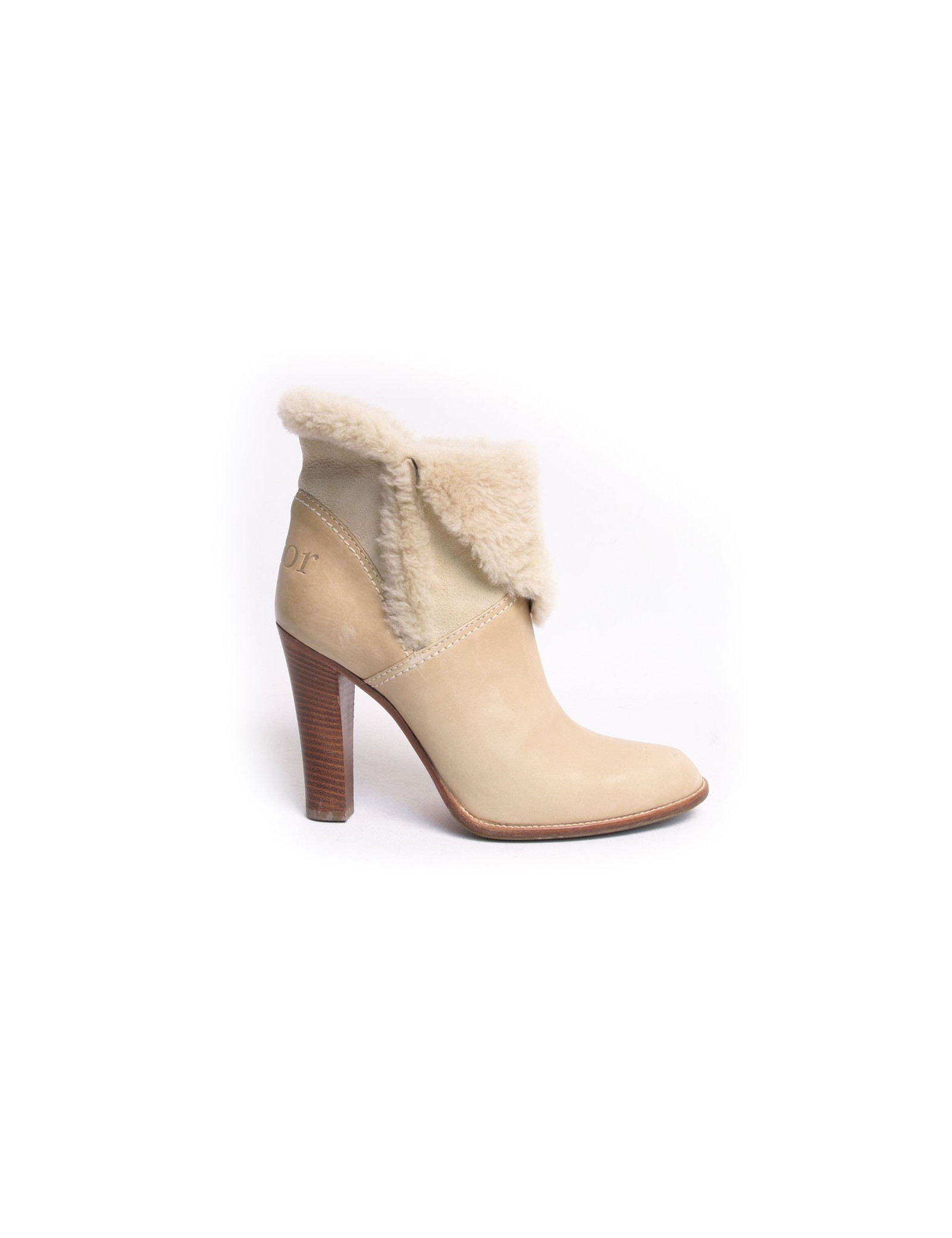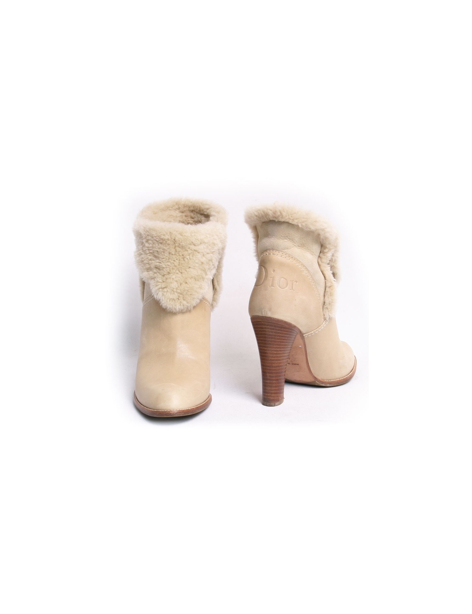 Boots à talons Dior en peau retournée et cuir beige. Taille 39. Une inscription "DIOR" figure à l'arrière au niveau du talon. En très bon état. Légère griffure sur le pied droit. Voir photos.