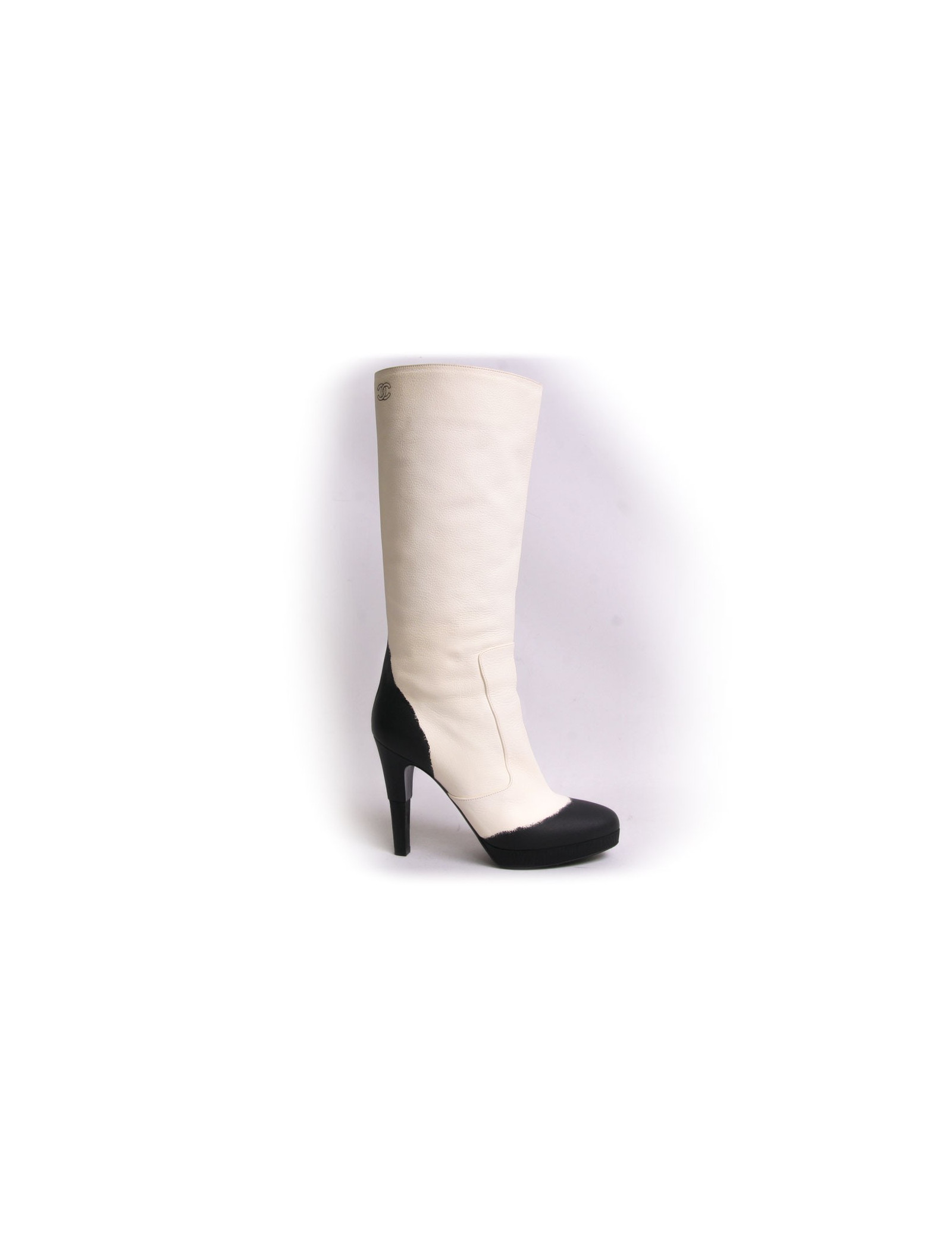 Superbe paire de bottes Chanel en cuir beige et noir. Taille 40. La couleur noire à l'avant et à l'arrière de la botte donne un aspect comme si la chaussure avait été peinte. En très bon état. Très peu portées.