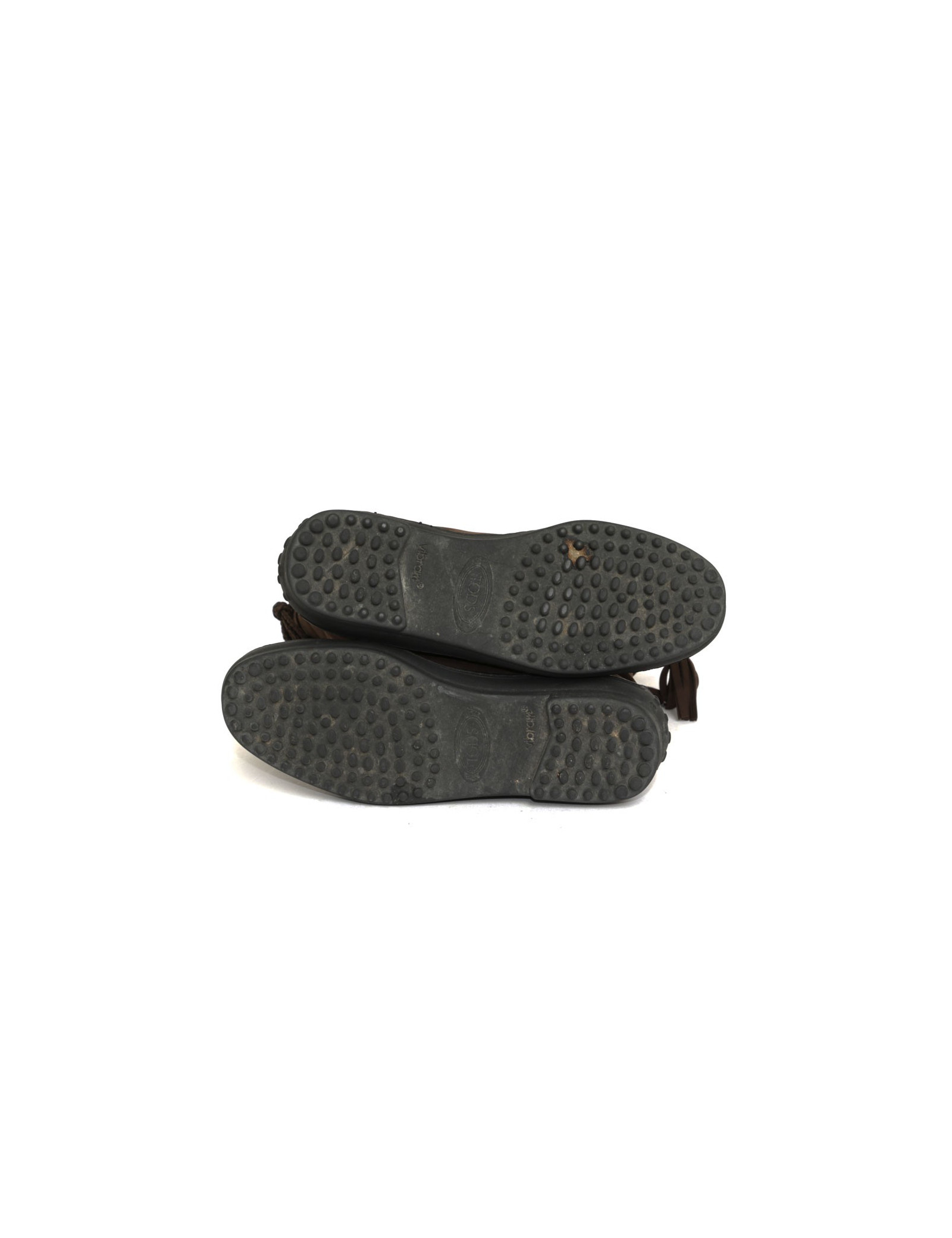 Bottes plates en daim marron TOD's. C'est une taille 36. La semelle est en caoutchouc à picots. L'intérieur est doublée en cuir marron. Elles sont en très bon état. Elles ont deux petits pompons à l'arrière de la chaussure (voir photo).