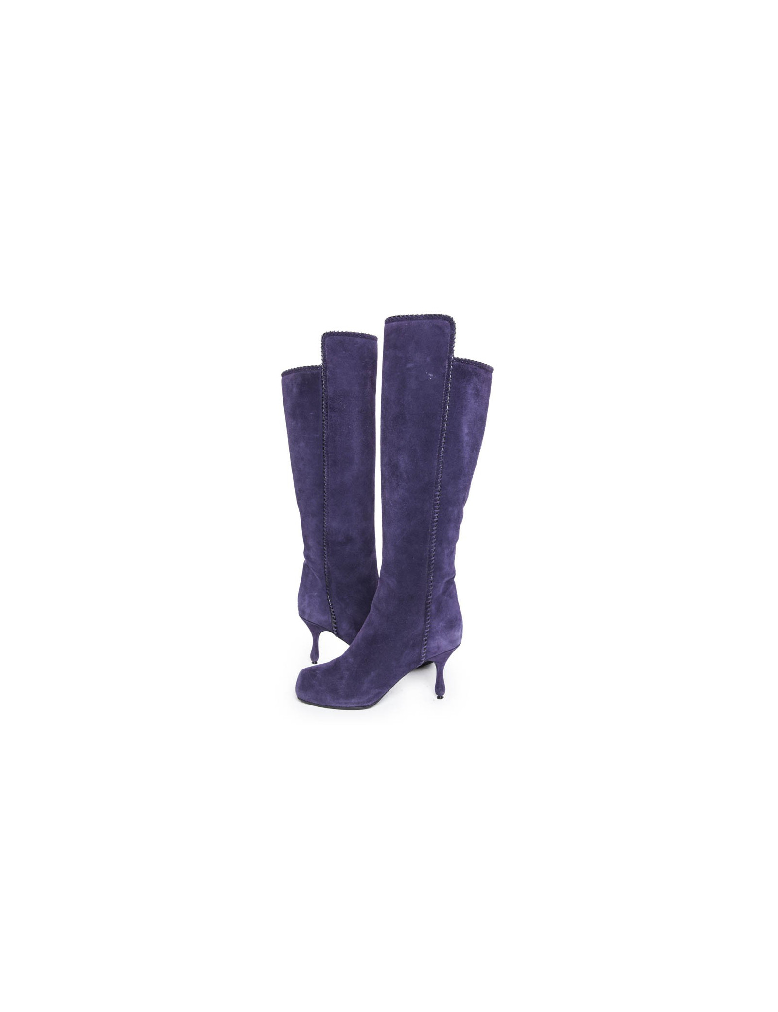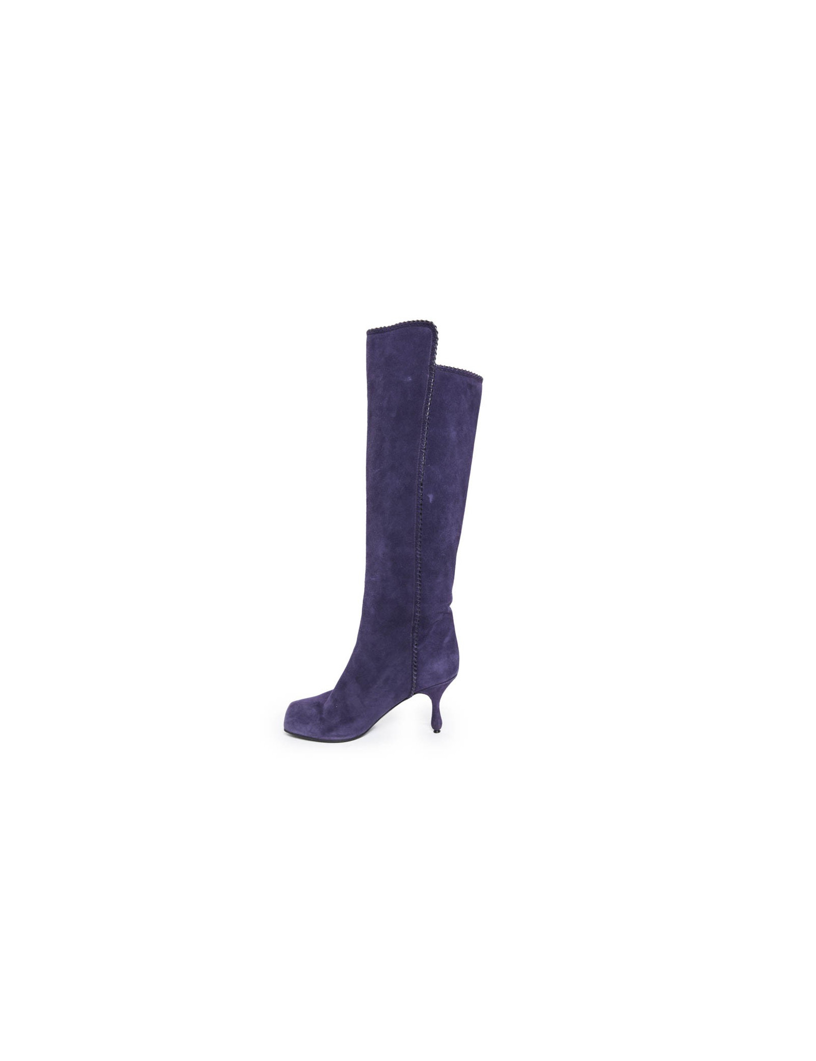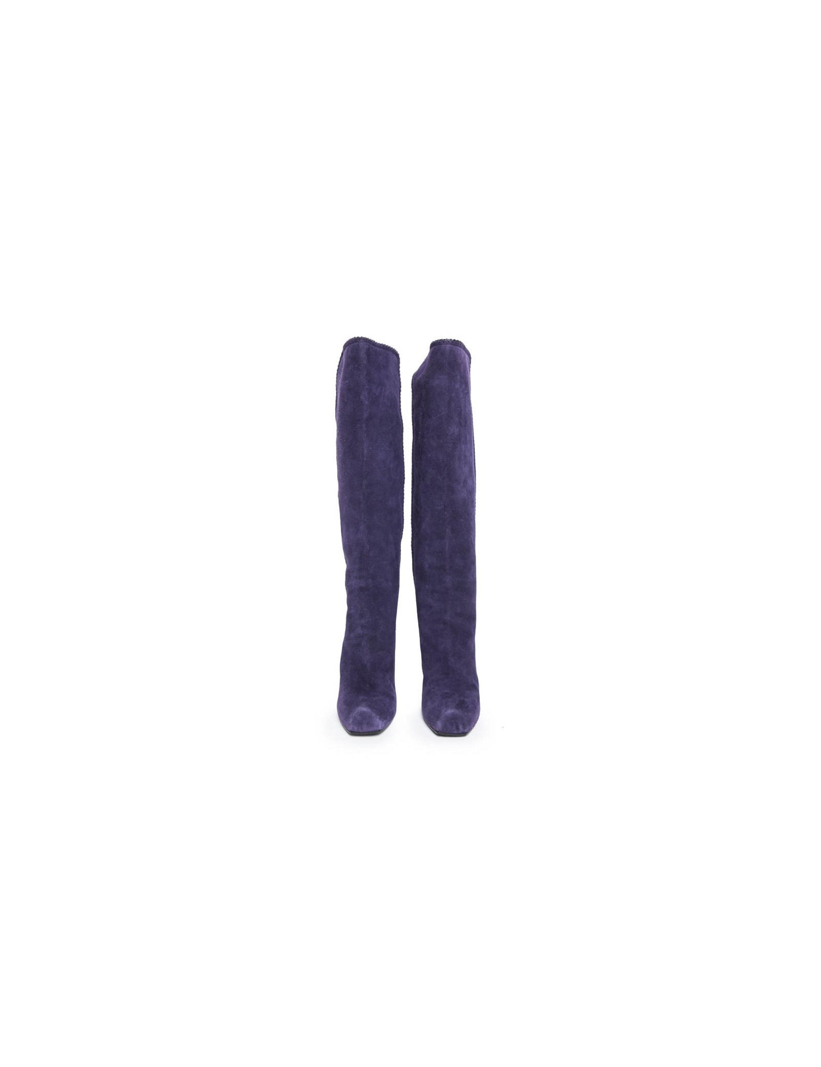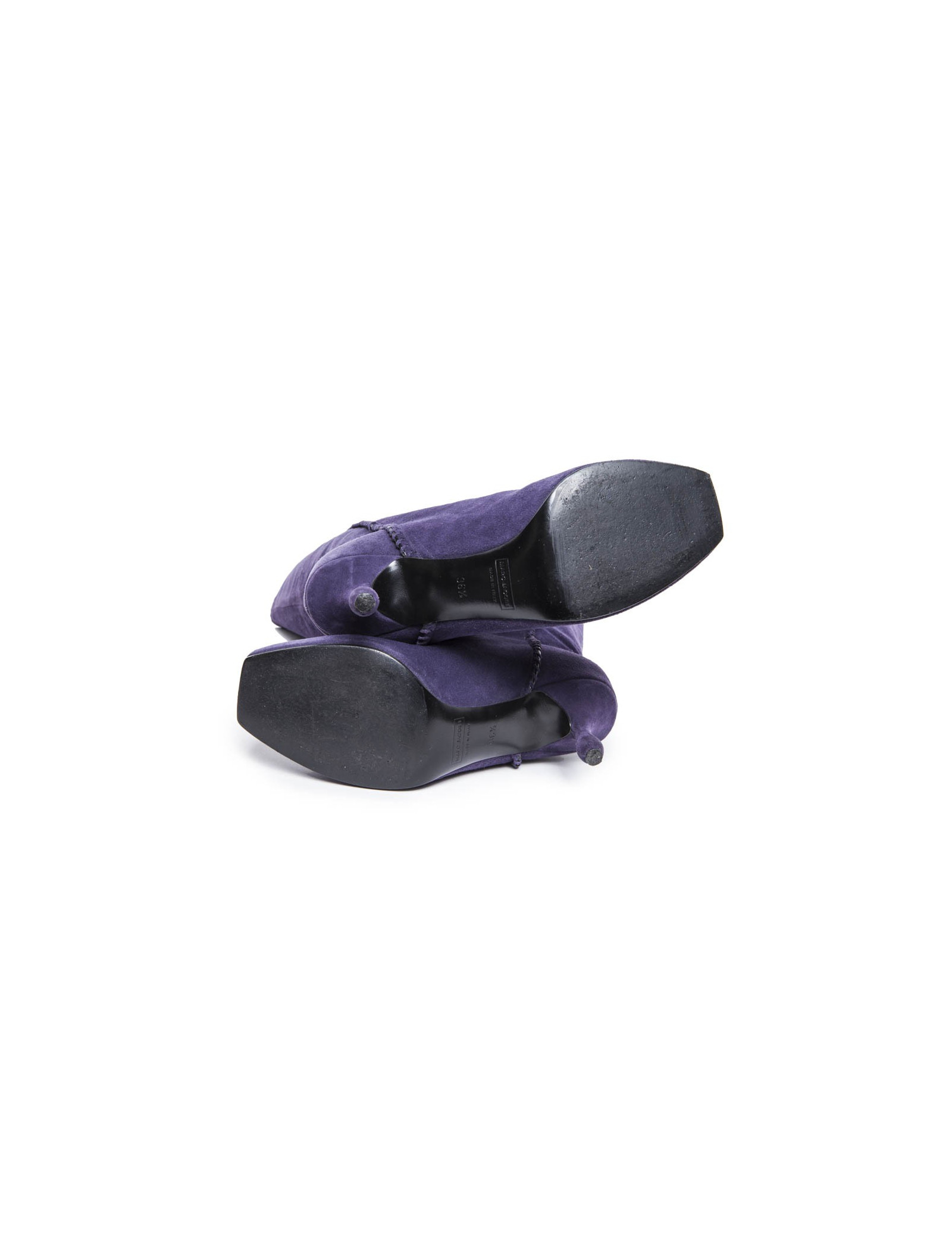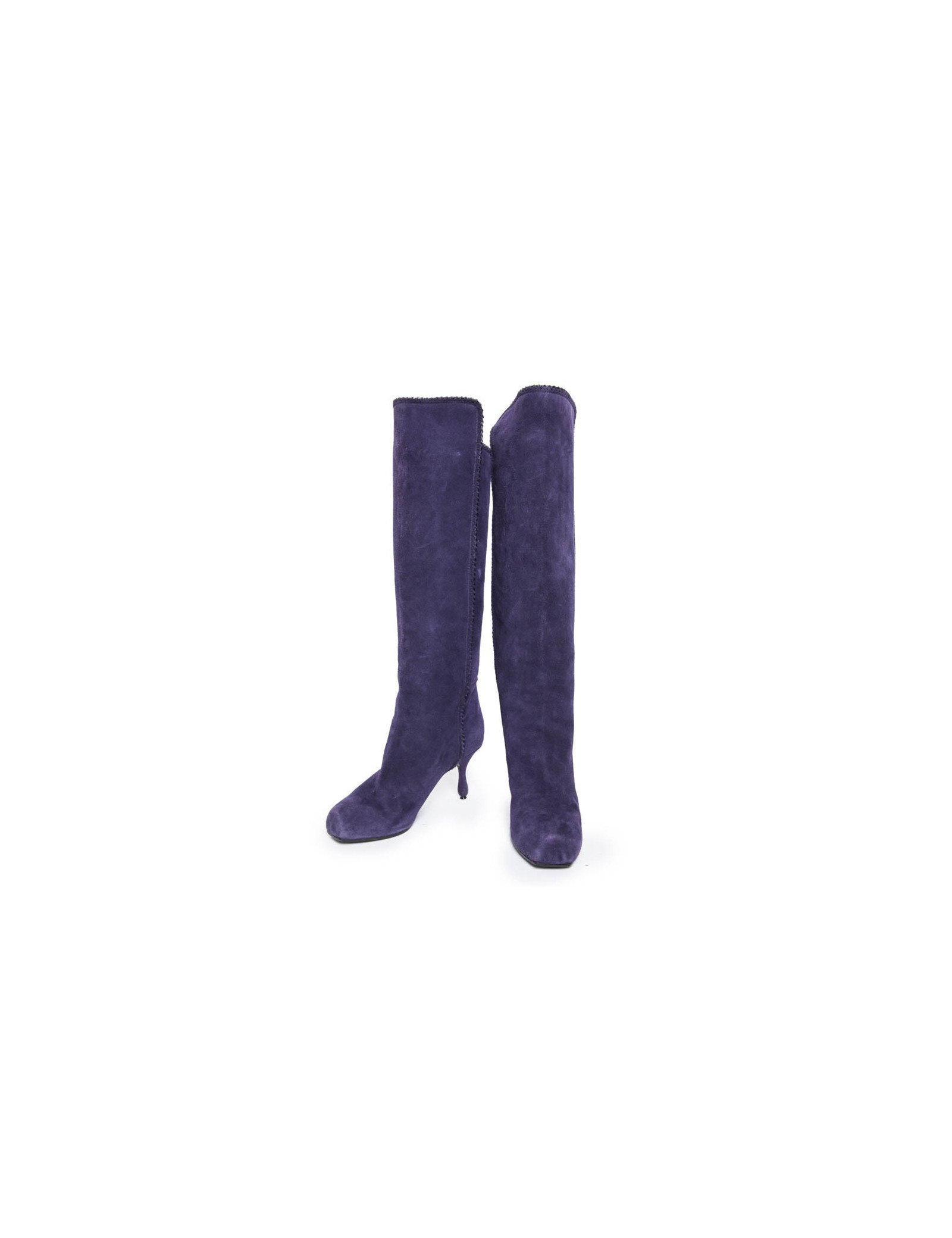 Ces bottes MARC JACOBS sont en veau velours de couleur violet. C'est une  Taille 36,5 FR. Elles sont en très bon état. On remarque de légères marques d'usure sur les talons et à l'avant dû au frottement. Il y a un léger accro sur la chaussure gauche en bas. L'intérieur est doublé en cuir noir.