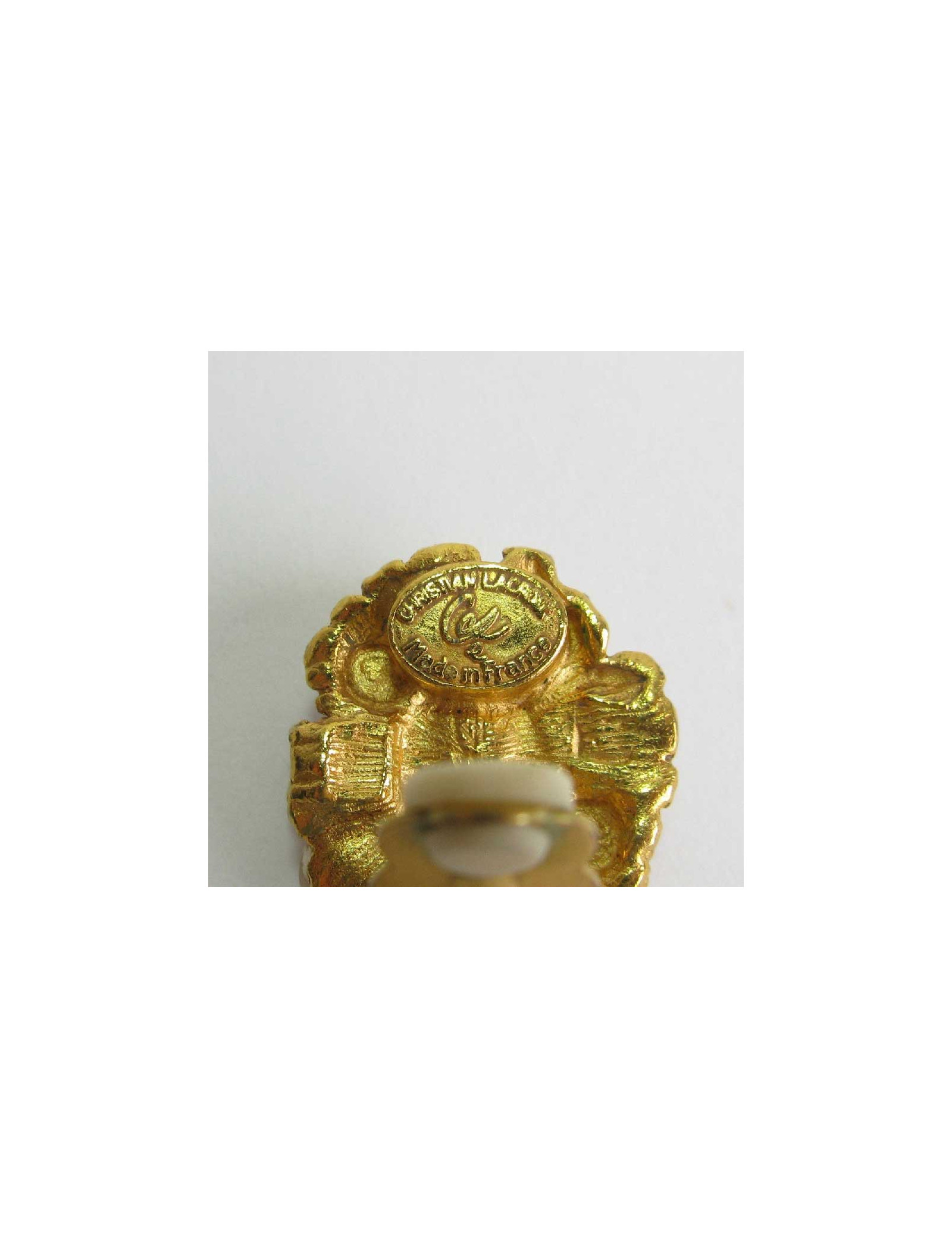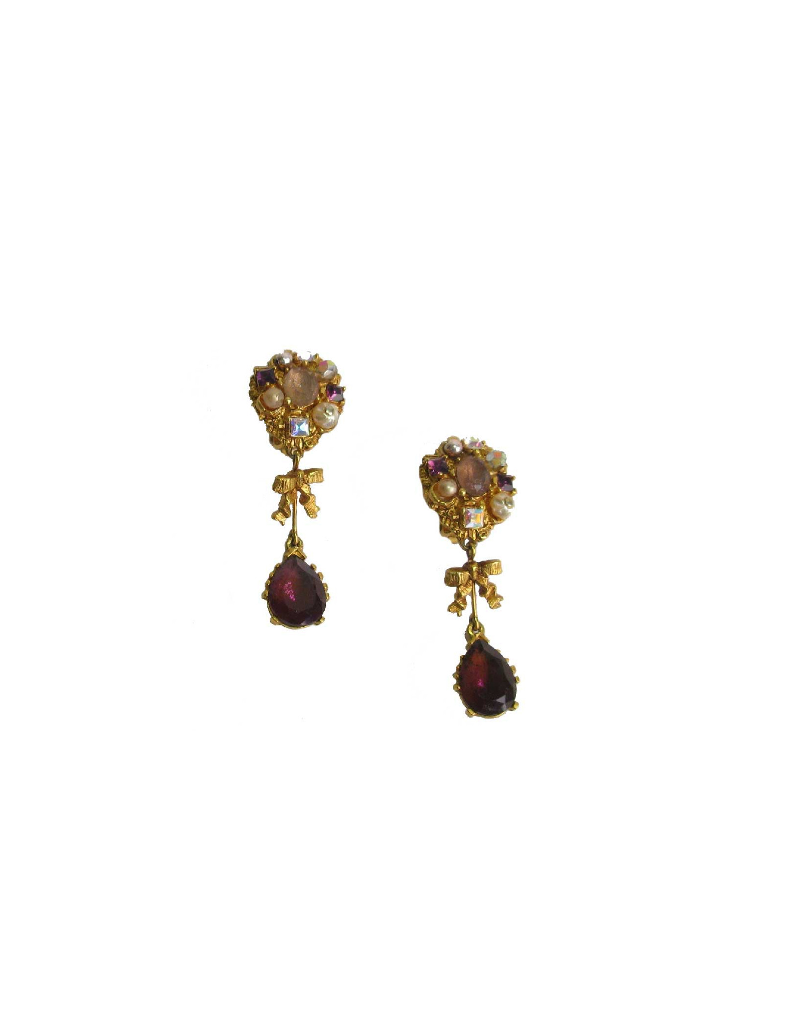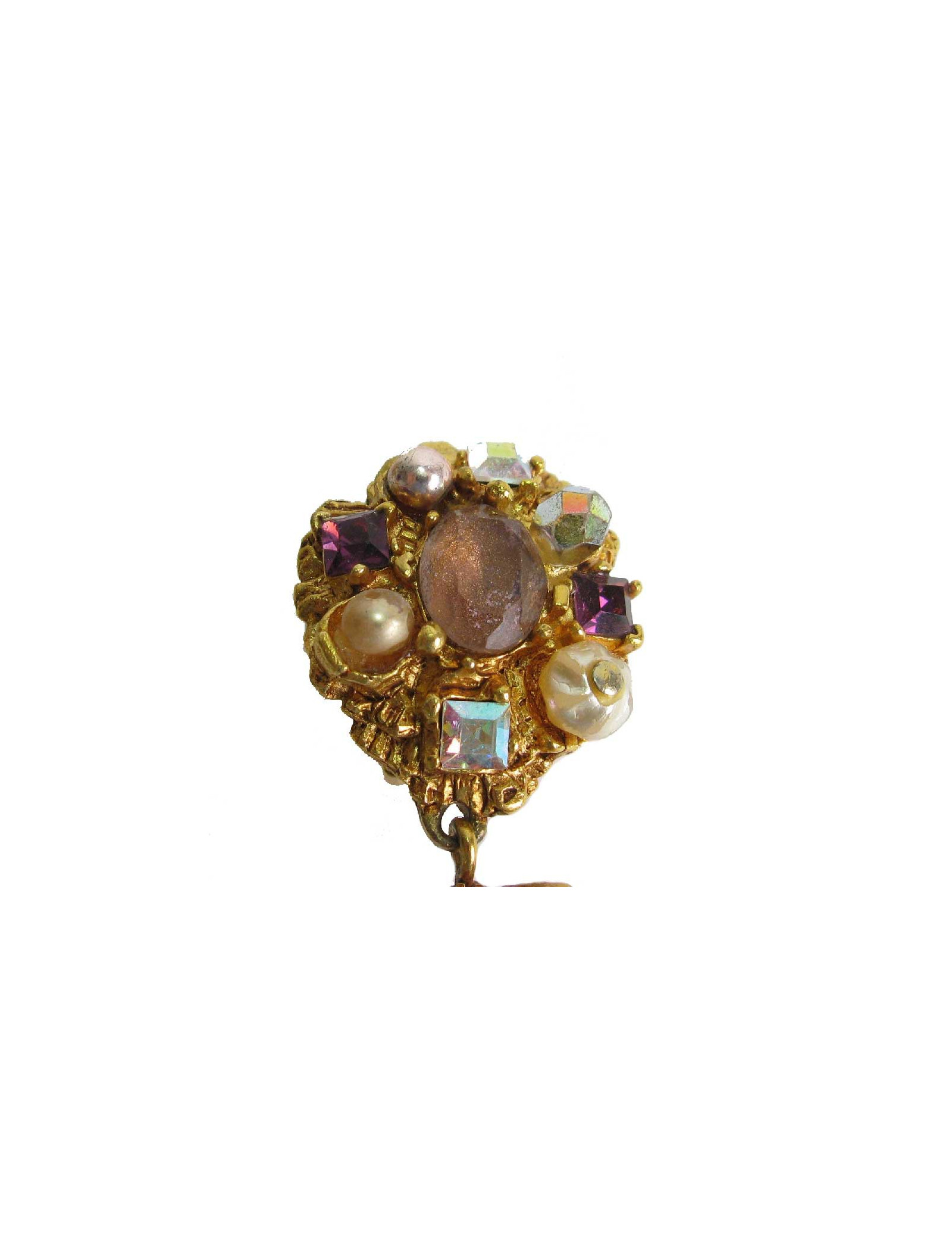 Boucles d'oreille clips pendants Christian Lacroix en métal doré et pierres fantaisies. En bon état. De petits éclats sur les perles nacrées.