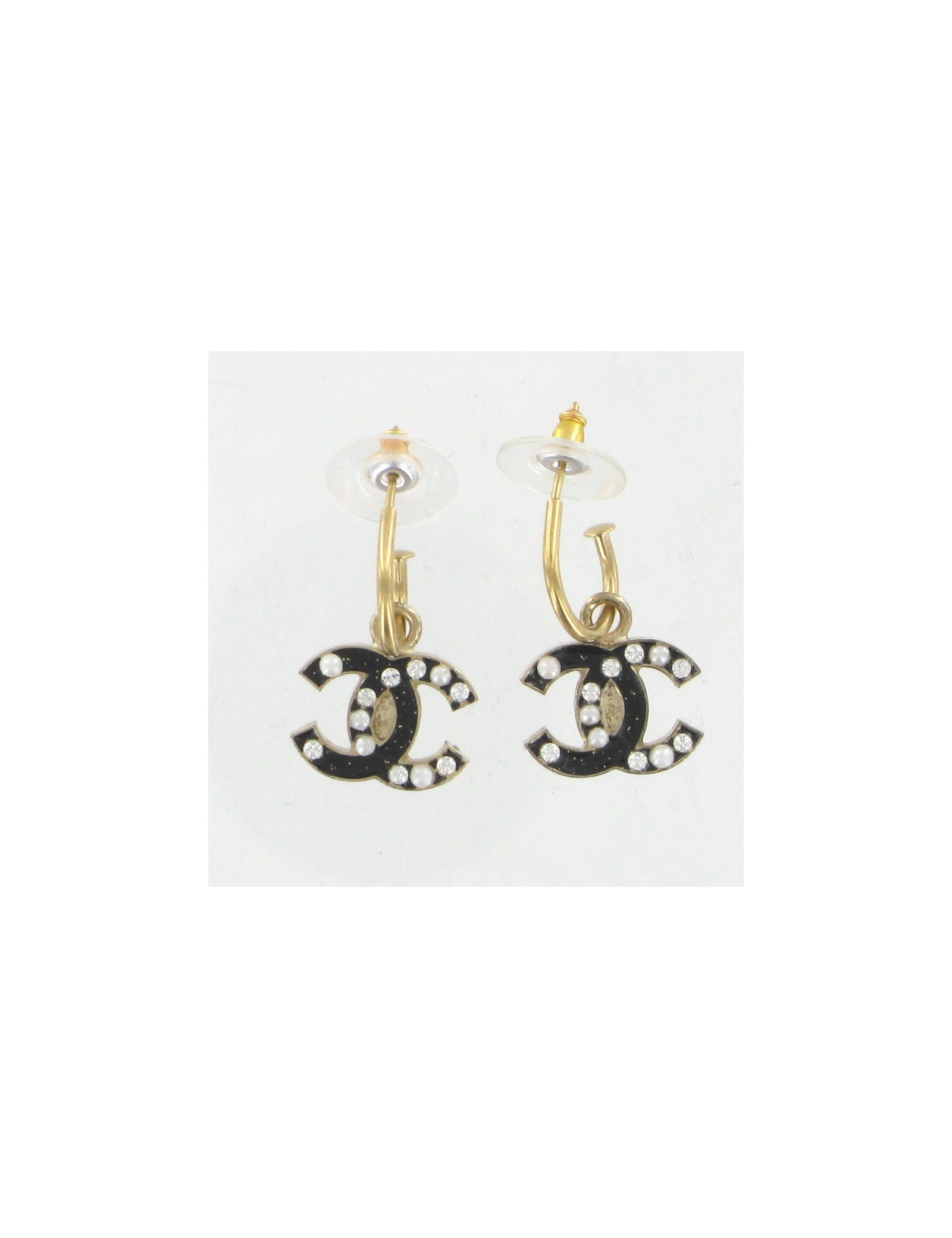 Créoles CC CHANEL émail noir, strass et perles nacrées