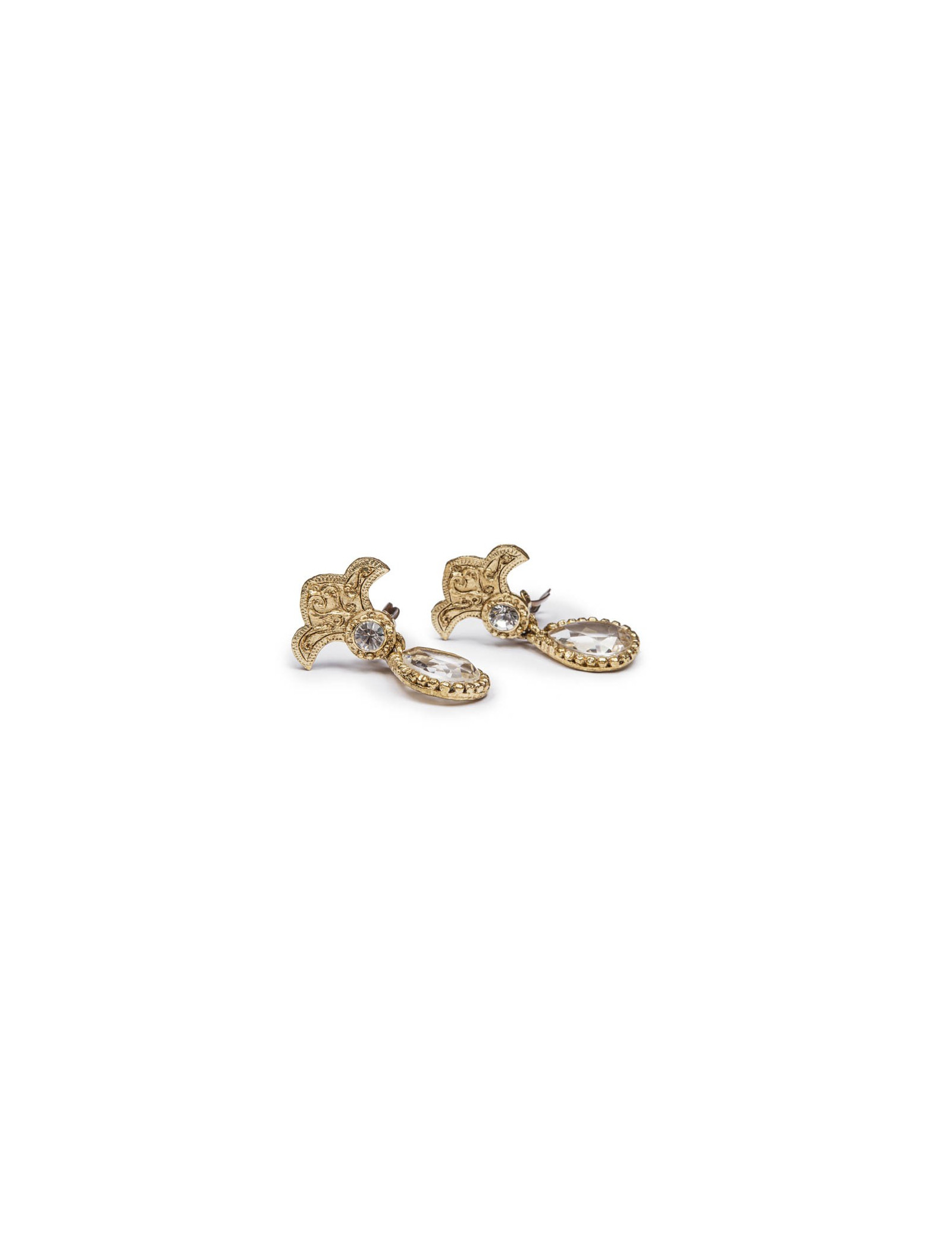 Vintage ! Boucles d'oreille pendantes clips Christian Lacroix en métal doré mat, cabochons brillants Swarovski.
