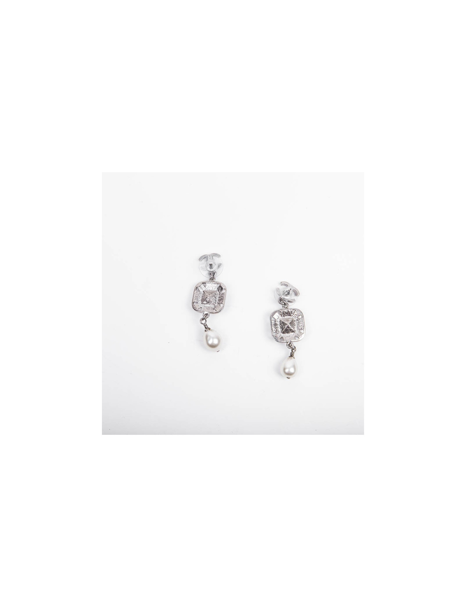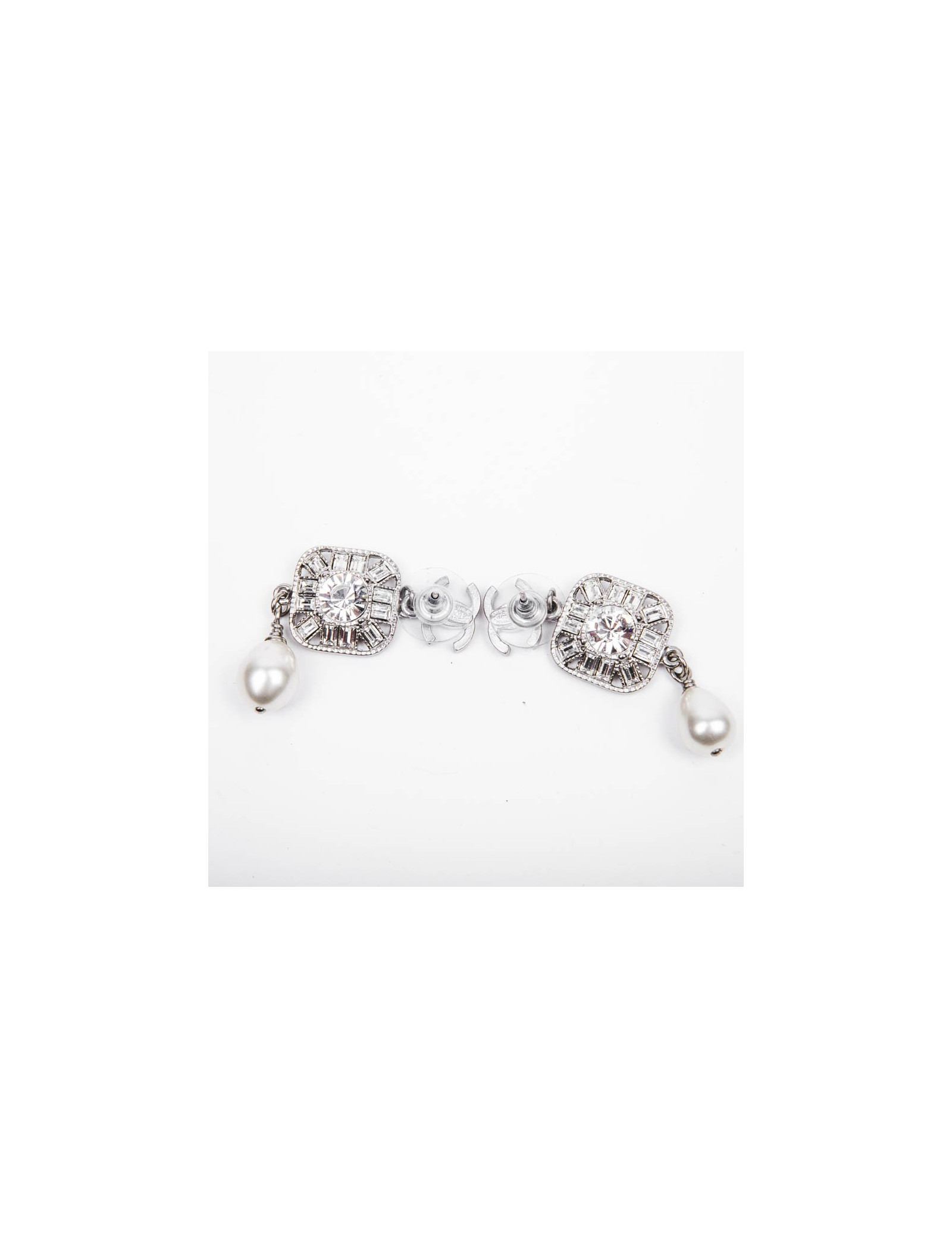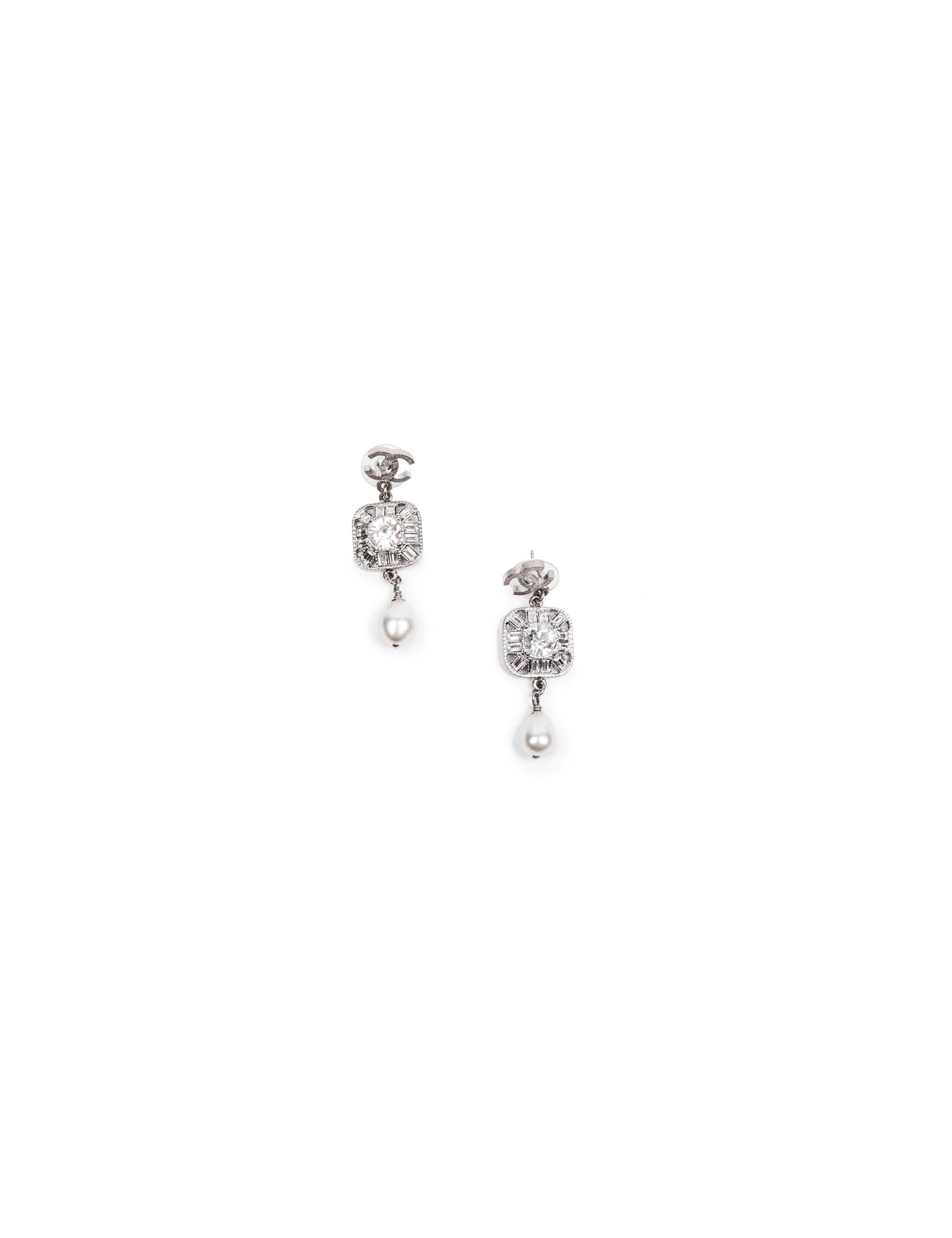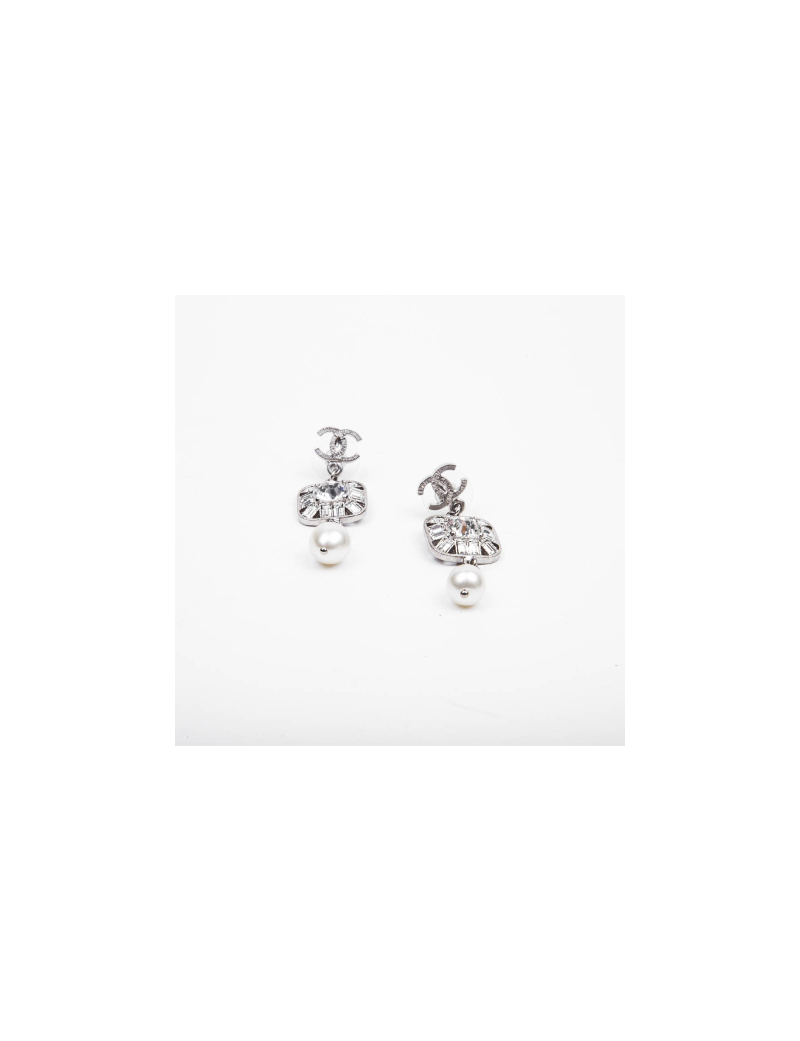 Boucles d'oreilles pendantes Chanel en métal argent palladié, brillants, strass et perles nacrées siglées double "C".