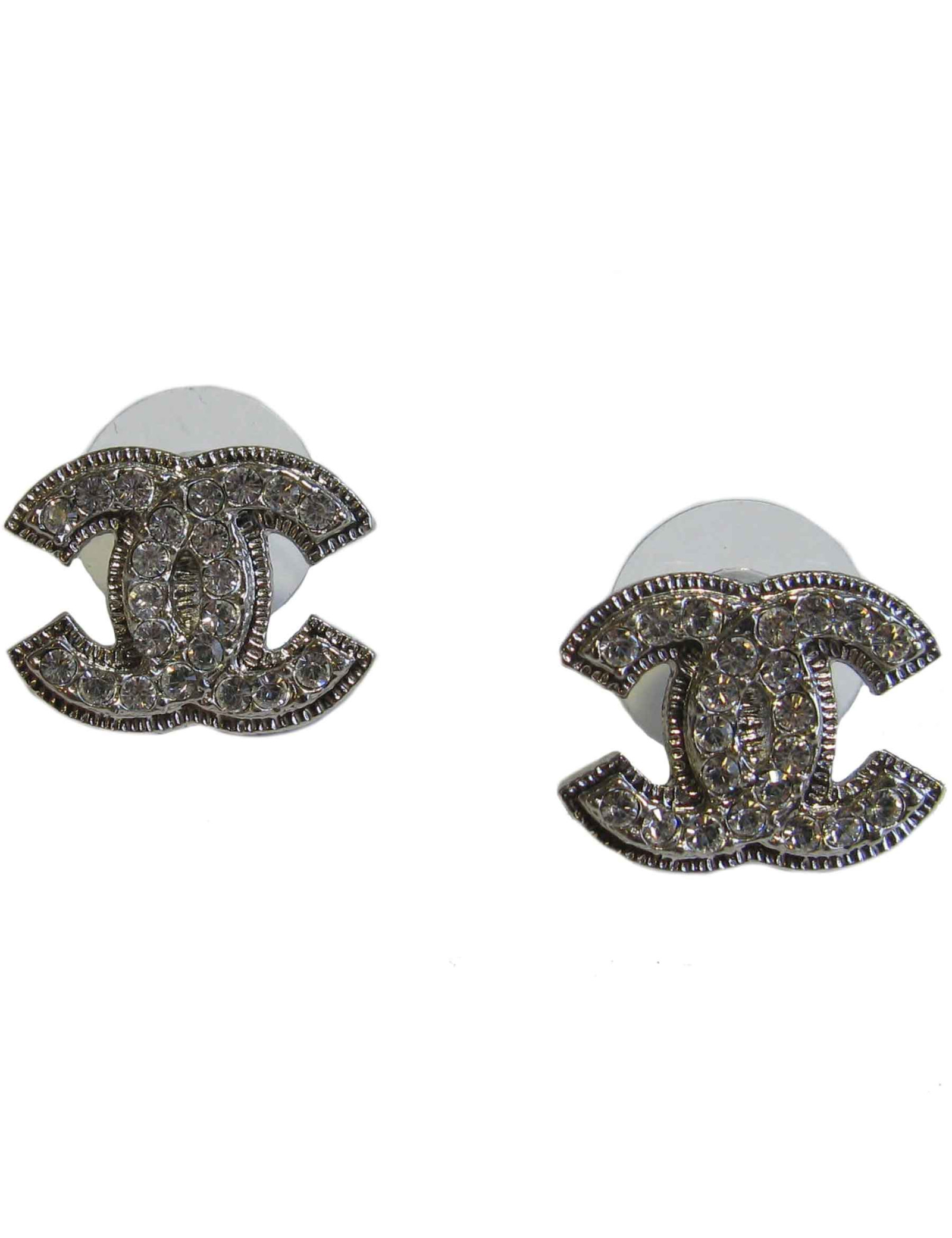 Les boucles d'oreilles clous Chanel indémodables : le modèle CC entièrement en strass et métal argenté sont des pièces indispensables dans un dressing.