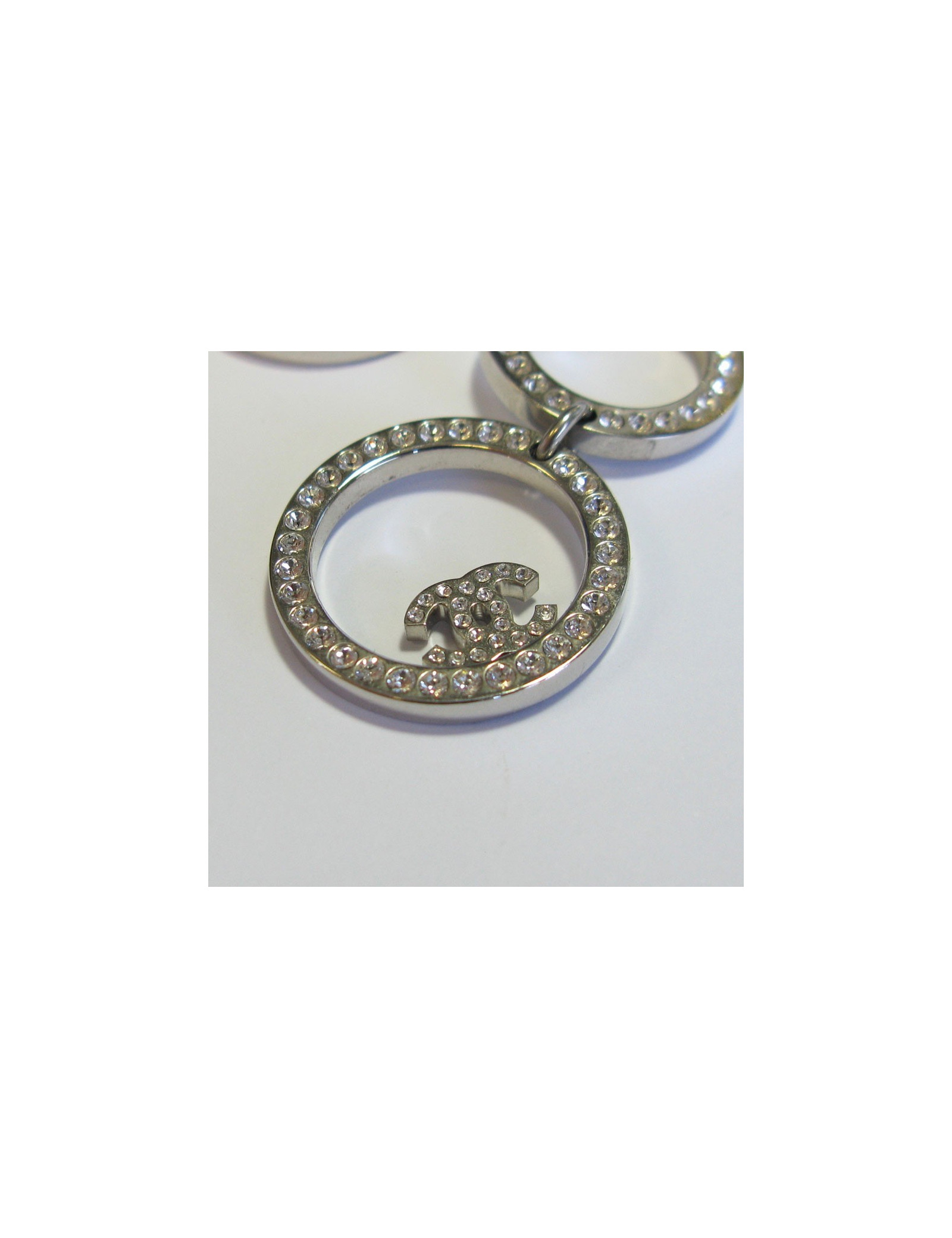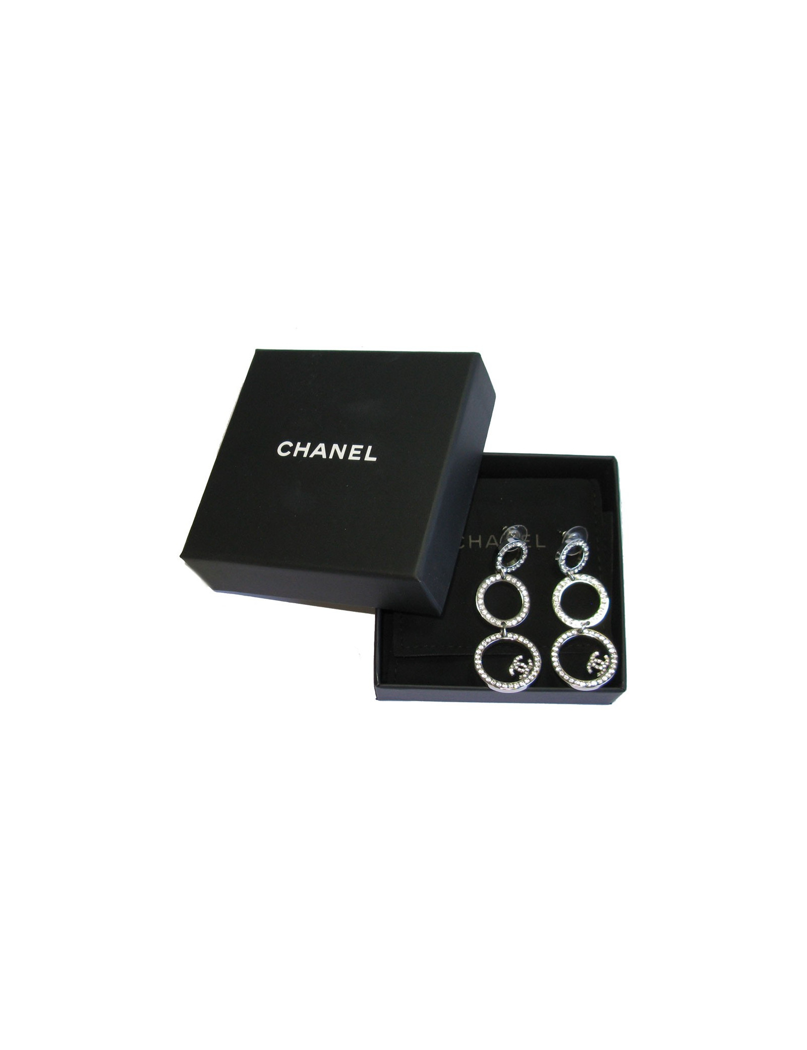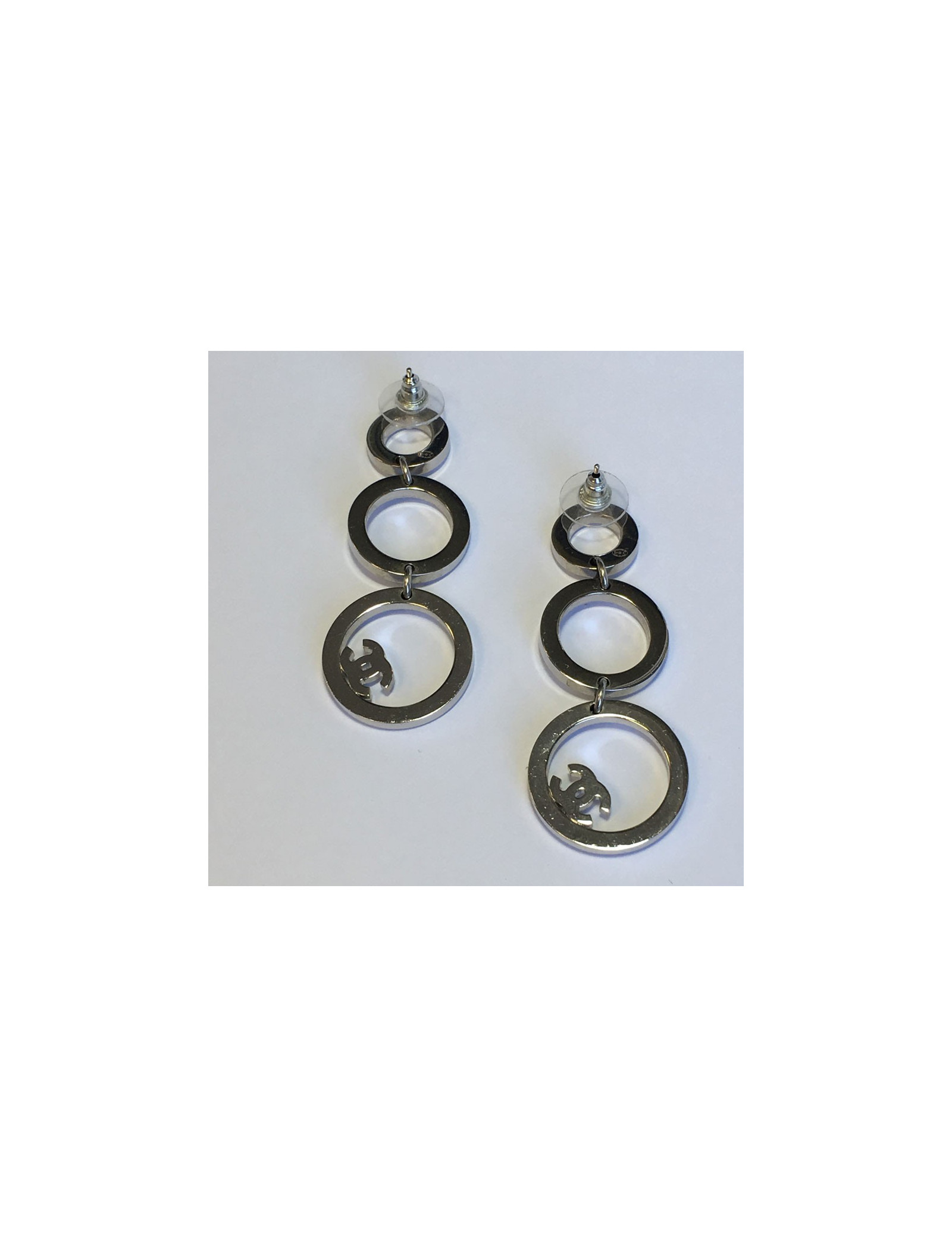 Série limitée. Très belle paire de boucles d'oreilles clous Chanel pendantes. Trois anneaux en métal argenté sertis de strass blancs ainsi que d'un petit CC sur le plus gros anneau.