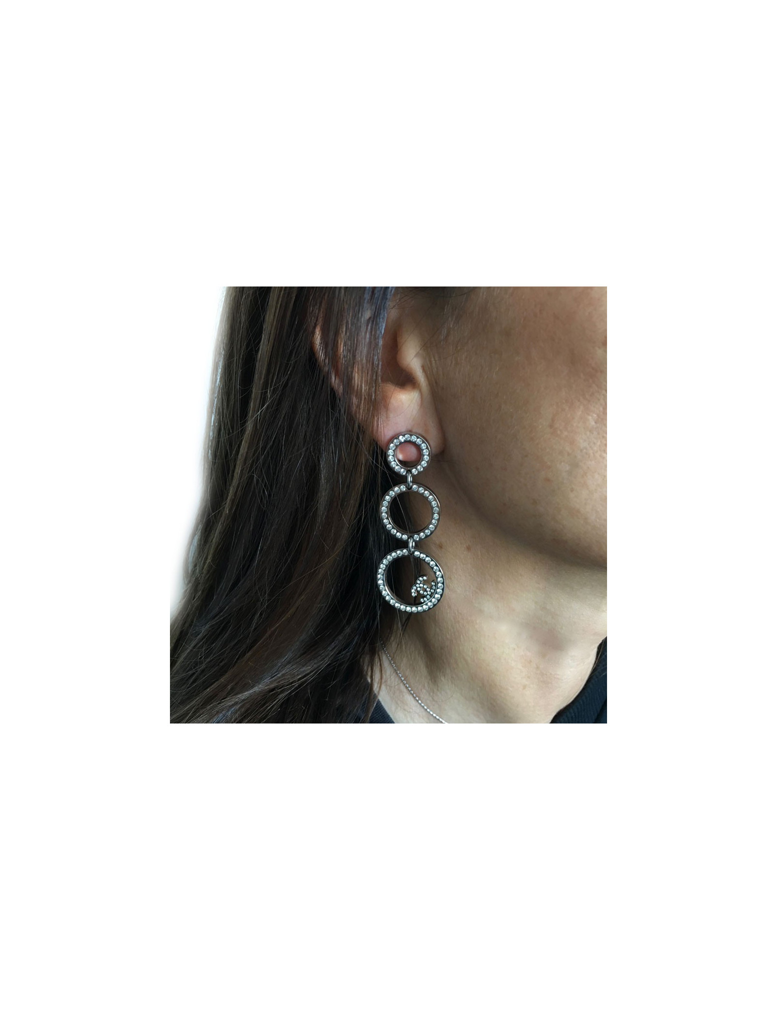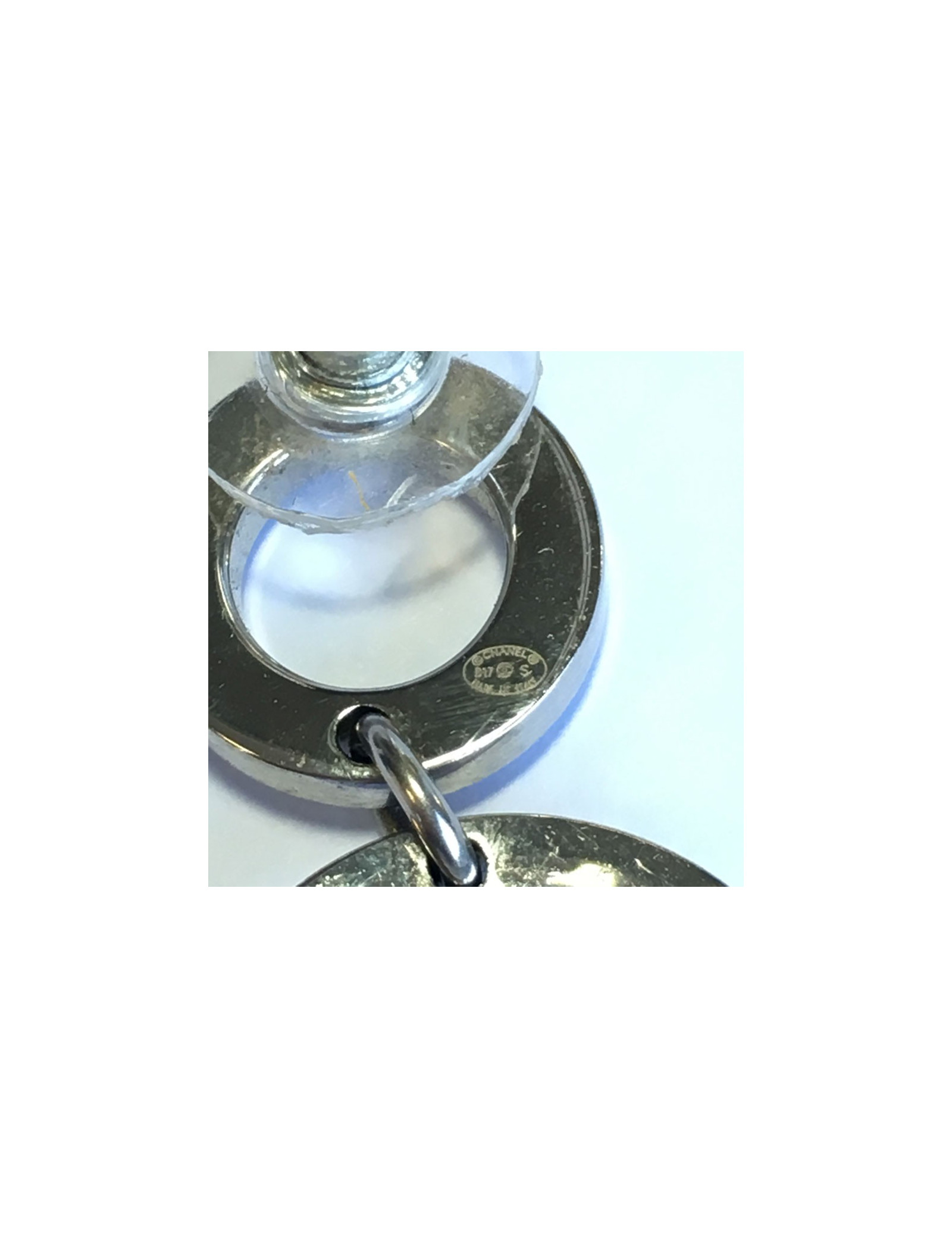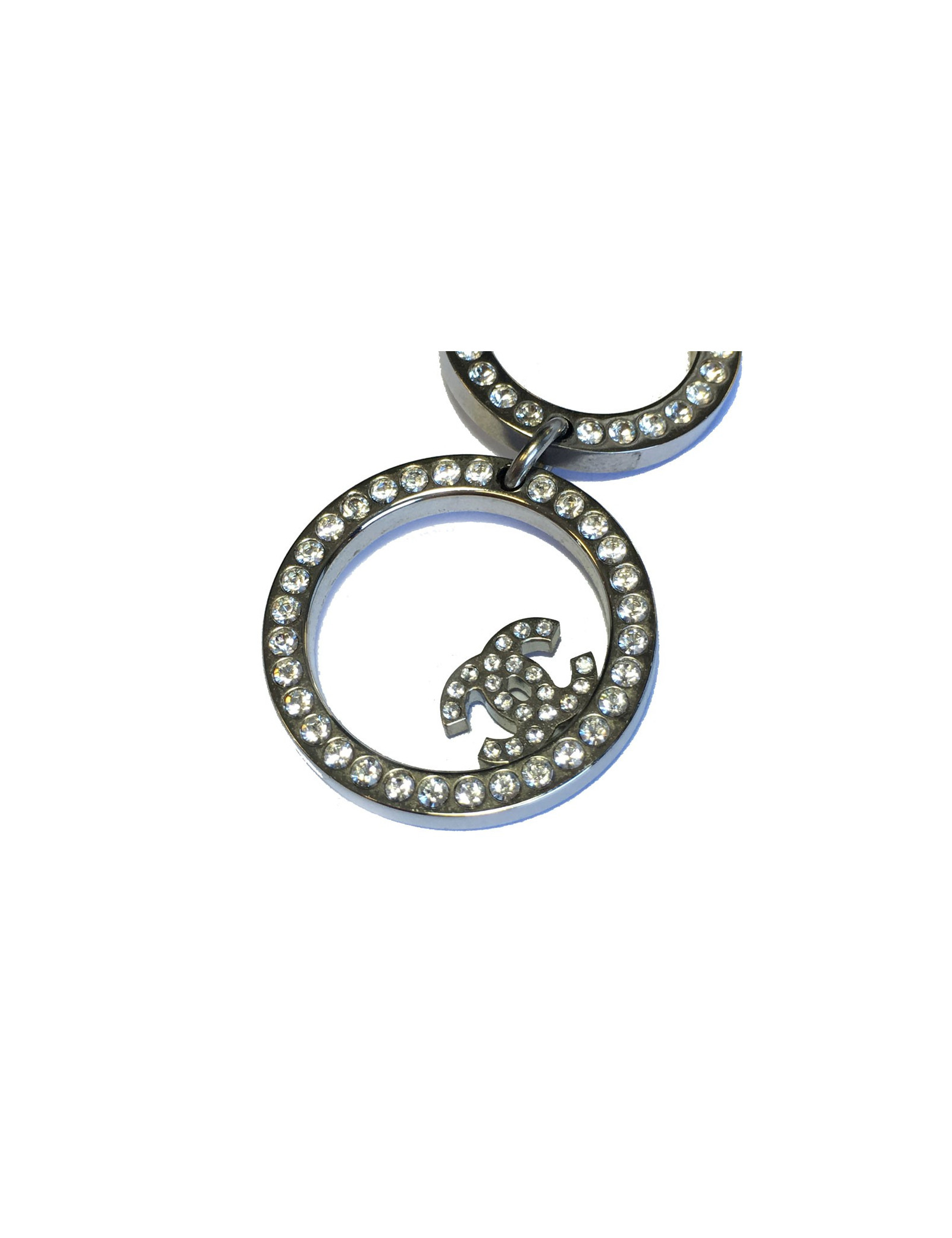 Série limitée. Très belle paire de boucles d'oreilles clous Chanel pendantes. Trois anneaux en métal argenté sertis de strass blancs ainsi que d'un petit CC sur le plus gros anneau.