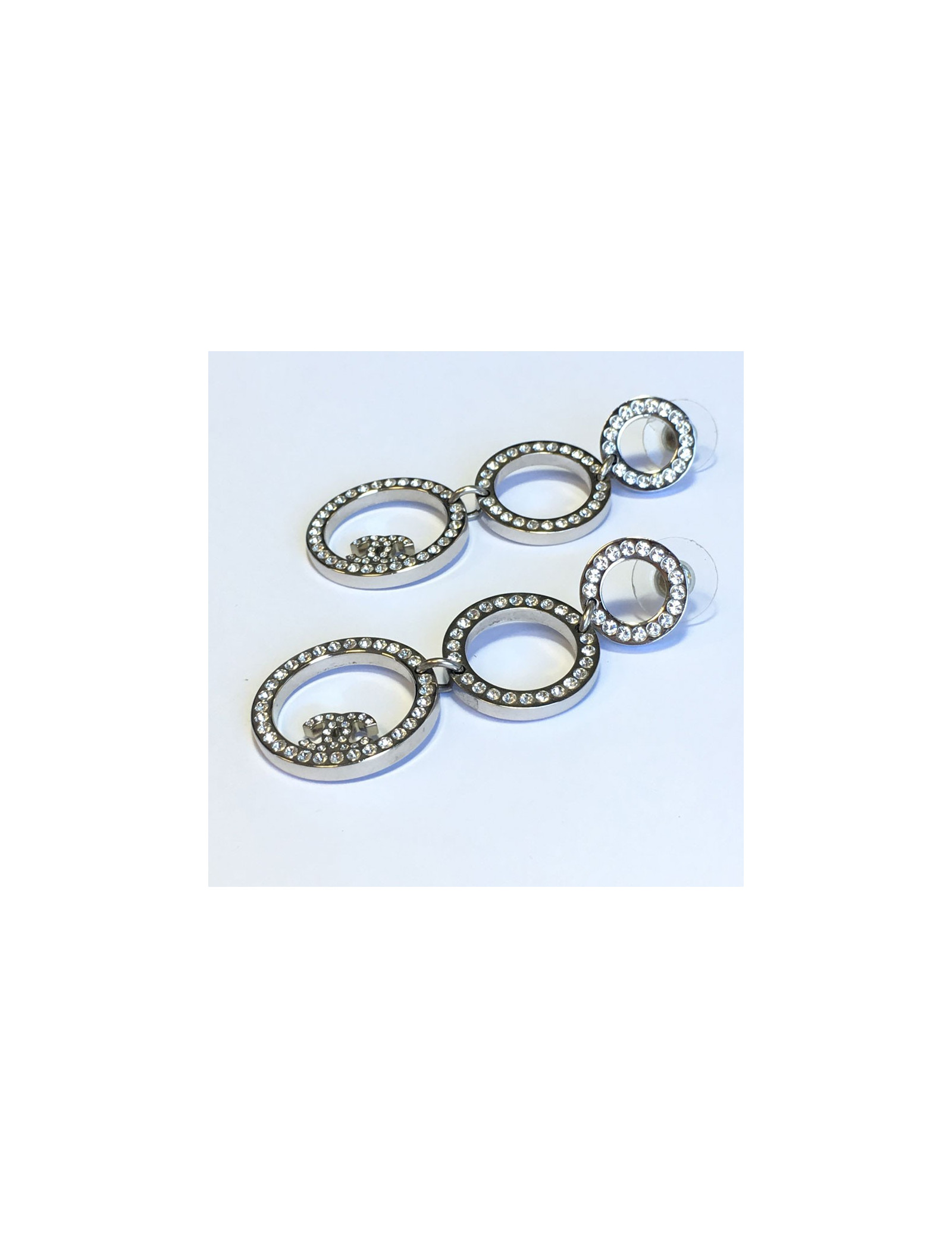 Boucles d'oreille CHANEL pendantes en métal argenté serties de strass blancs
