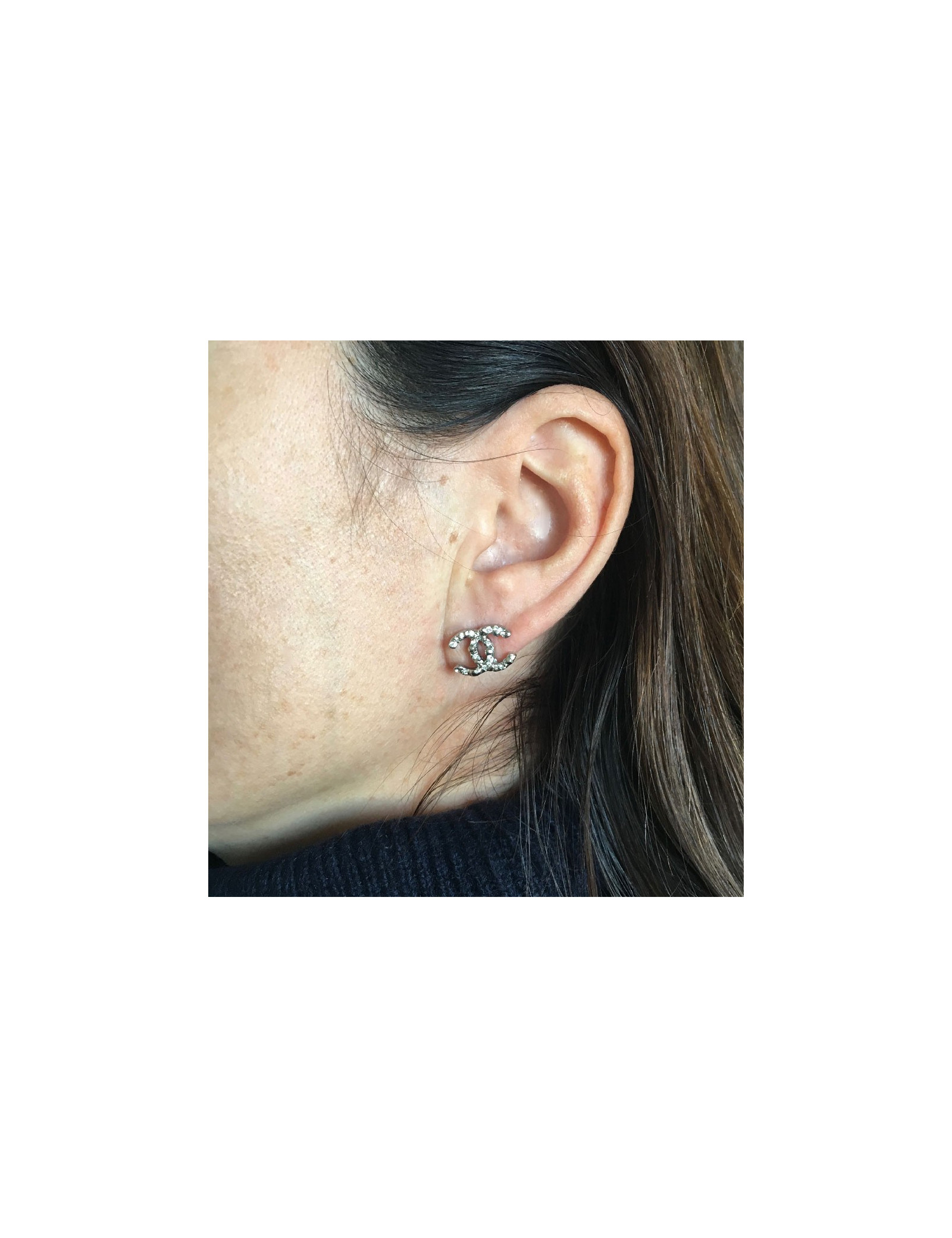 Boucles d'oreille clous Chanel CC argenté et strass