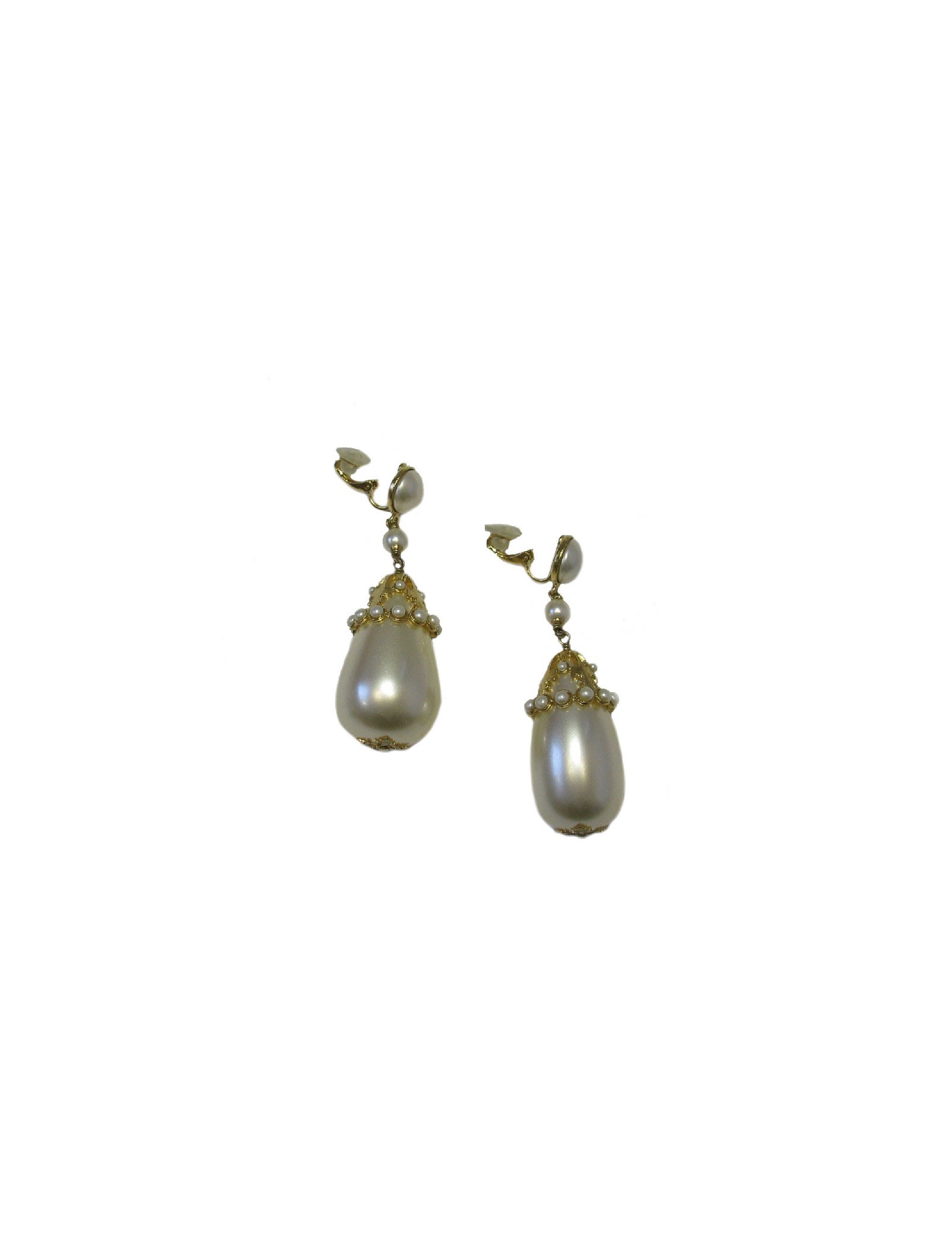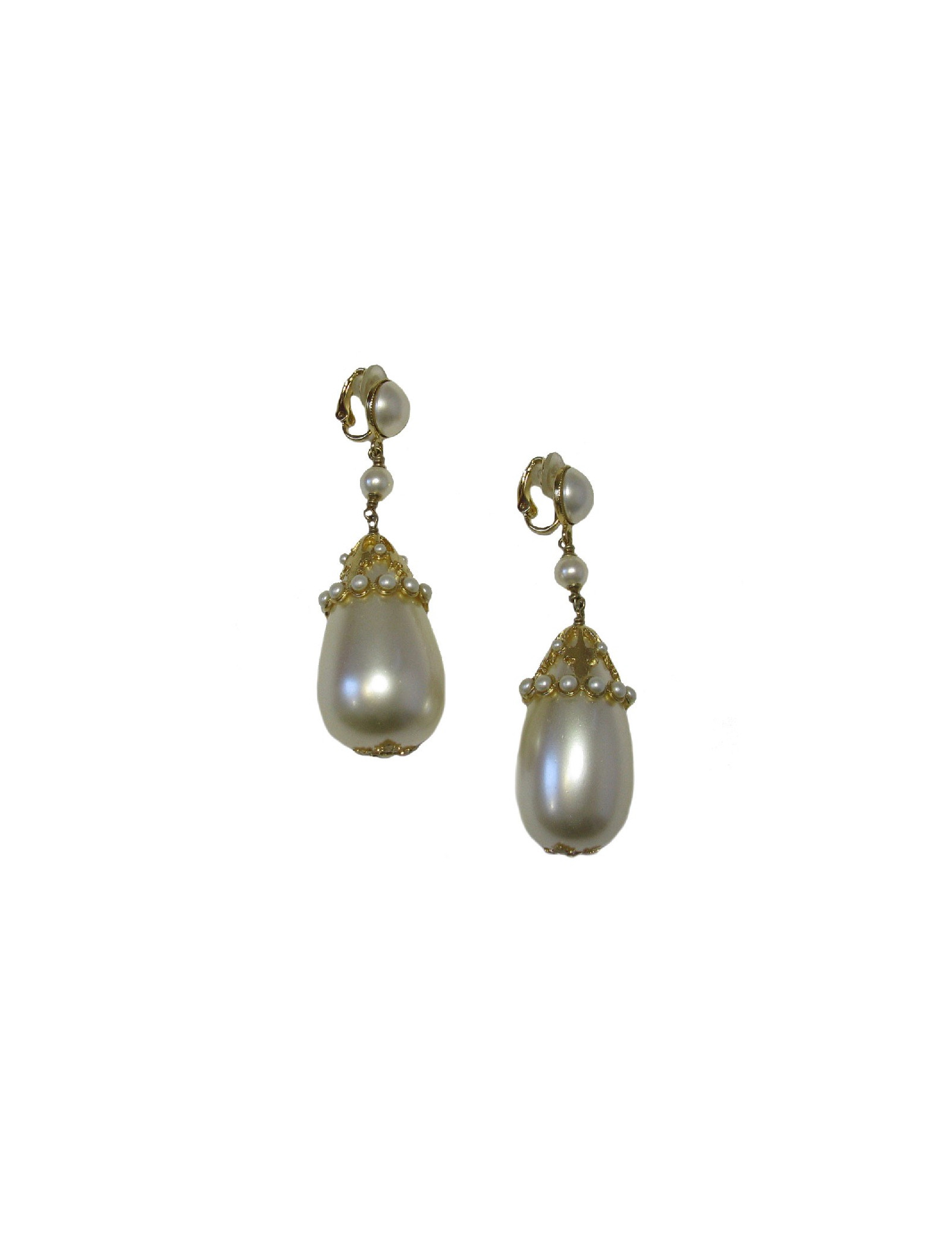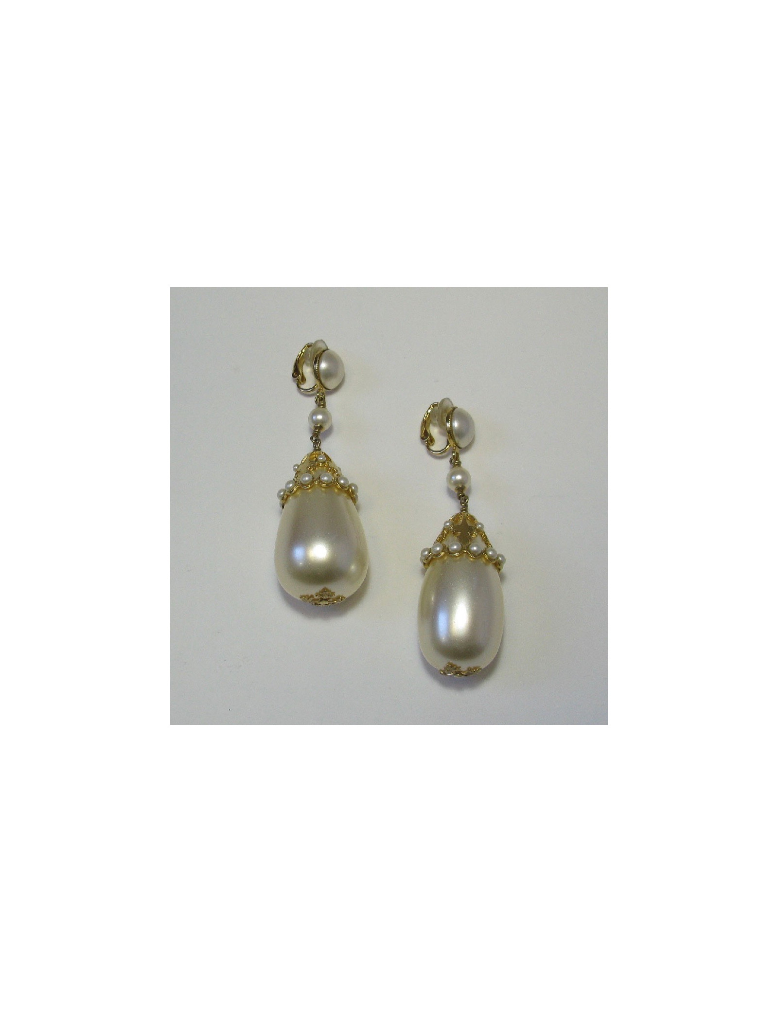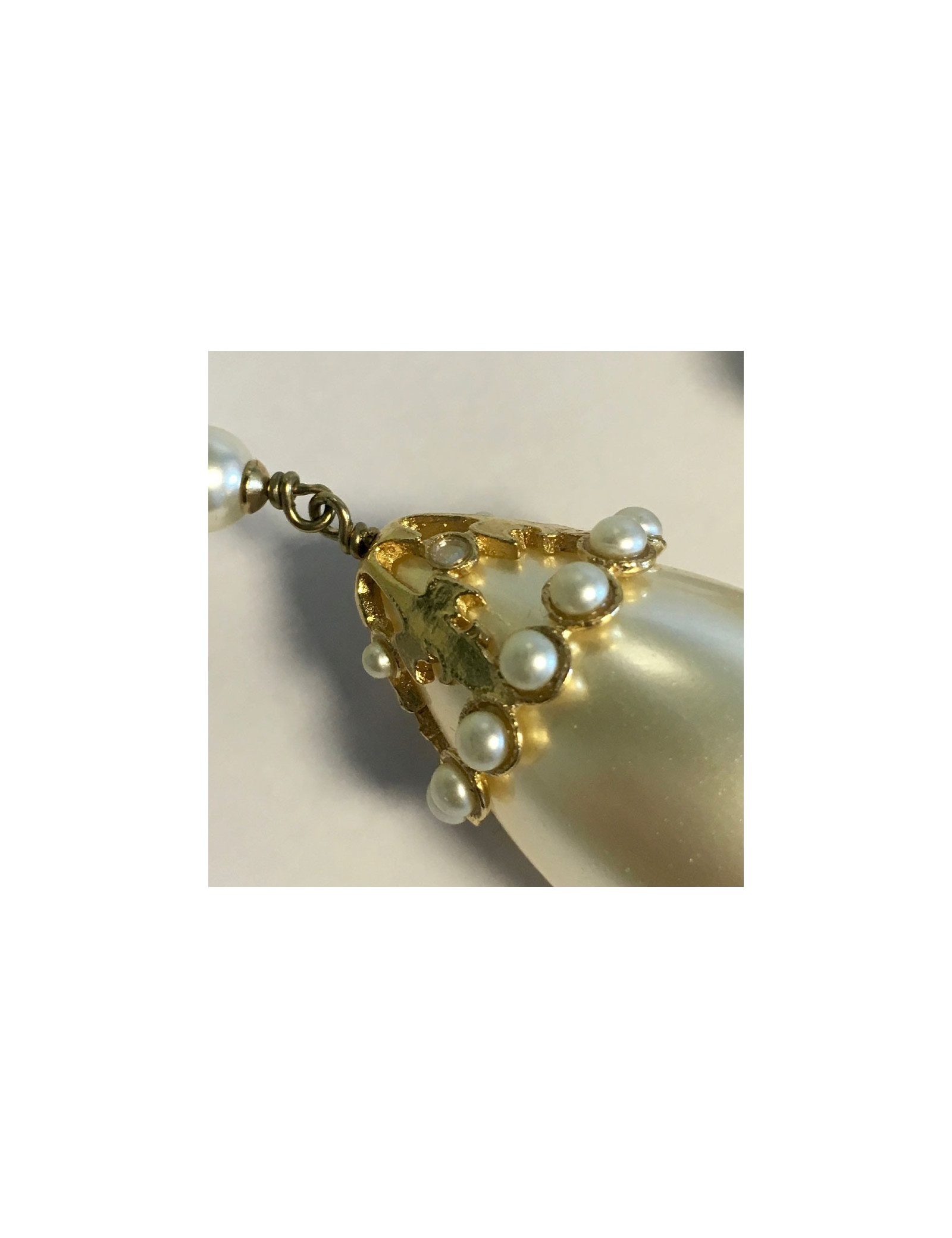 Imposantes boucles d'oreille clips pendants Chanel en métal doré et perles nacrées.
