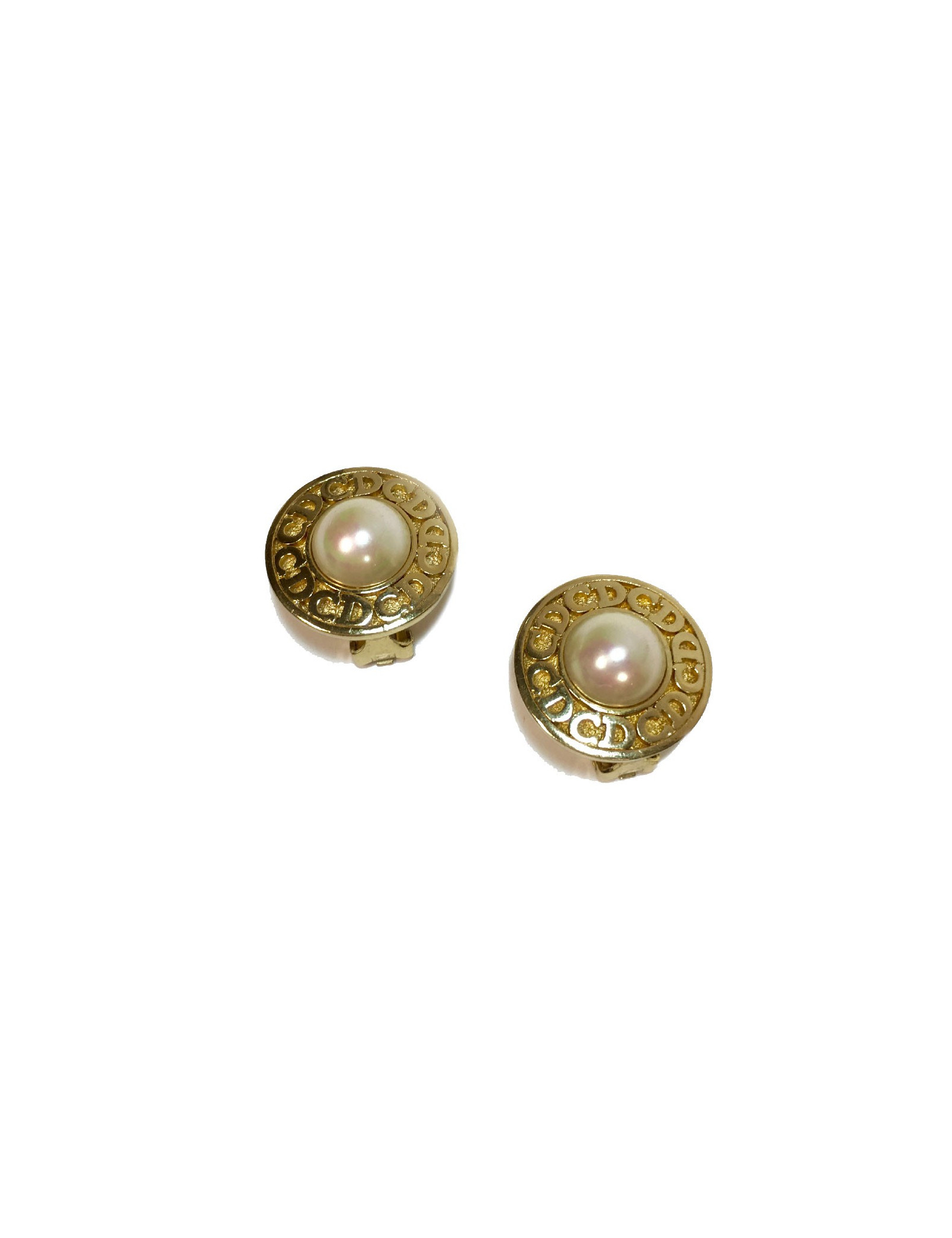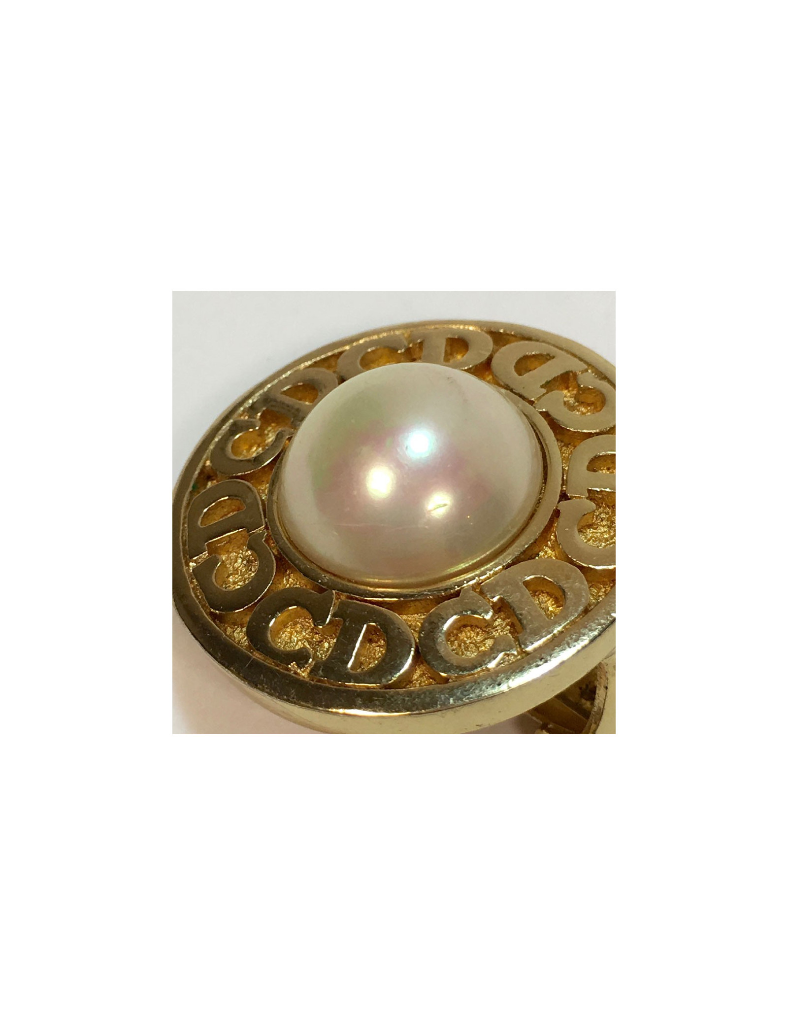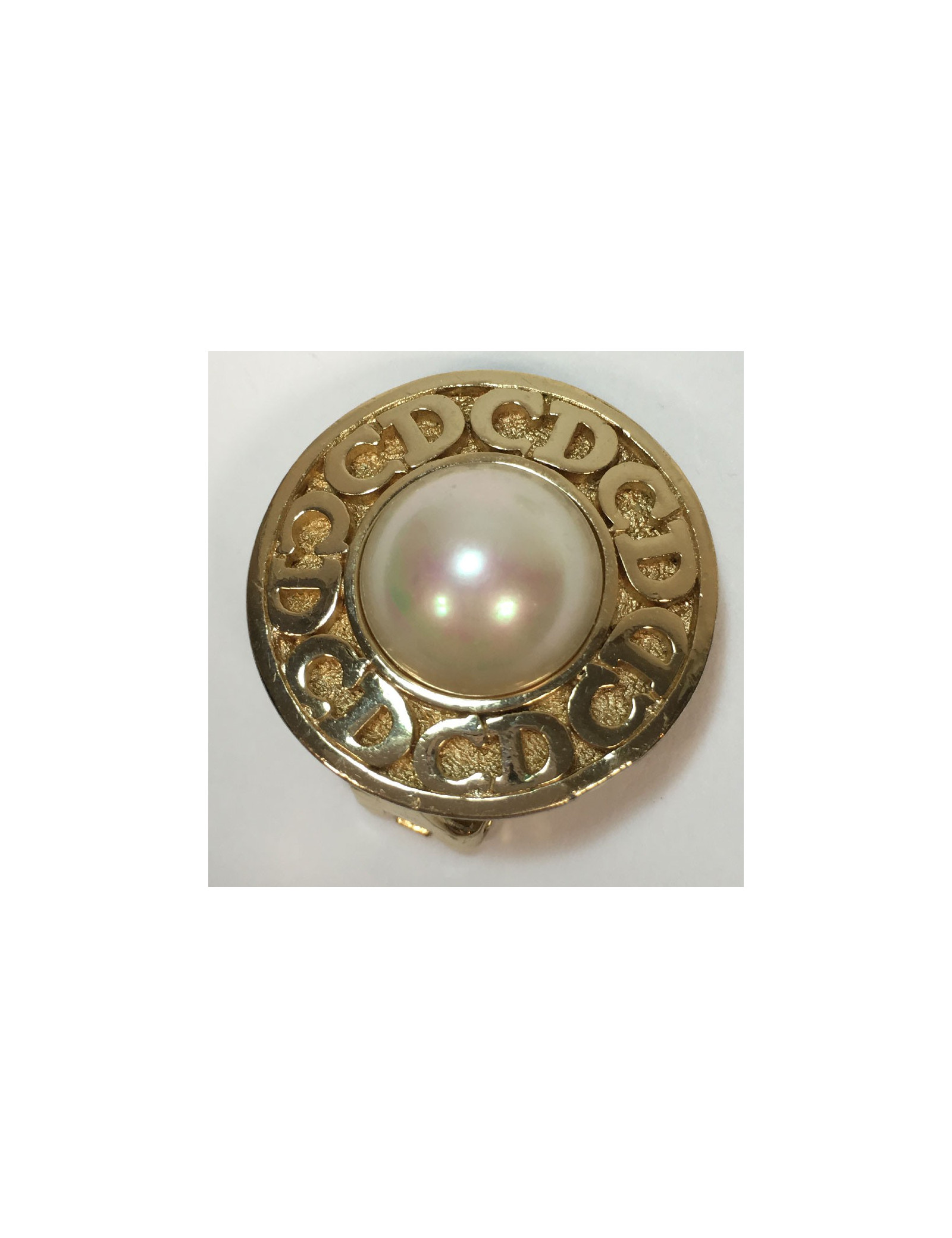 Boucles d'oreille clips Christian Dior en métal doré et perle nacrée. Initiales CD sur le tour de la boucle d'oreille.