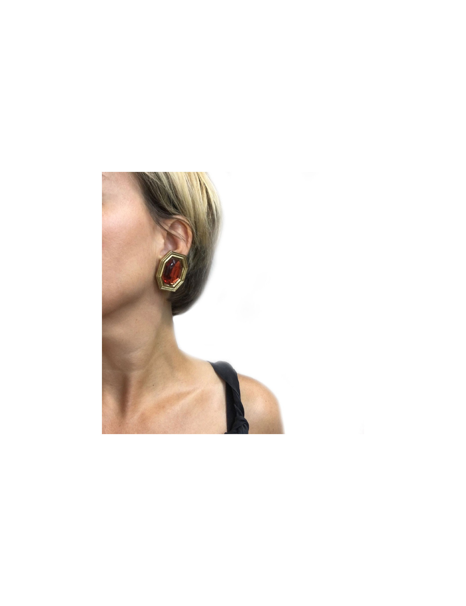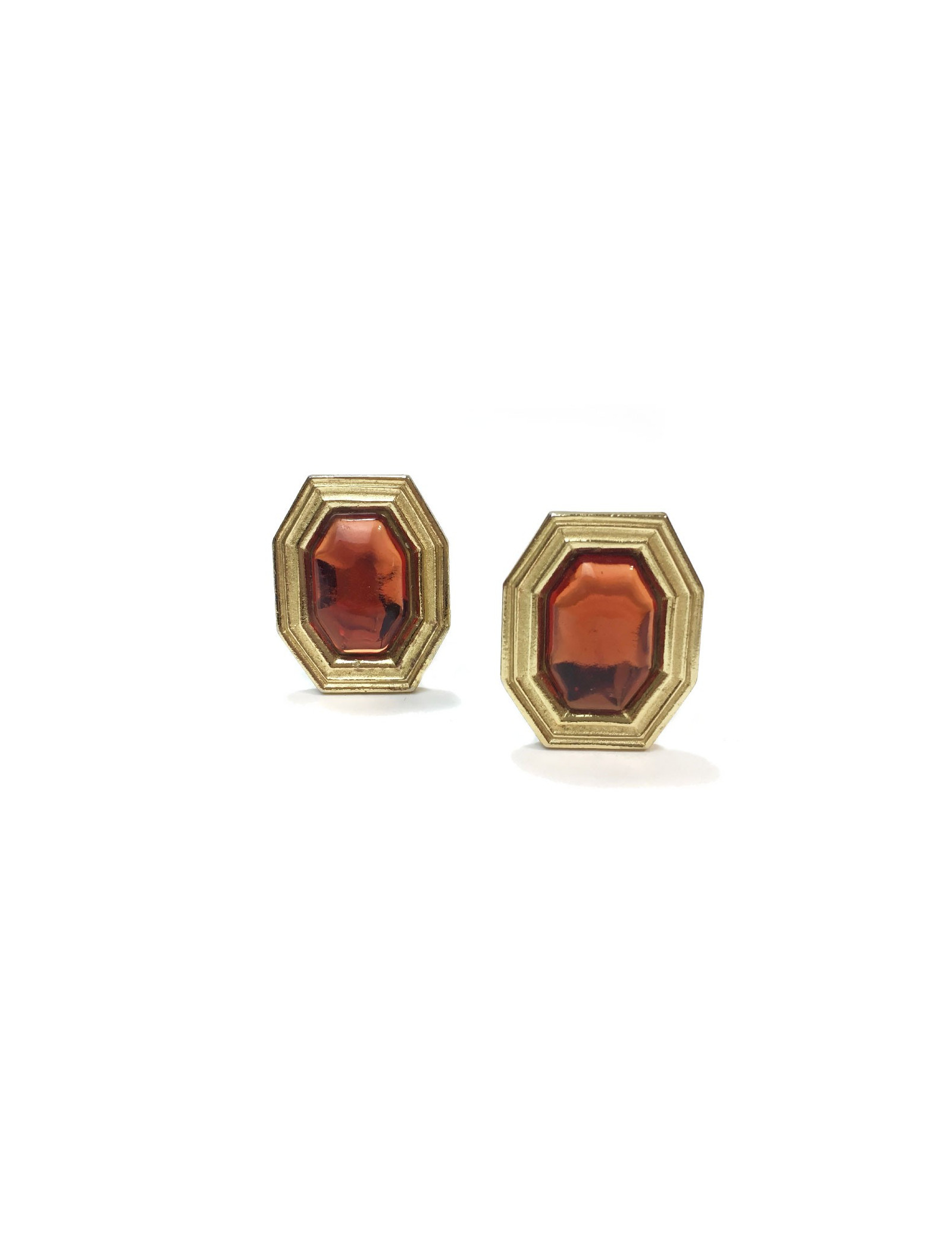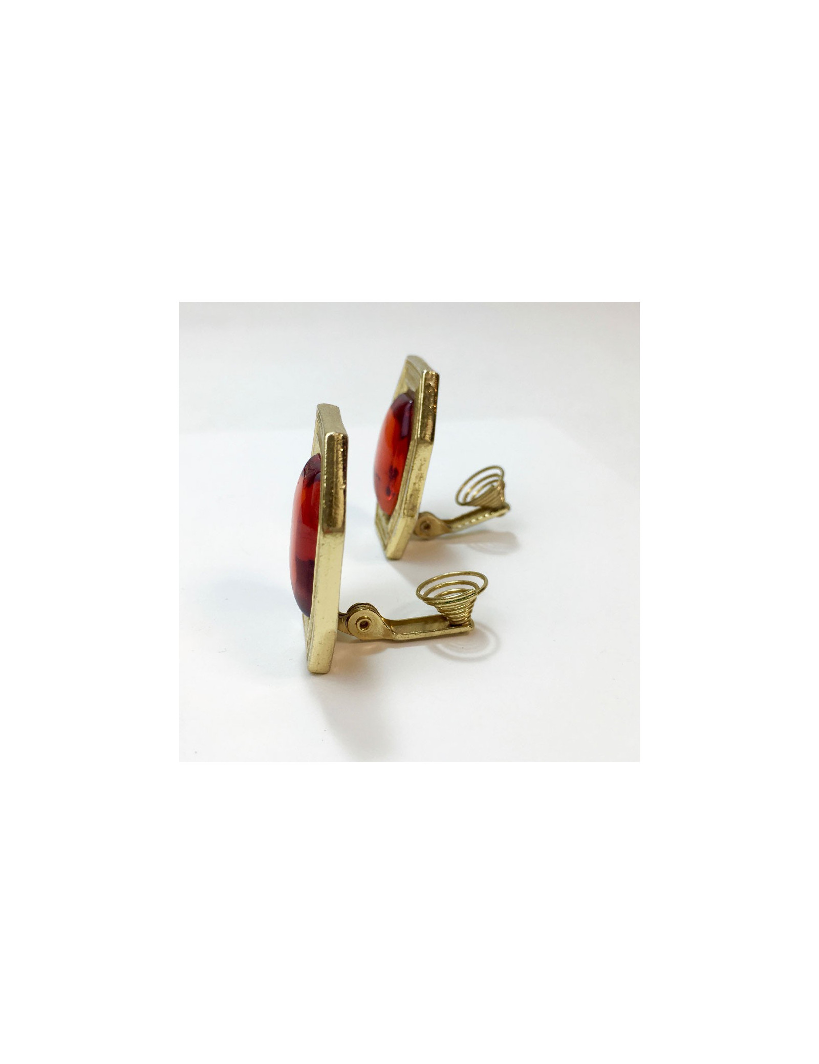 Boucles d'oreille clips YSL Yves Saint Laurent vintage en métal doré et résine orangée.