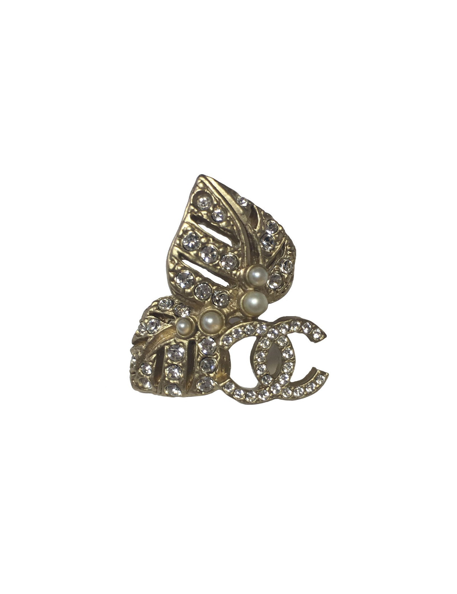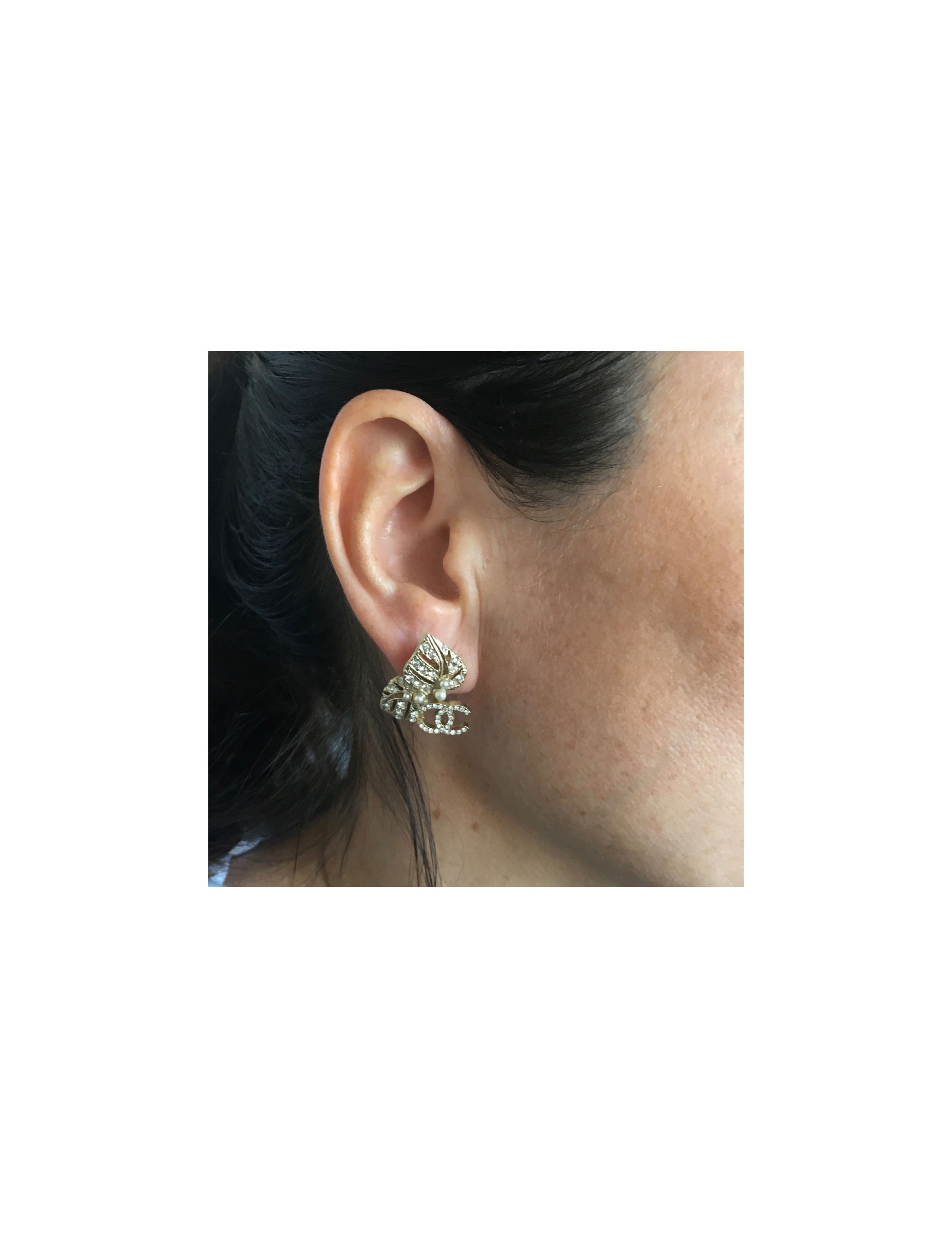 Boucles d'oreille clous Chanel feuilles et CC en métal doré mat serties de strass blancs et de petites perles nacrées.