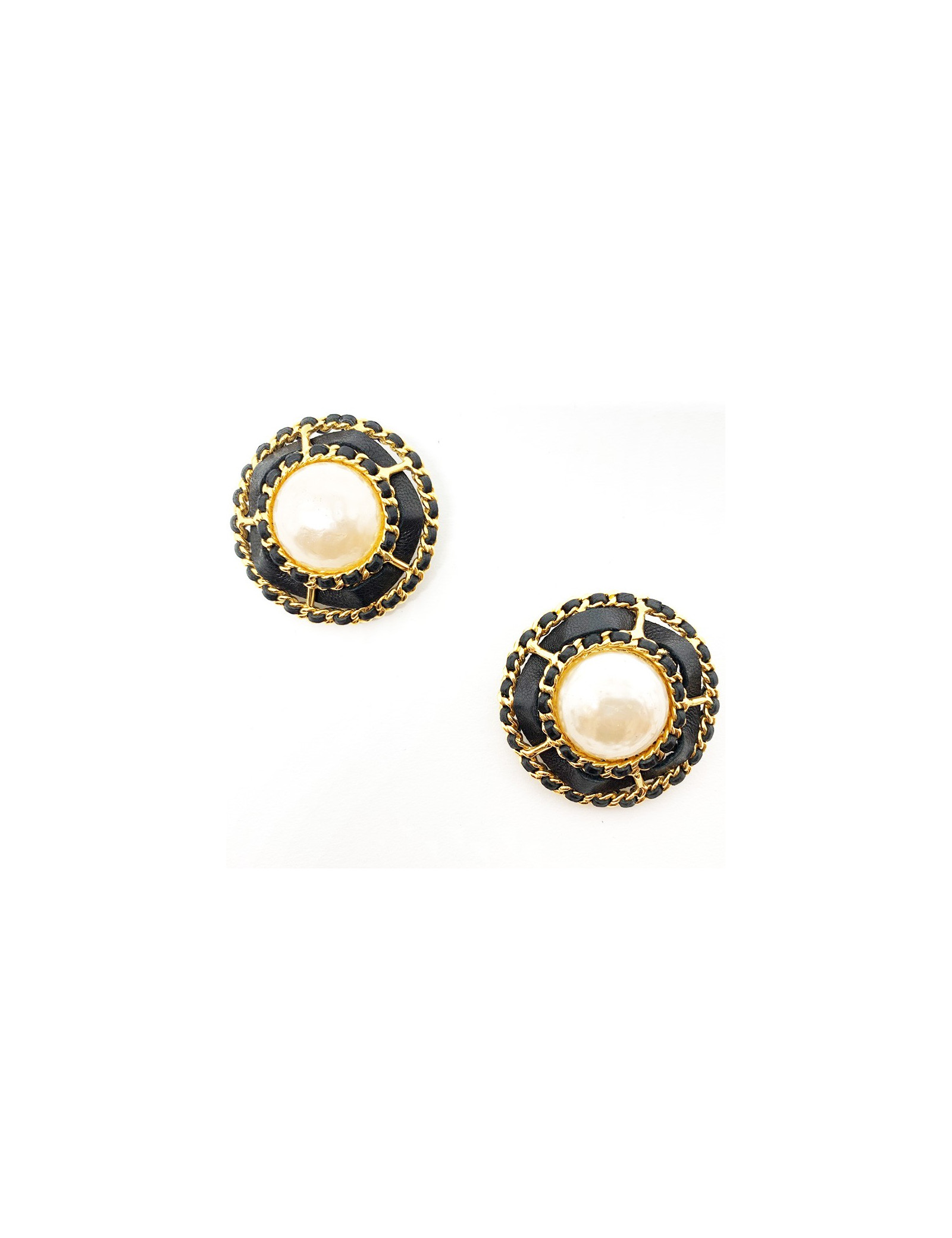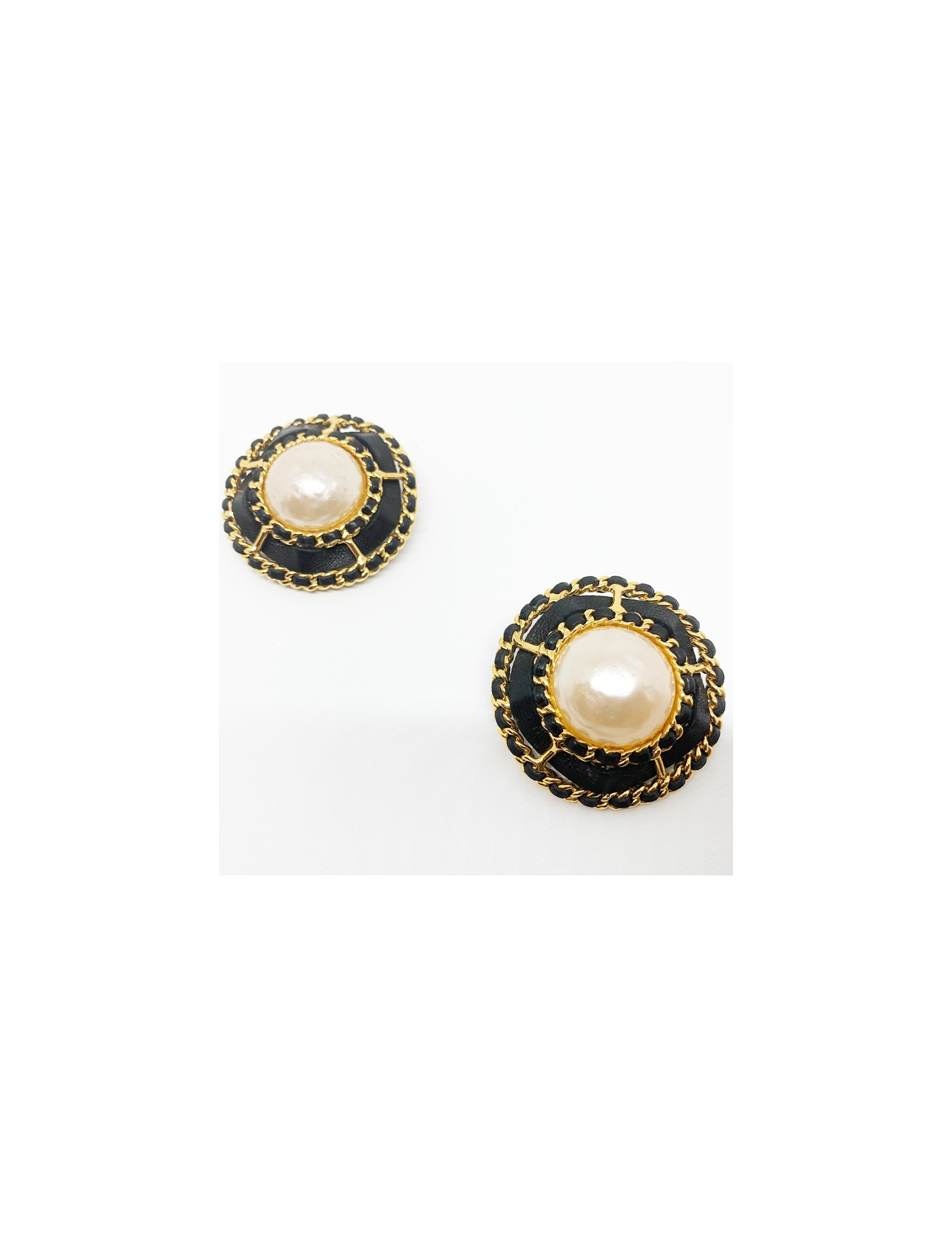 Ultra vintage : Bijoux collector. Les boucles d'oreille sont de la Maison CHANEL. Elles sont vintage et représentent l'essence même de la marque. Une boule nacrée encerclée du traditionnel assemblage chaîne dorée et cuir noir. Pour un look COCO CHANEL intemporel et en toutes occasions.