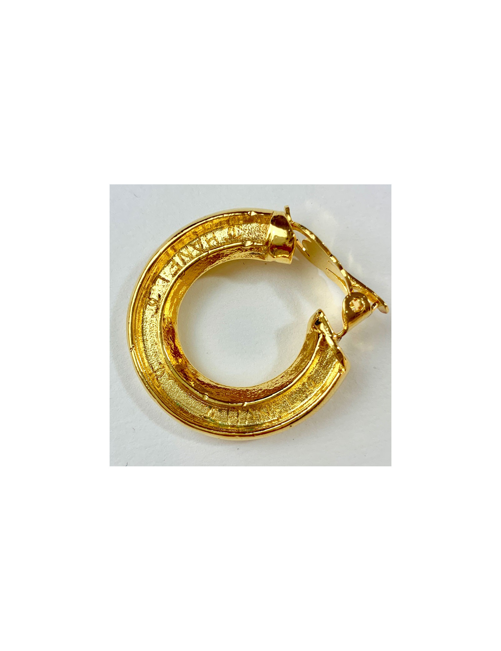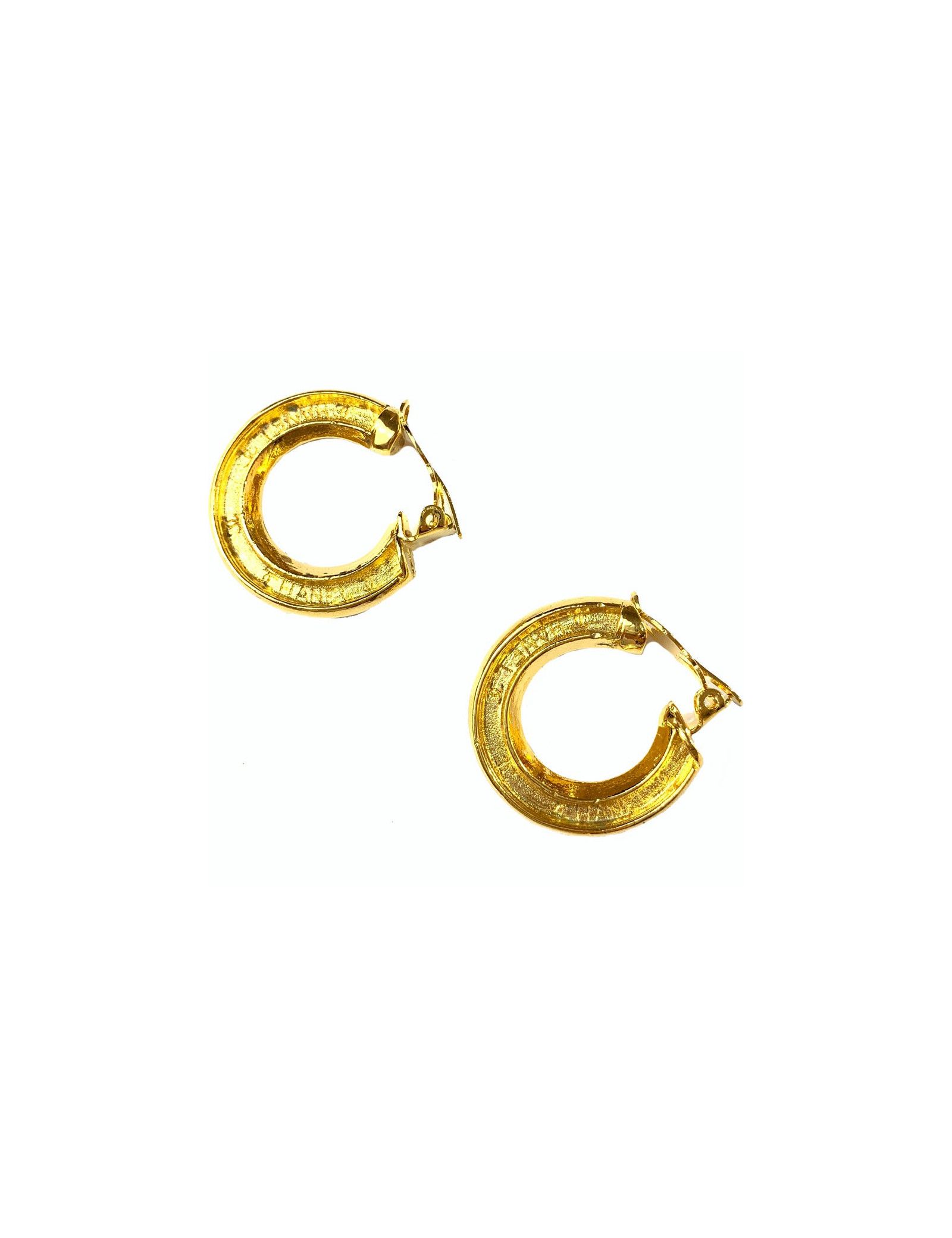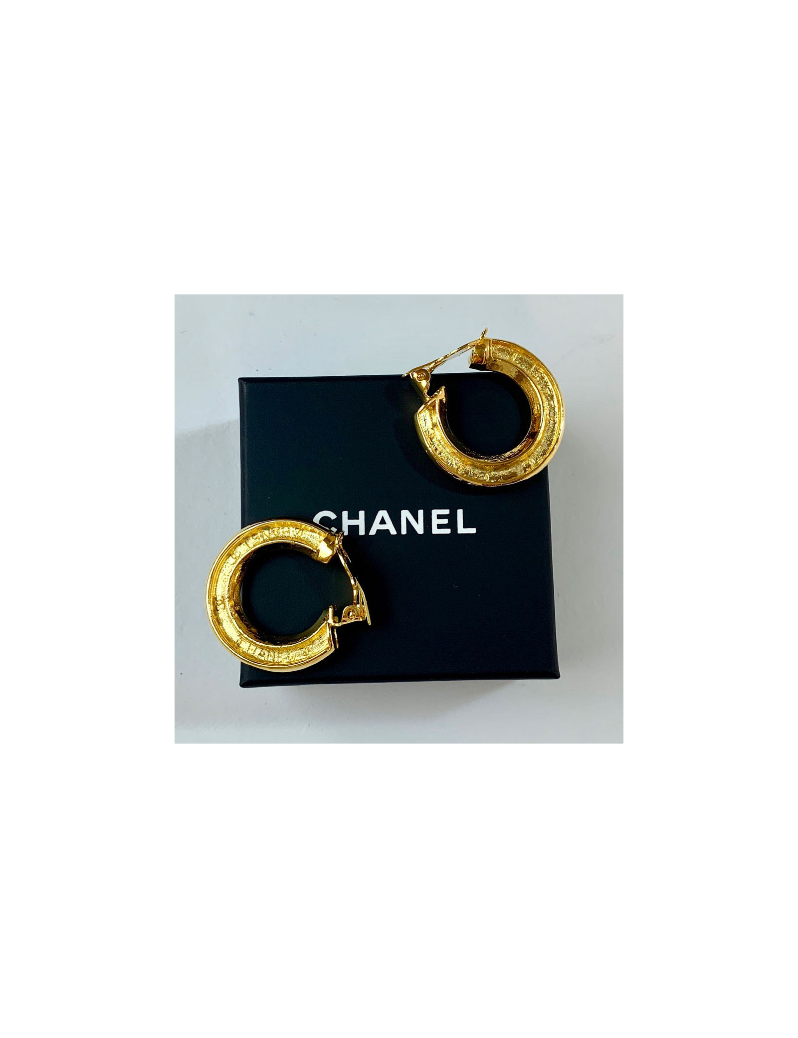 Belles boucles d'oreille clip CHANEL créoles en métal doré. Bijou vintage. Elles sont creuses et portent l'inscription CHANEL ainsi que le logo de la maison tout autour.