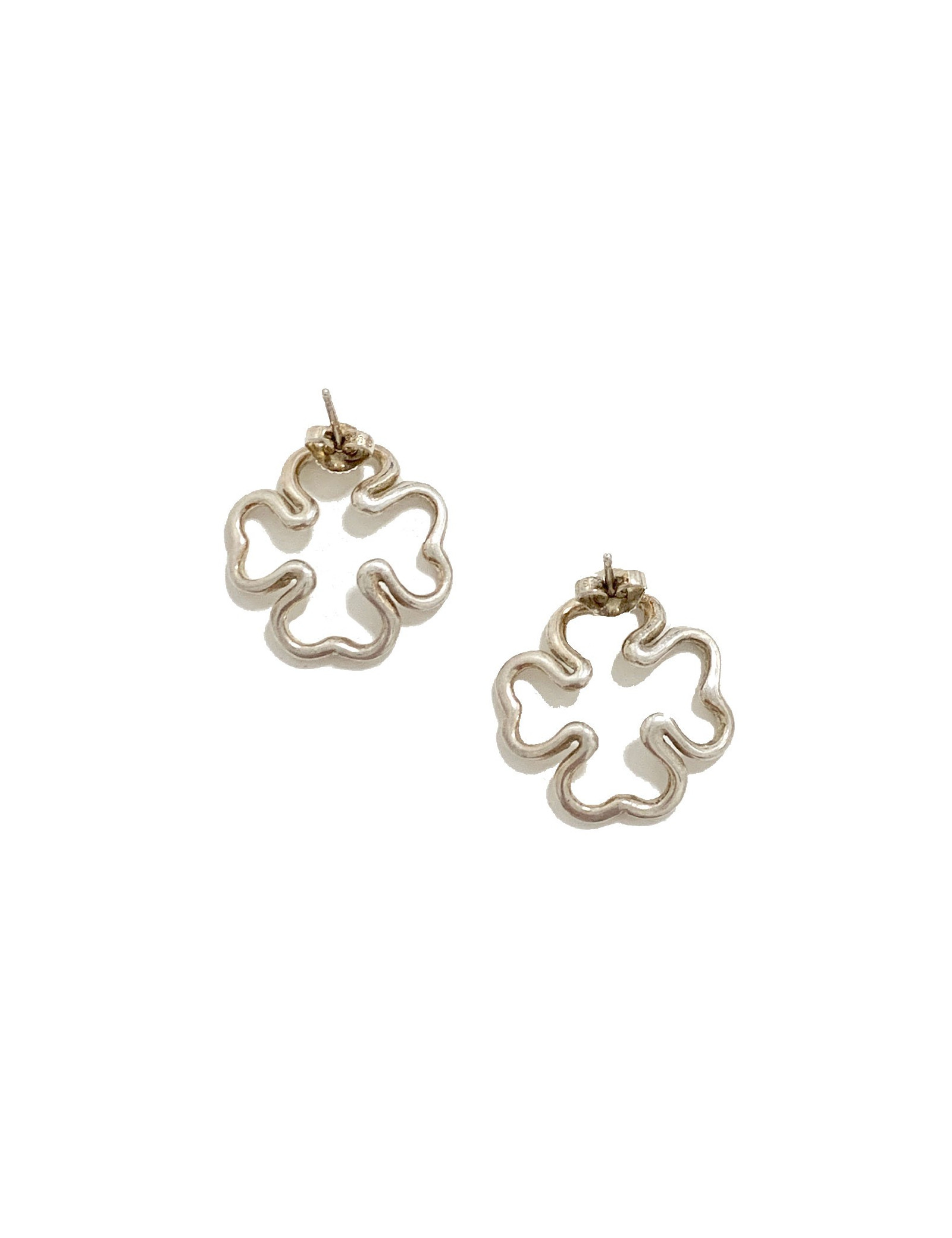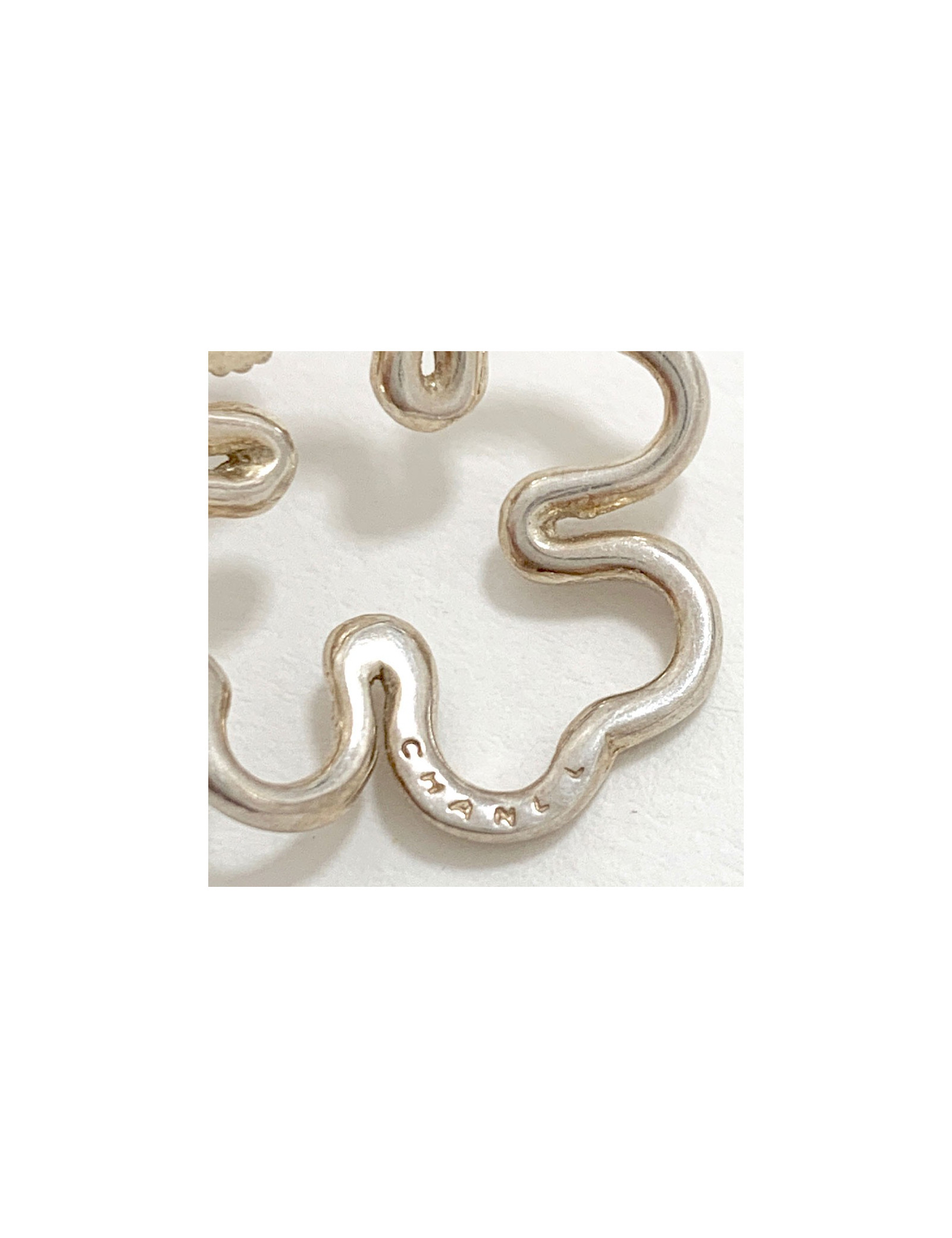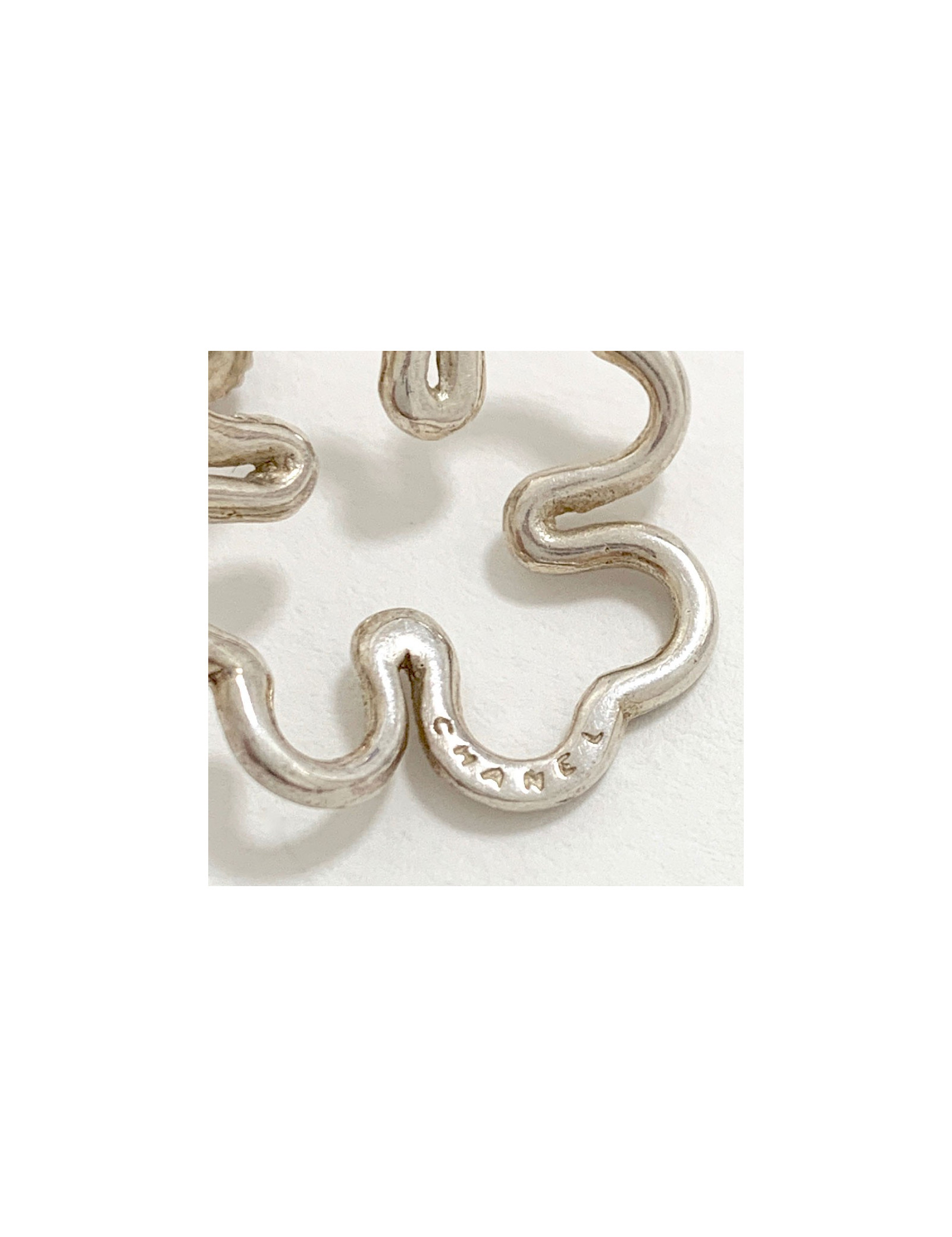 Jolie paire de boucle d'oreille CHANEL argent. En forme de trèfles, elles sont fines et légères à porter. Le poinçon Argent se situe sur le fermoir. La marque CHANEL est gravée à la main sur chaque boucle sur le devant (voir photo).